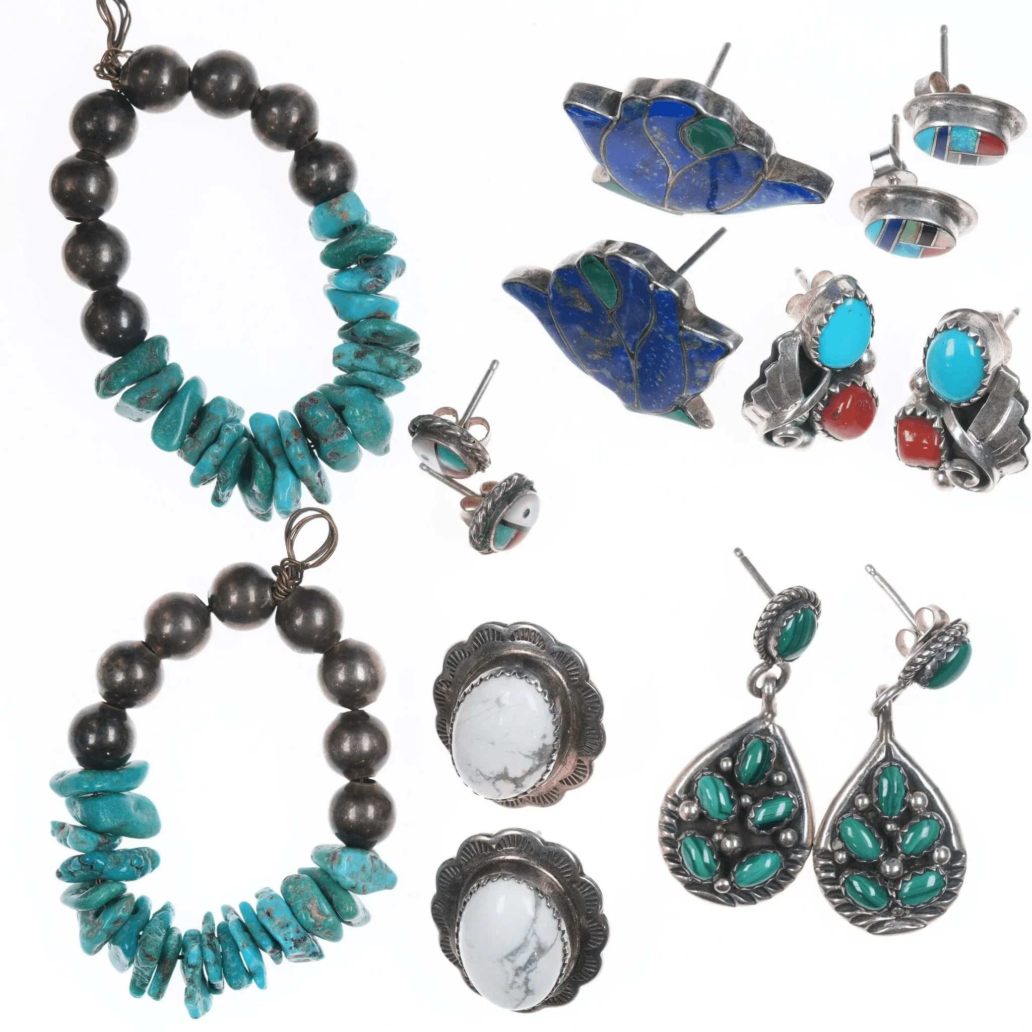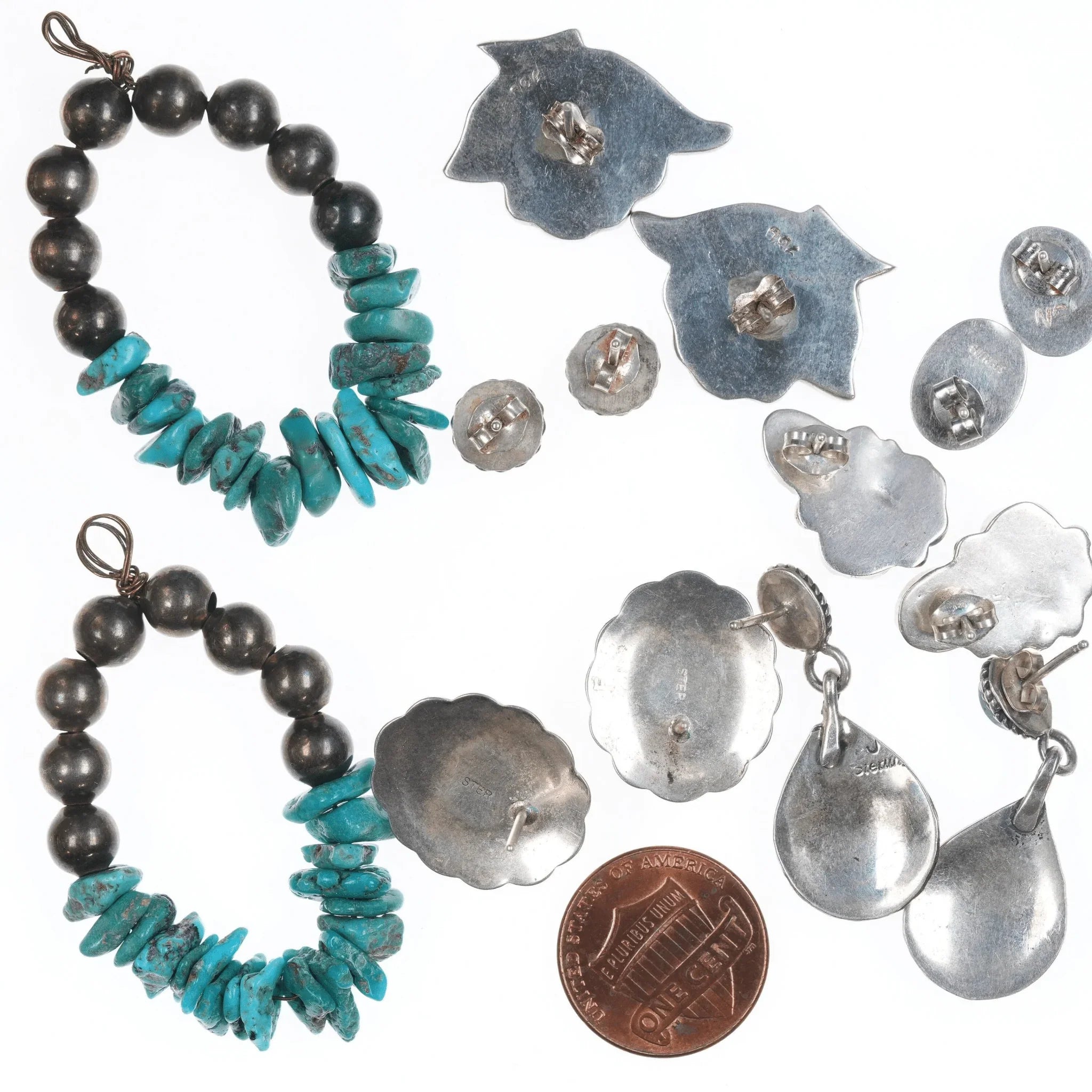 7pr Vintage Southwestern sterling silver earrings. Most if not all from the 4th<br>quarter of the 20th century, most Native American made,<br>some possibly not. Some missing backs. 38.6 grams total.