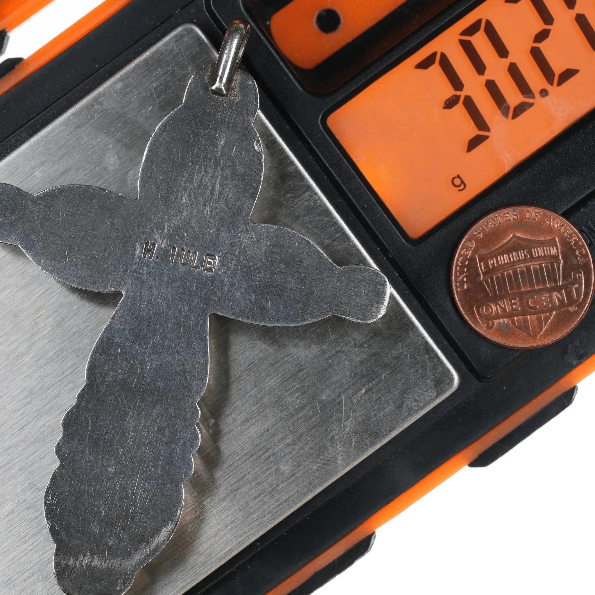 Horace Iule Zuni (1901-1978) Large silver and turquoise cross 3 1/8" x 2.25" with bail. .25" old style bail that can be opened and made larger or reduced. Circa mid 20th century. <br><br>Zuni Pueblo artist Horace Iule learned silversmithing from his father and eventually became an expert of the casting method. He was one of the first from Zuni Pueblo to create the Knifewing God in silver. Horace began working as a silversmith in the 1930s after returning from school in Phoenix where he had studied blacksmithing.<br><br>Horace Iule (1901-1978) Aiule was a third-generation silversmith. His grandfather, a man known as Sneezing Man, was identified by John Adair in his book The Navajo and Pueblo Silversmiths as one of the first silversmiths at Zuni Pueblo.<br><br>Horace Iule also taught jewelry making at Zuni Day School, teaching and influencing a whole generation of Zuni smiths. Horace taught his son Wilbur Iule who carries on the tradition.<br><br>Marked or unmarked as shown in pics, weight and other measurements in pics. Sorry but my jewelry is stored in a secure location and cannot be accessed for more pictures,<br>videos, or measurements until sold. If you look at pictures/description your<br>question should be answered. Thank you so much for your time and consideration! All precious metals are tested and guaranteed. A Native American jewelry piece referred to as "silver" or "ingot" is guaranteed to be at least 90% silver. Bracelets are photographed on a 6" women's wrist.
