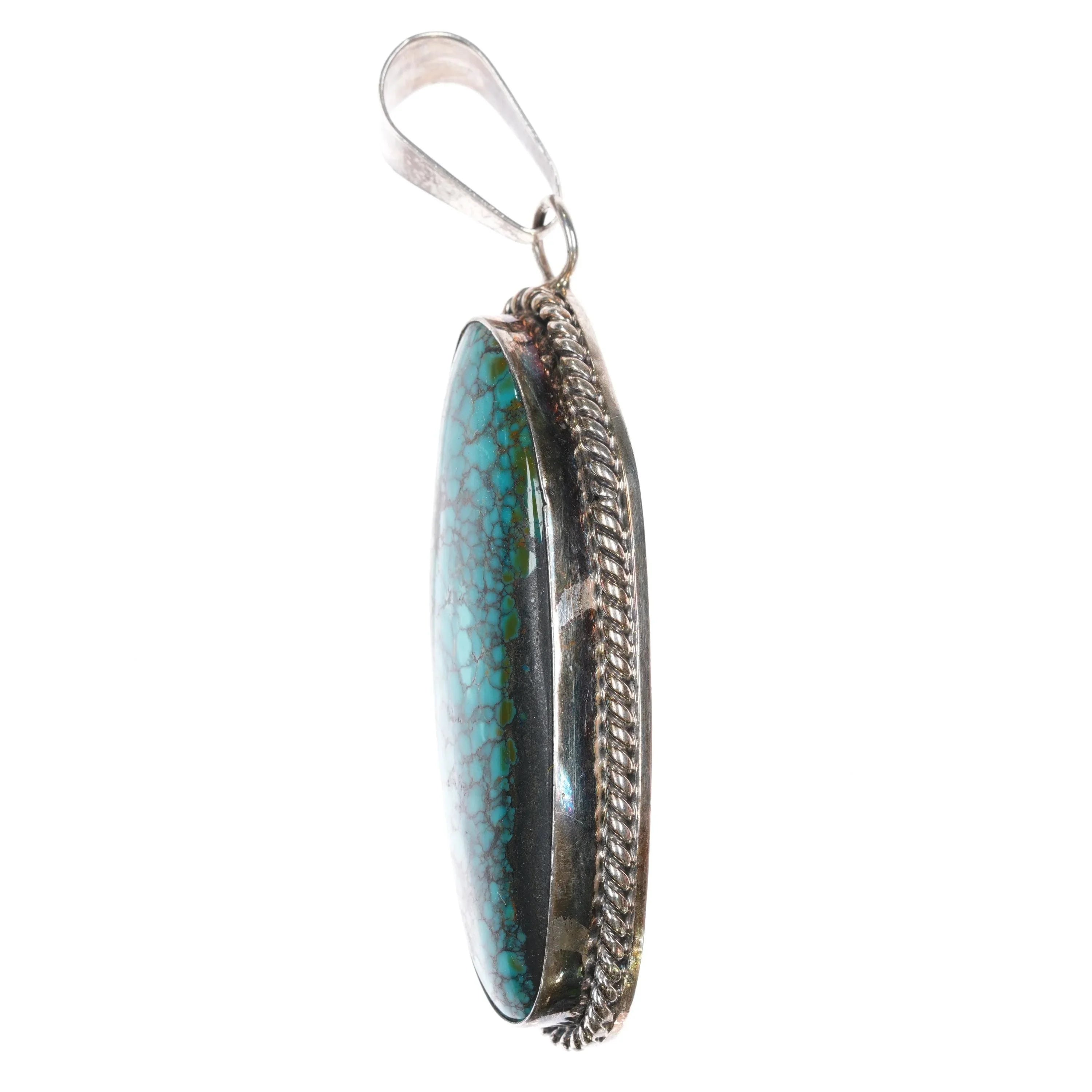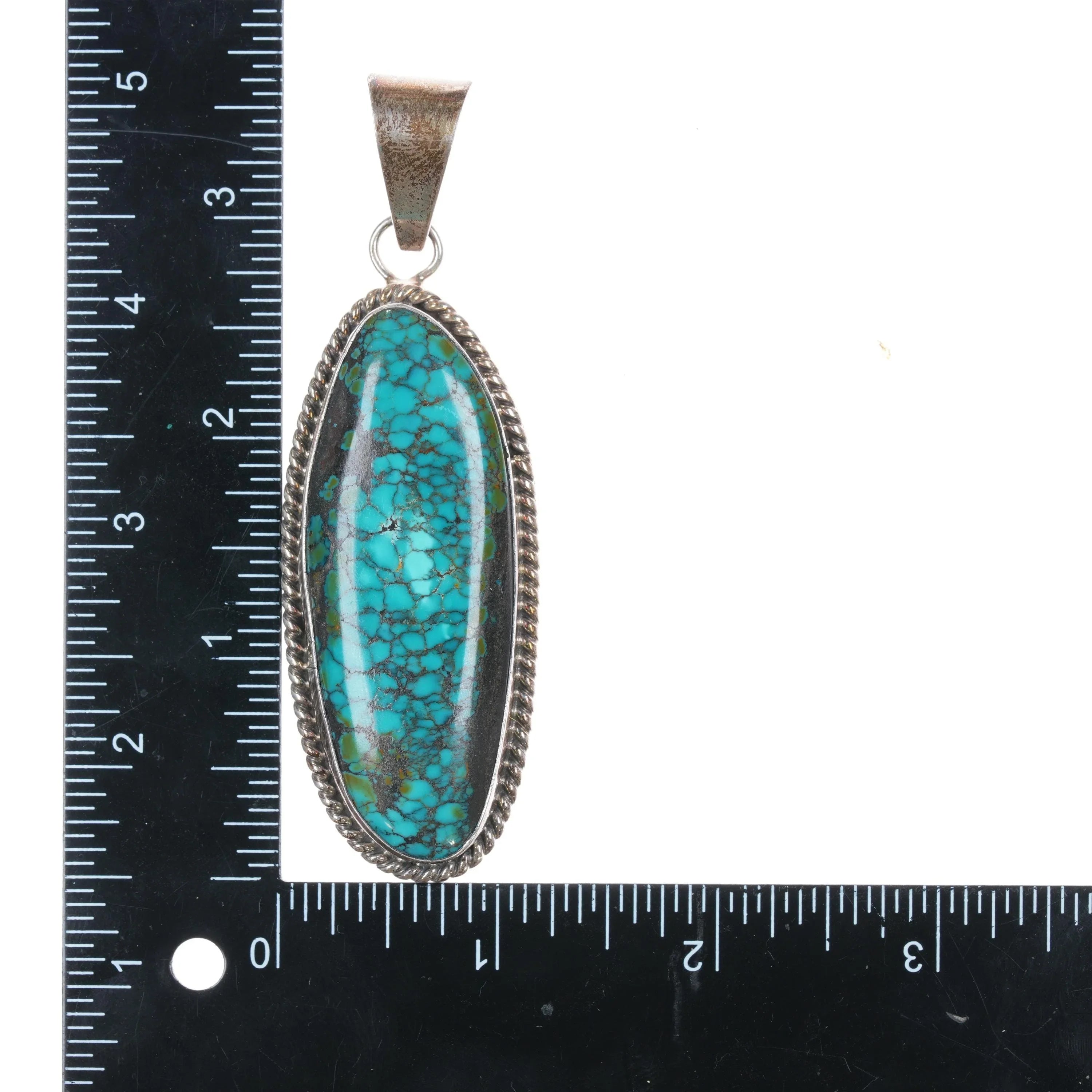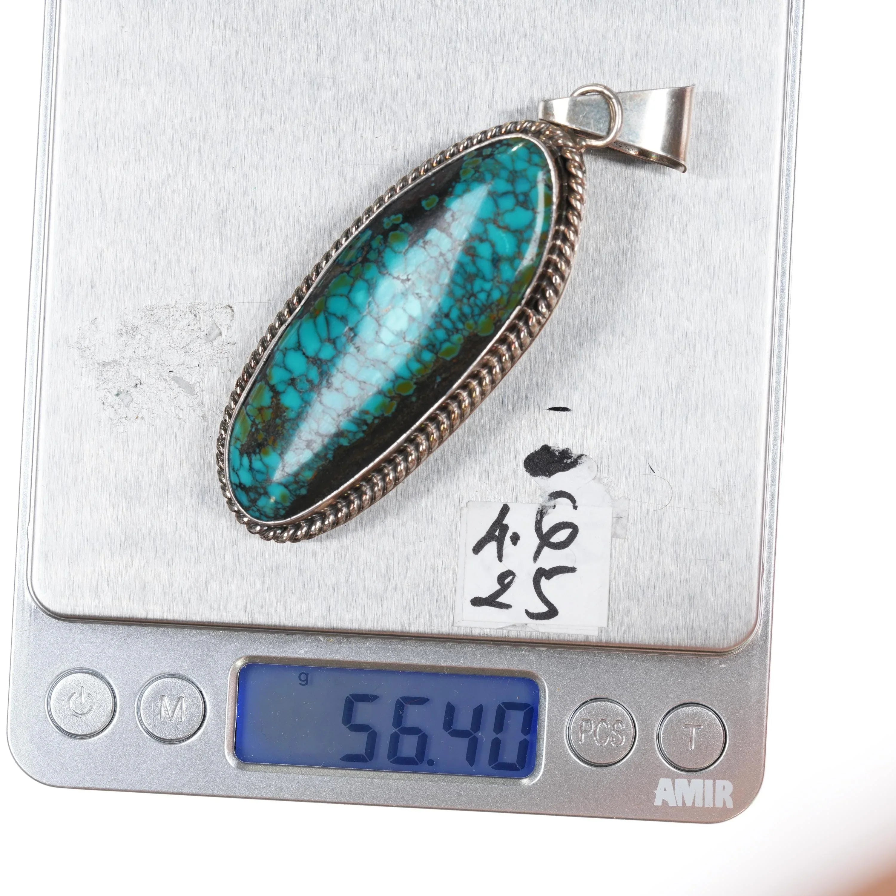 Large Navajo sterling silver and webbed turquoise pendant Bobby Johnson. Weight and measurements in pictures. Very attractive stone in this pendant, unsure of which mine it came from.