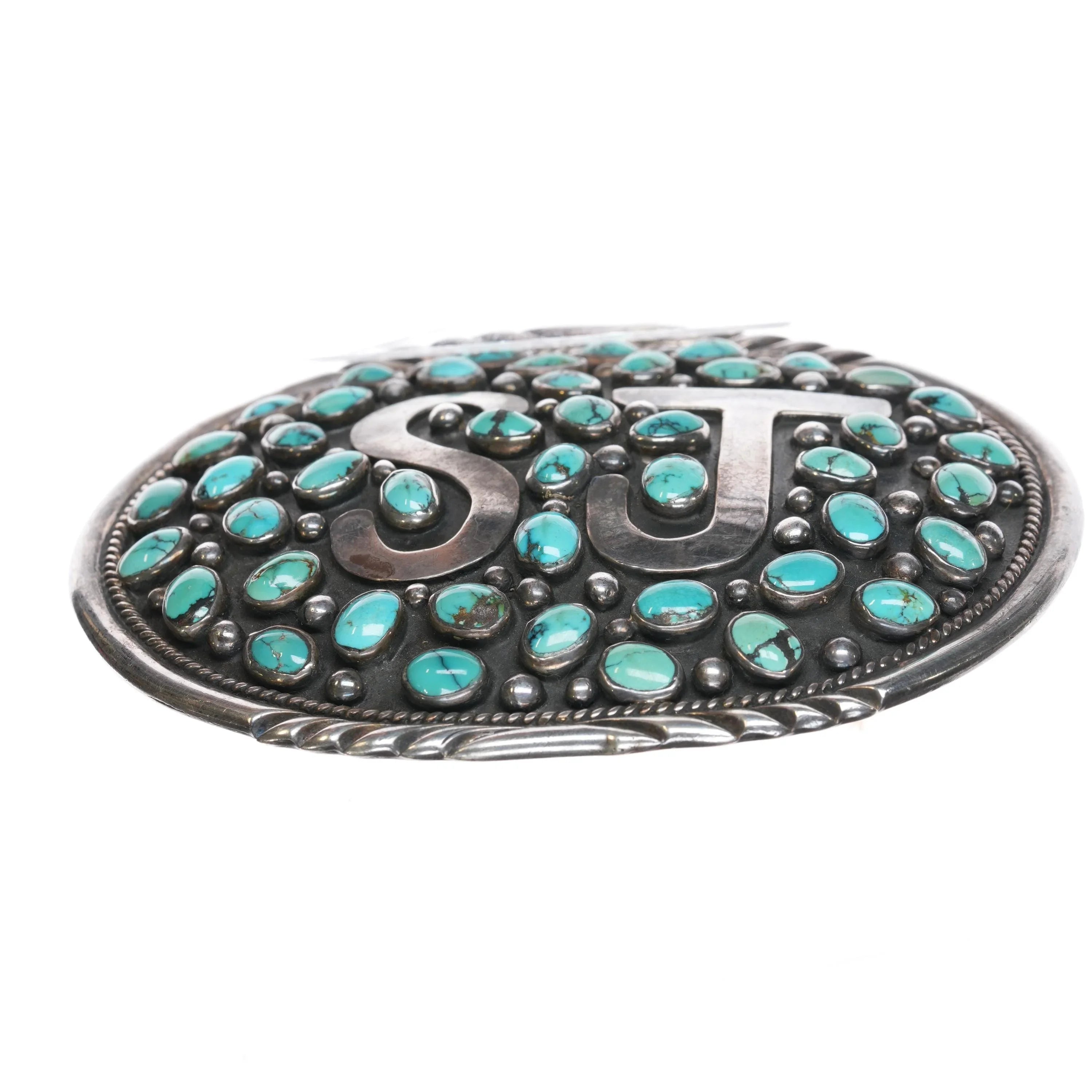Large SJ Chimney Butte Navajo sterling turquoise cluster belt buckle