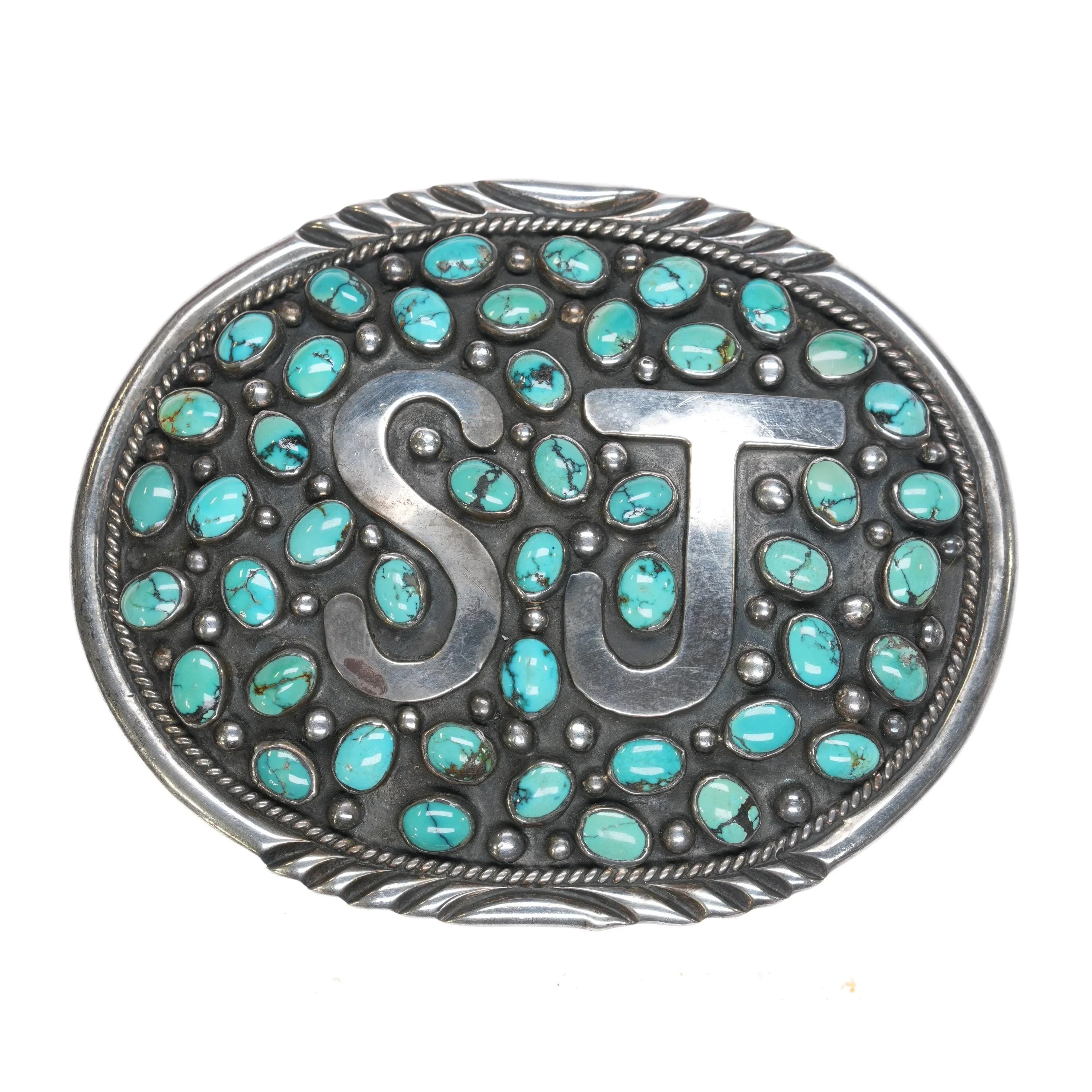 SJ Chimney Butte Navajo sterling turquoise cluster belt buckle. Solid sterling silver with weight and other measurements in the pictures. Fully functional vintage condition with minimal wear.