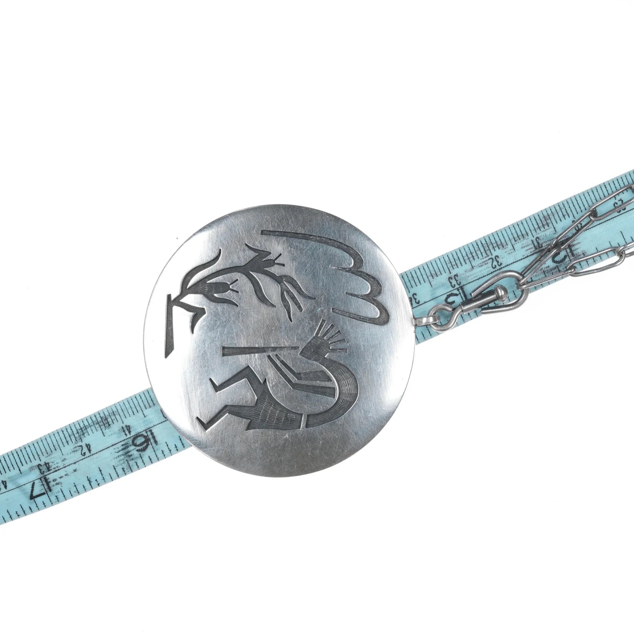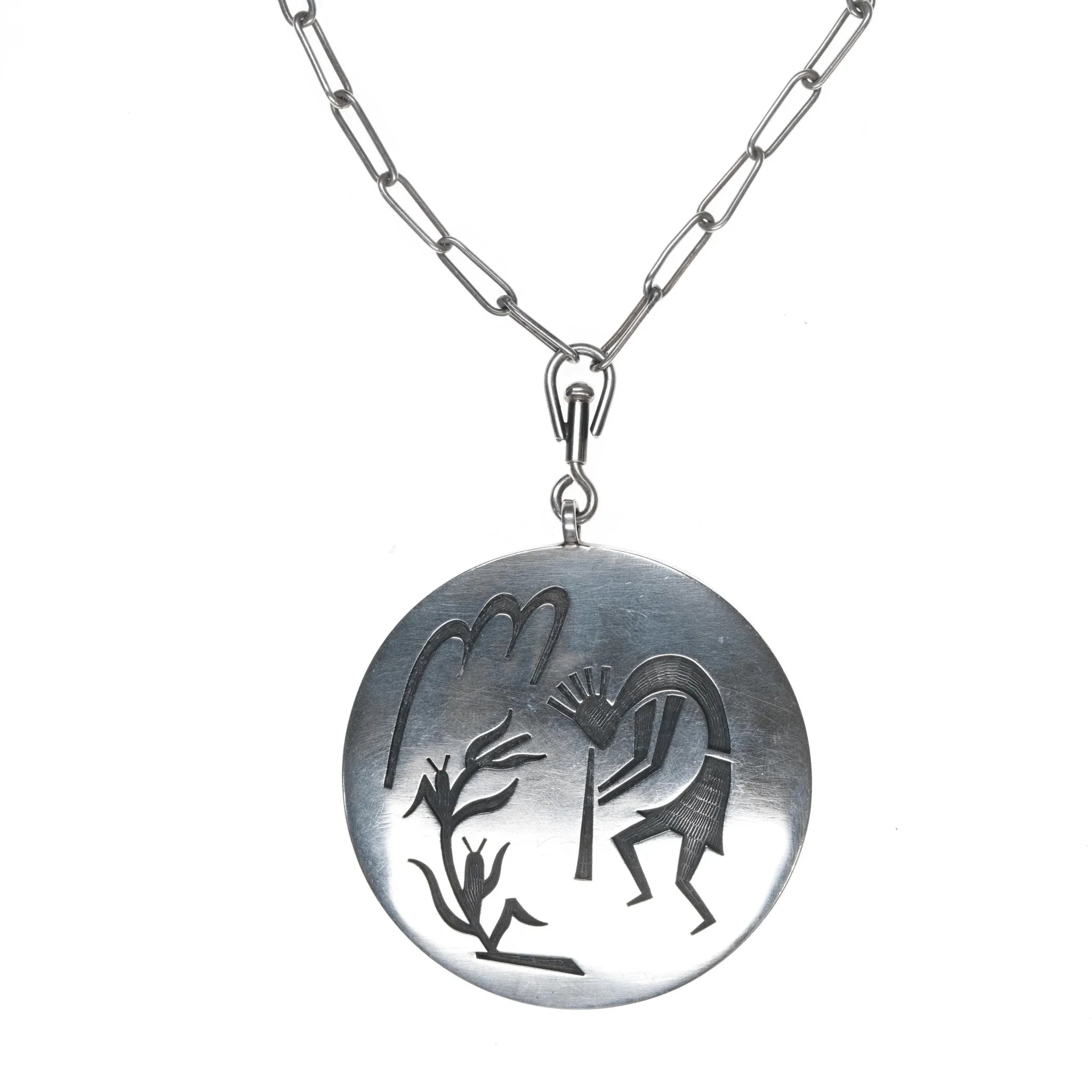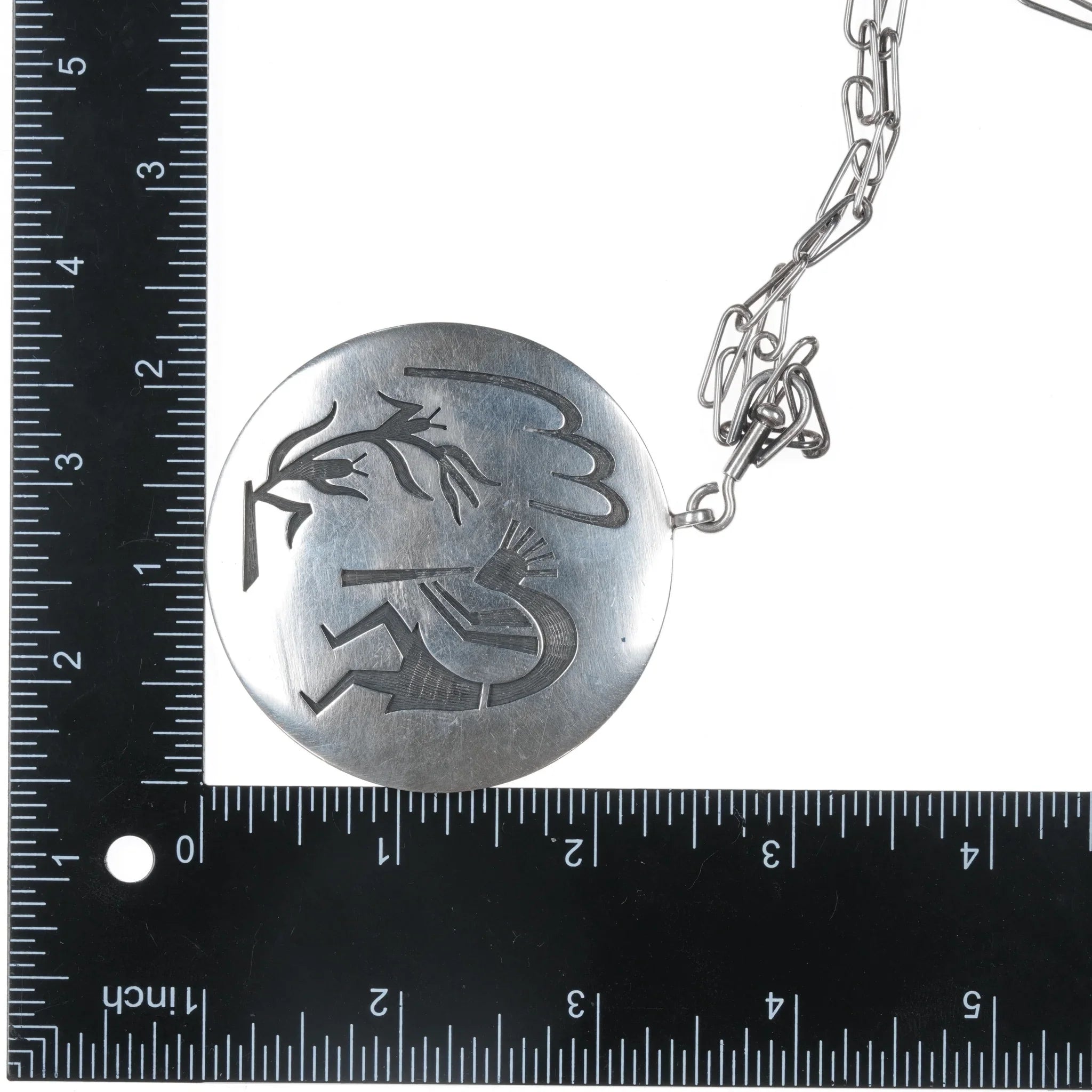 Large Vintage Hopi Overlay Double sided spinner pendant/necklace. Very large and heavy pendant. Extremely high quality work on both the necklace and the pendant. Necklace links are soldered to the spinner bail of the pendant, so both likely made by the same silversmith. No apparent markings. 26" necklace