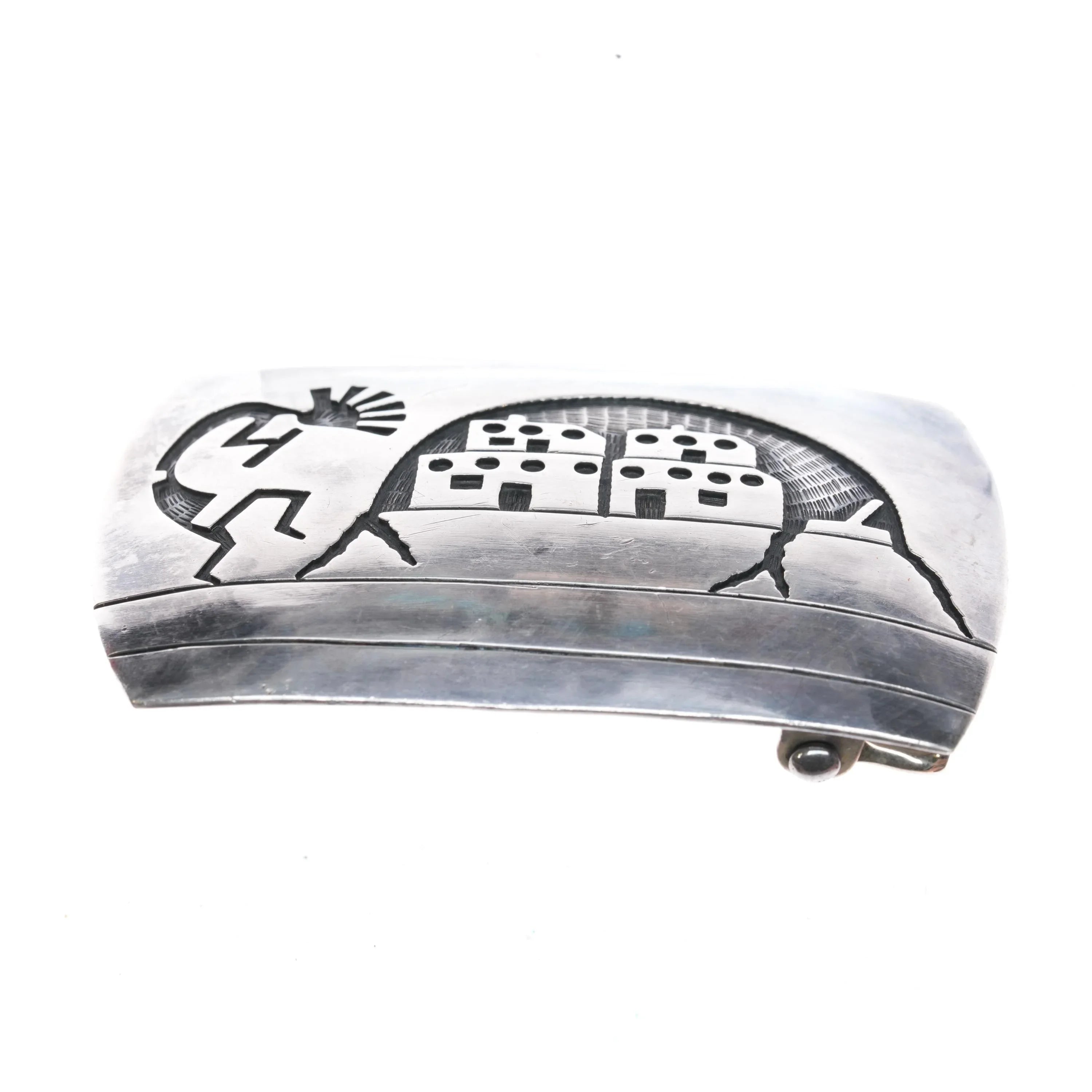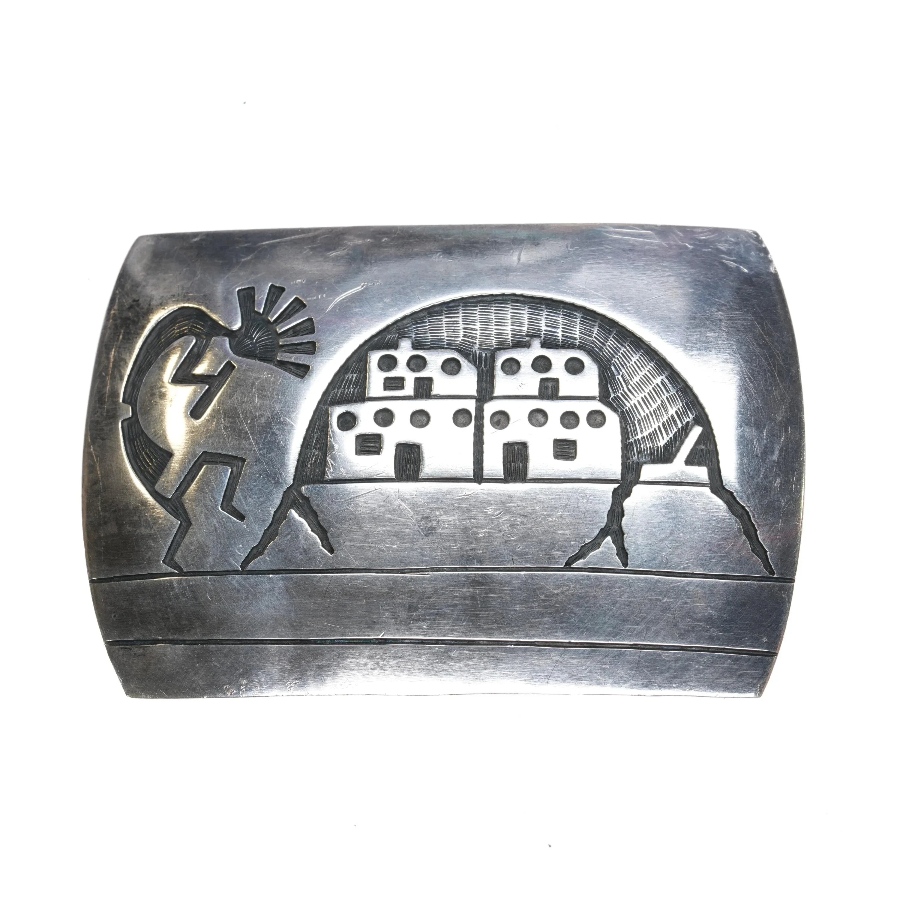 Mark Tawahongva Hopi Overlay Belt buckle w/ pueblos Kokopelli sterling silver
