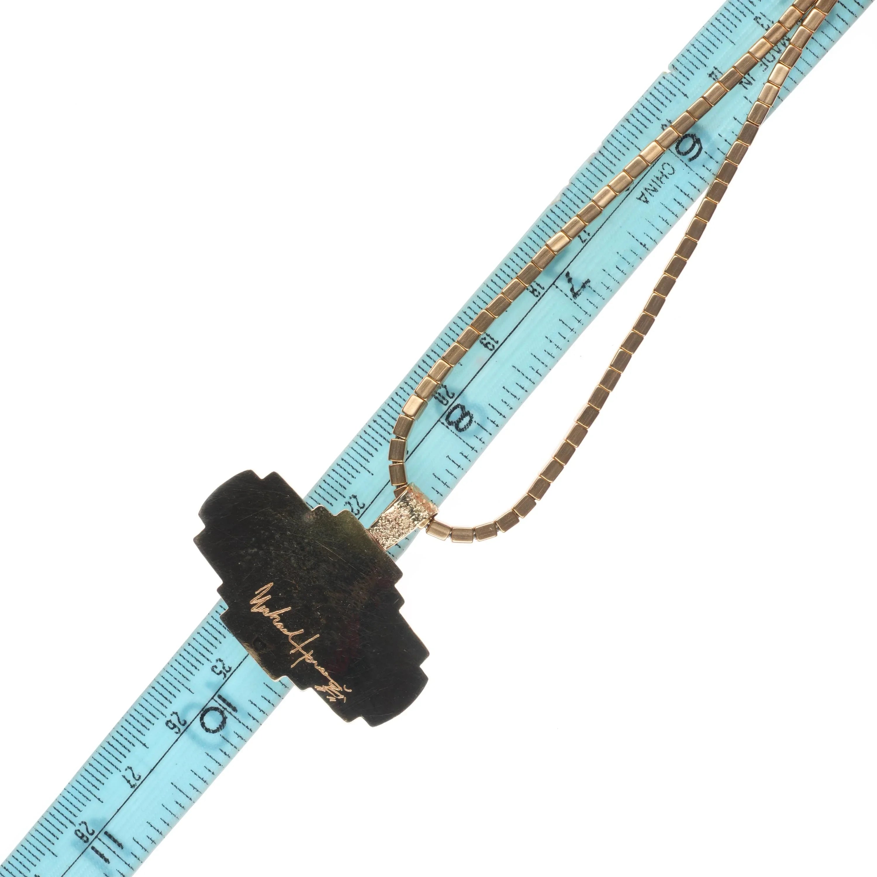 “I’m finding now that from my travel among other native cultures that I am starting to use images that I did not grow up with. I am inspired by other tribal artists. From the plains to South America to Africa, I’m finding that there are similar patterns among indigenous people around the world and that it is indeed a very small place. It is a place with similarities among us indigenous people that don’t seem to be accidental. Michael had always been moved by the older kachina jewelry that had been made in the 1940s. These older pieces have inspired him to make amazingly detailed kachina bolos, earrings, and pendants.