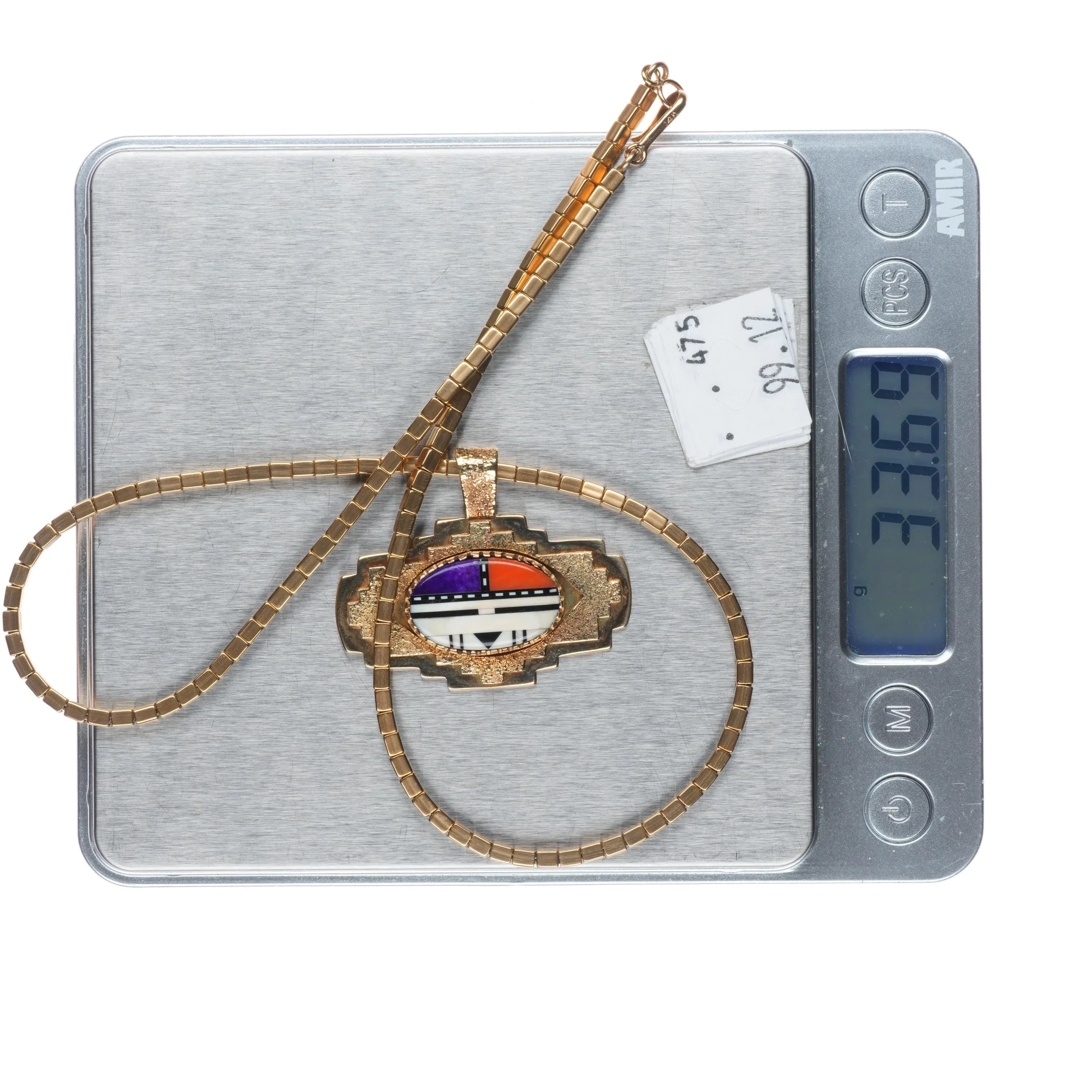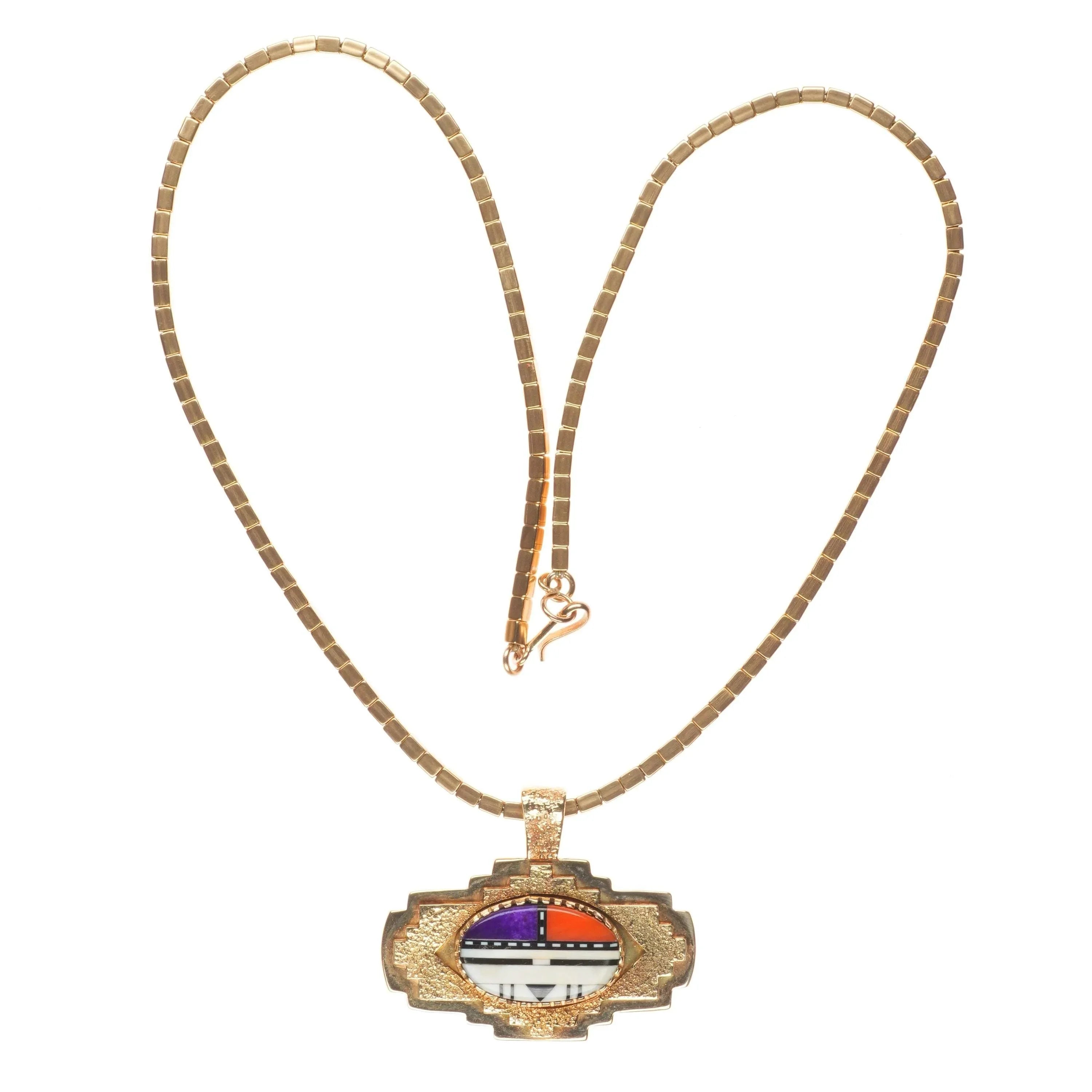 Michael Horse-Yaqui 14k gold, sugilite, coral yei pendant/necklace . Circa last quarter of the 20th century with no apparent issues. Tested and guaranteed solid 14k gold with weight and measurements in pictures. 18" necklace. Necklace marked 14k, original to this piece and made by Michael Horse. There was another silver pieces in this collection with a silver necklace of similar construction made by the same artist.