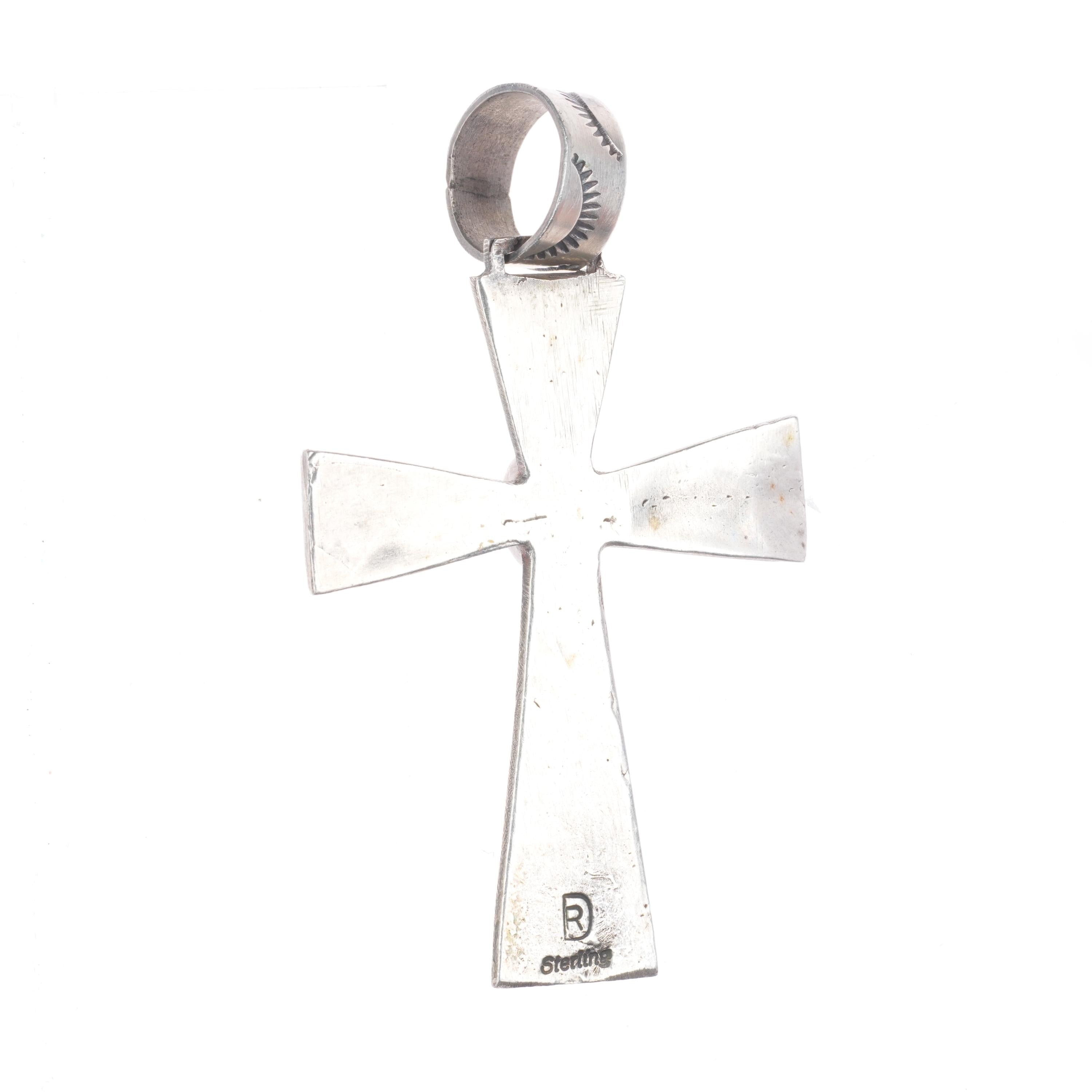 Ray Delgarito Navajo sterling silver Royston turquoise big cross pendant. Tested and guaranteed solid sterling silver with weight and measurements in pictures. Marked as shown, circa last quarter of the 20th century.