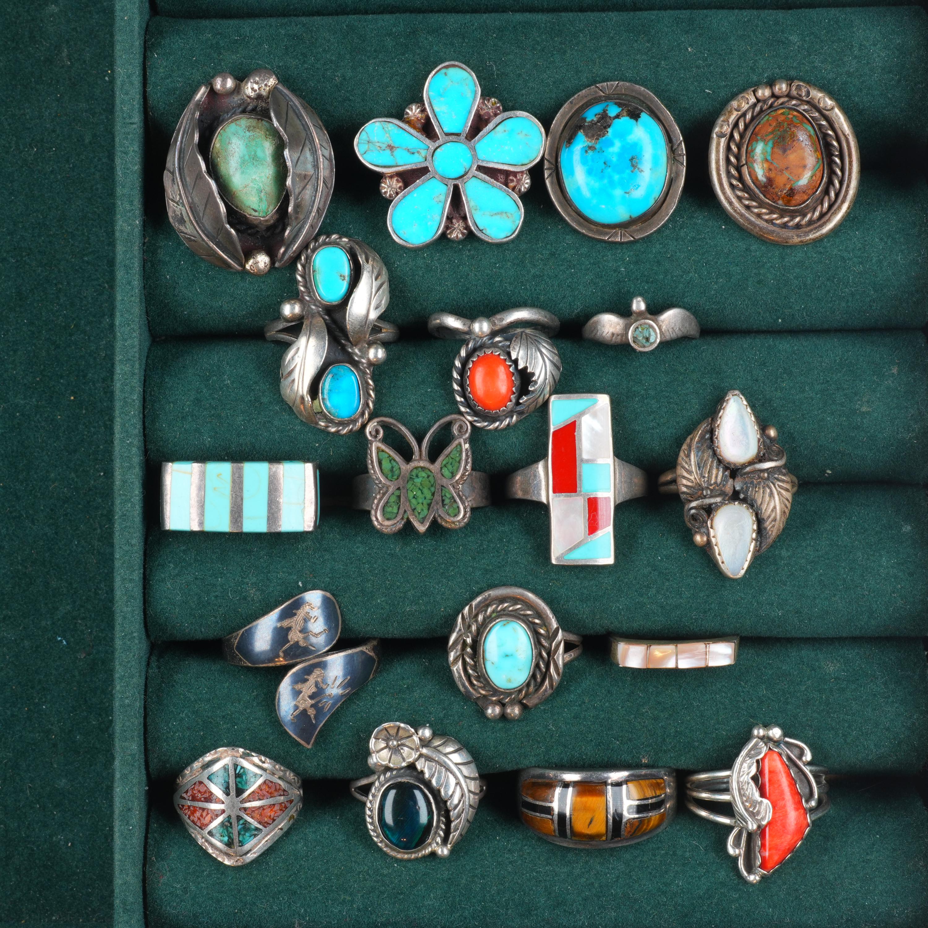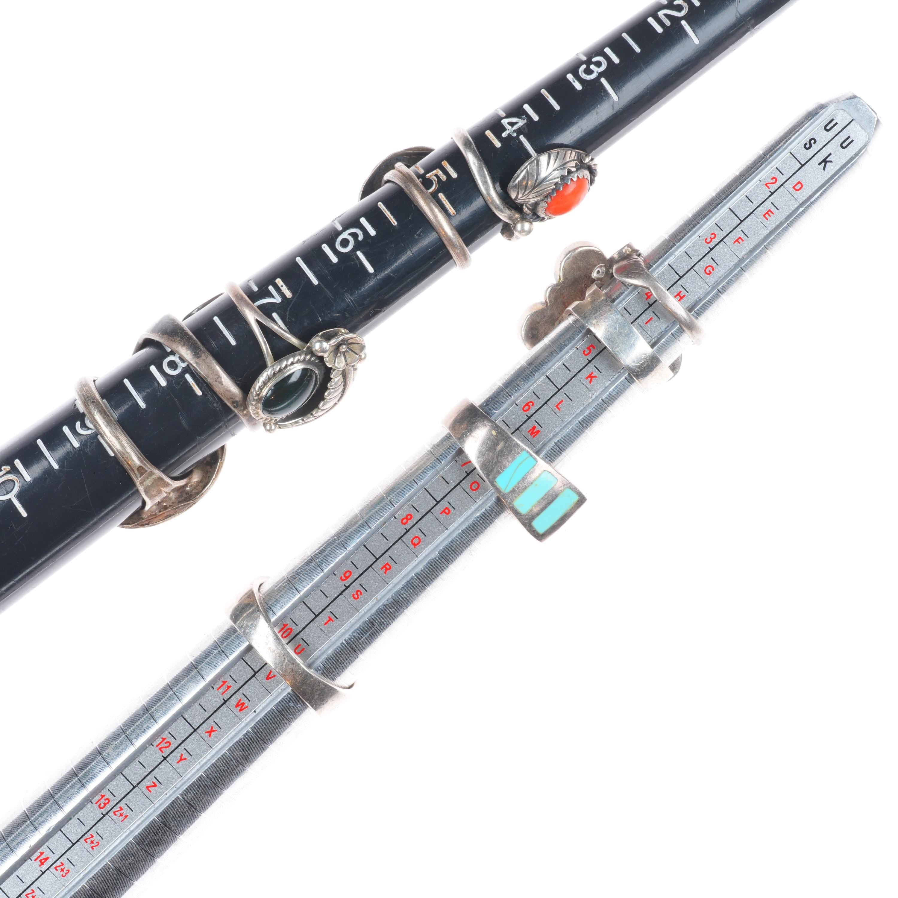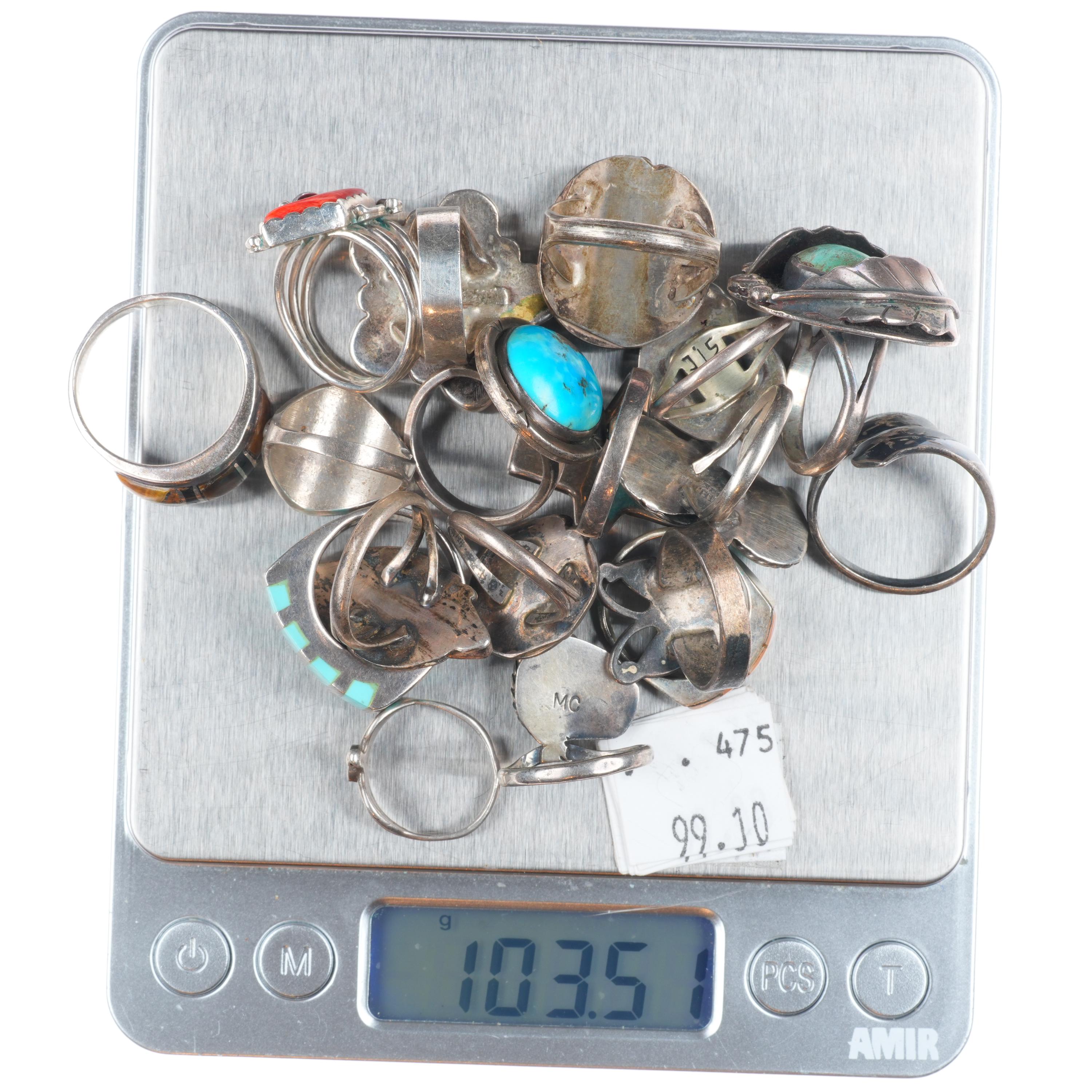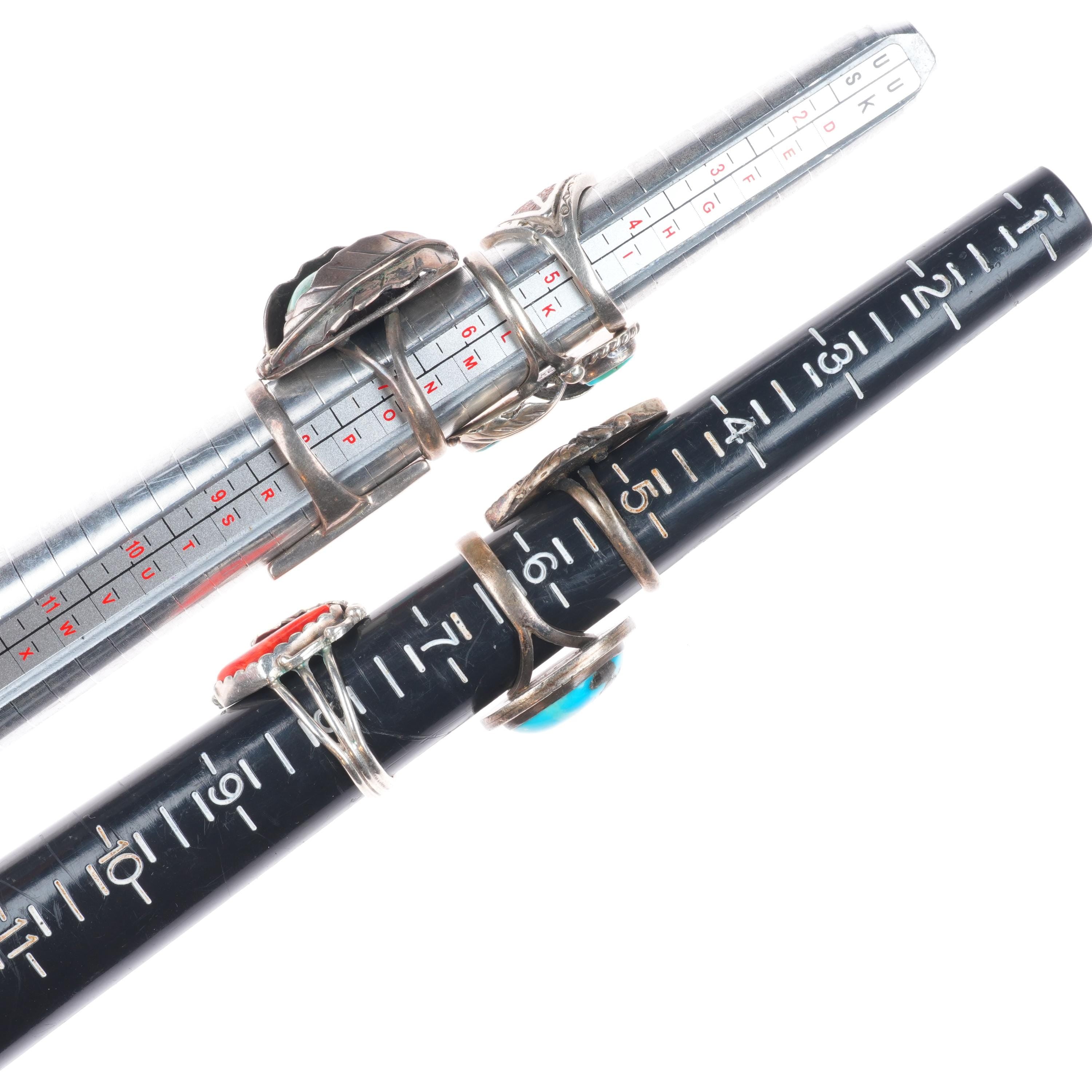 sz4-10 Navajo/Zuni/Southwestern sterling silver turquoise/coral/inlay rings lot. Tested and guaranteed solid sterling silver. Selling the 18 rings shown with weight and measurements in pictures, shown on sizers. Age appropriate wear. Some marked, some not marked. I am making lots of these lots with my wife photographing and me listing. We are listing in lots due to time limitations, so we are not heavily scrutinizing each ring. Most are going to be Native American made, but there will likely be some southwestern style rings mixed in each lot. Or one two totally unrelated but still sterling. My wife who is making the lots doesn‘t know the difference as she‘s Vietnamese. Please look at the pictures and make up your own mind for condition, etc. There may be dents, cracked stones, etc. I tried to weed out any junk before I gave them to her, but we are in a hurry. Time is the number one consideration when making these lots so there will be some surprises, hopefully more good than bad :)
