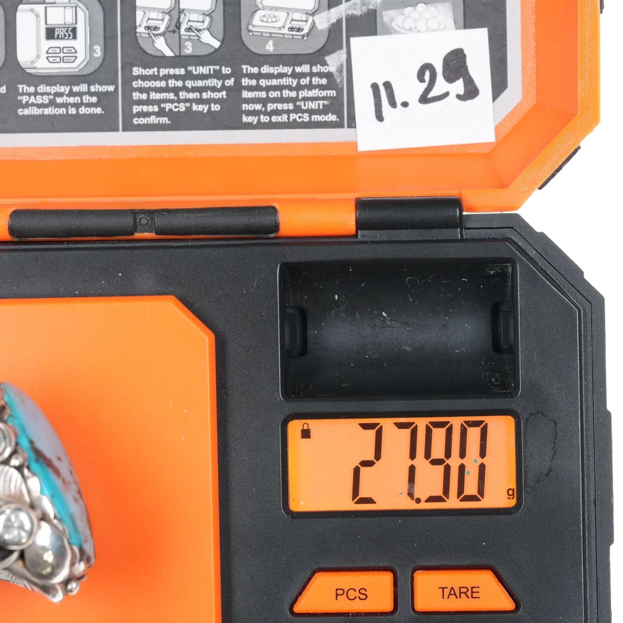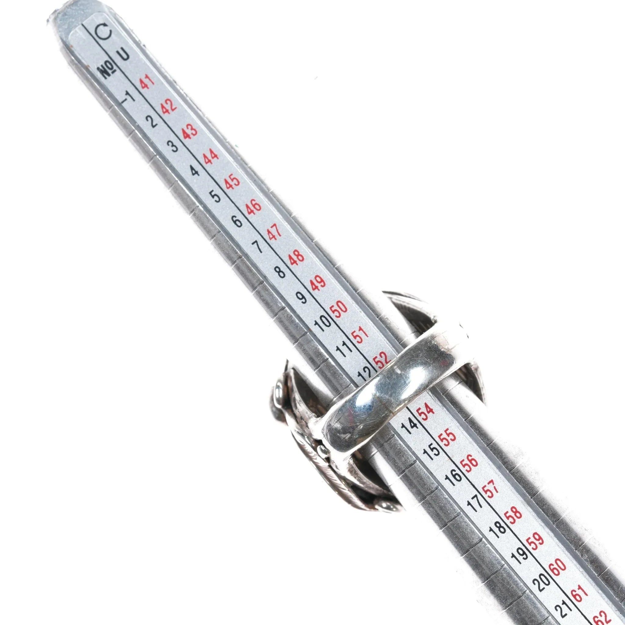 Sz6.5-9 CR Native American sterling interior stamped sterling and turquoise ring. Extremely high quality ring with no issues. Hallmarked as shown, weight and measurements in pics, solid sterling. Has an interior sizing attachment to bring the size down. Could either be removed or stretched out. I could adjust it a few sizes up if requested.