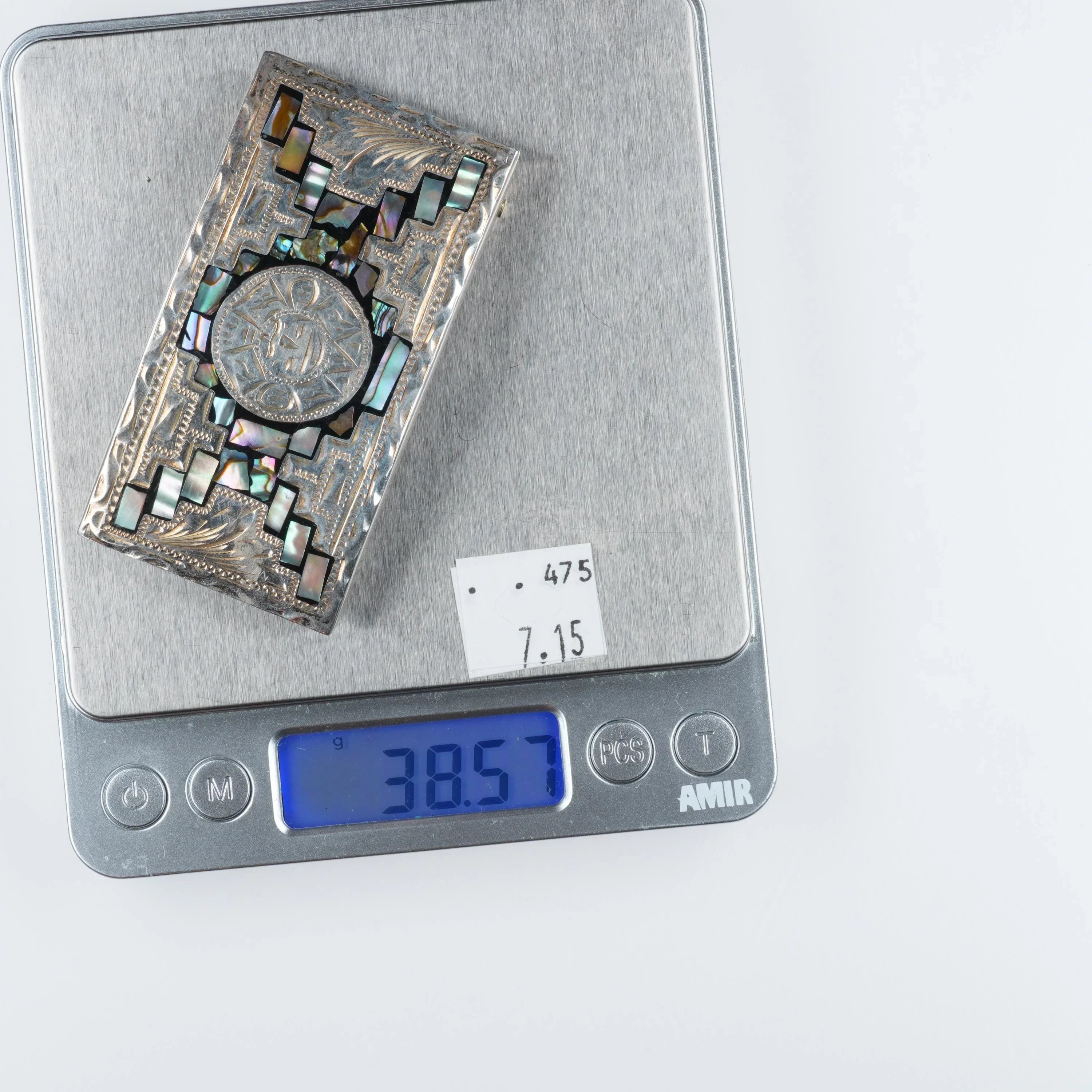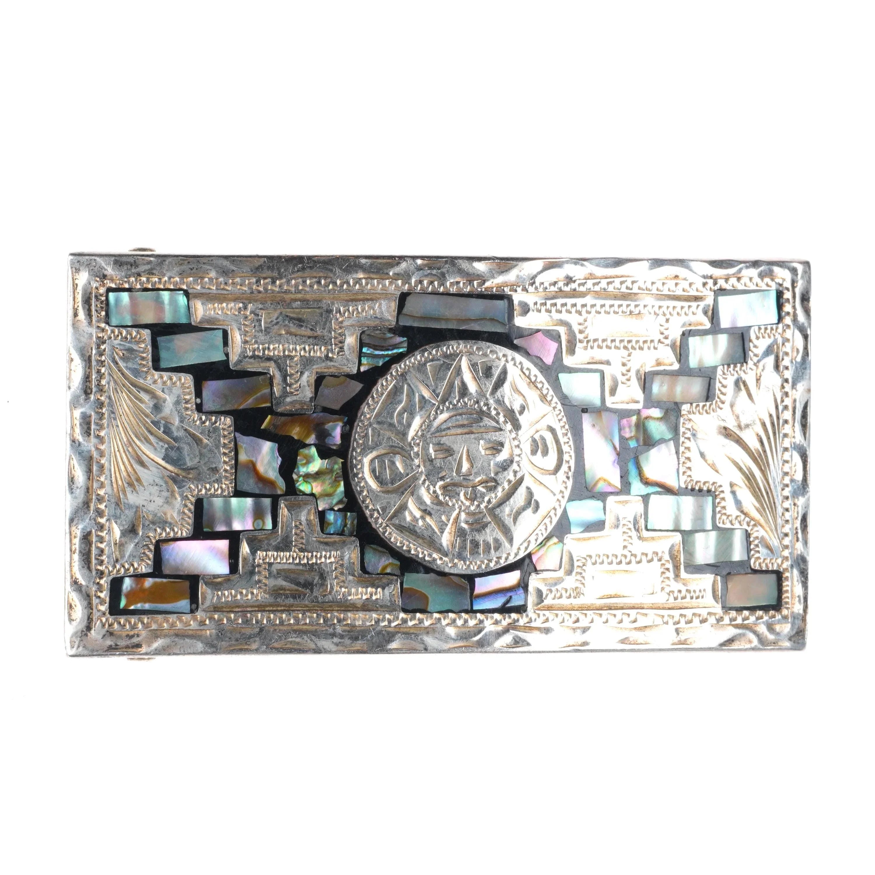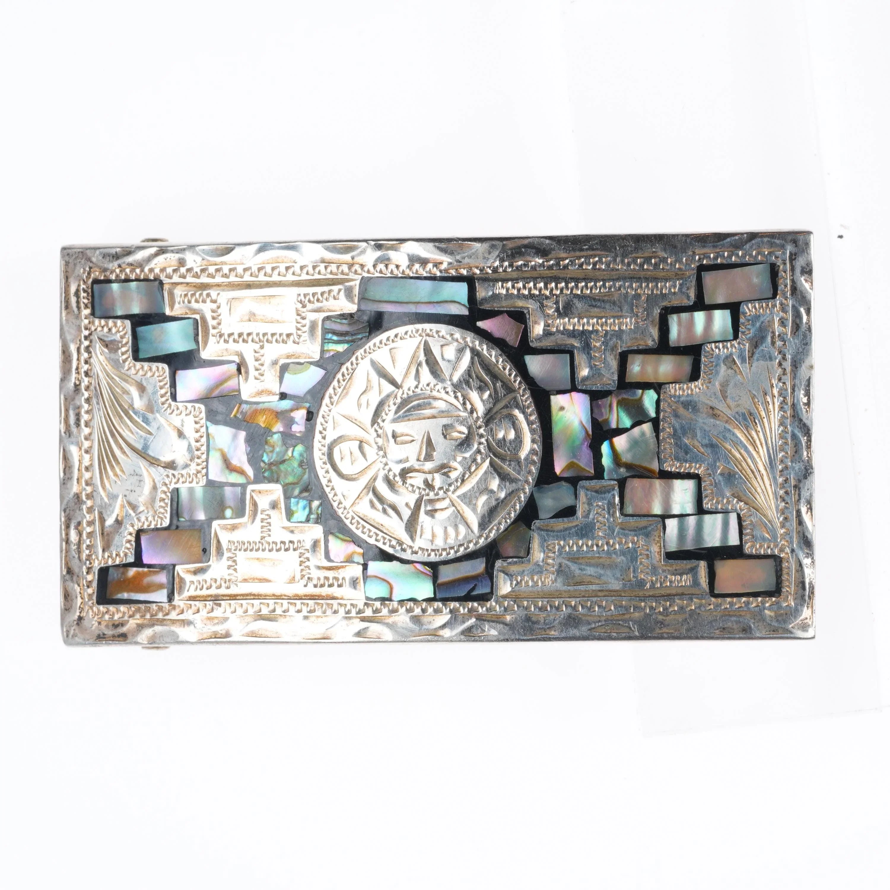 Vintage Aztec/Mayan style Mexican sterling silver/mother of pearl belt buckle