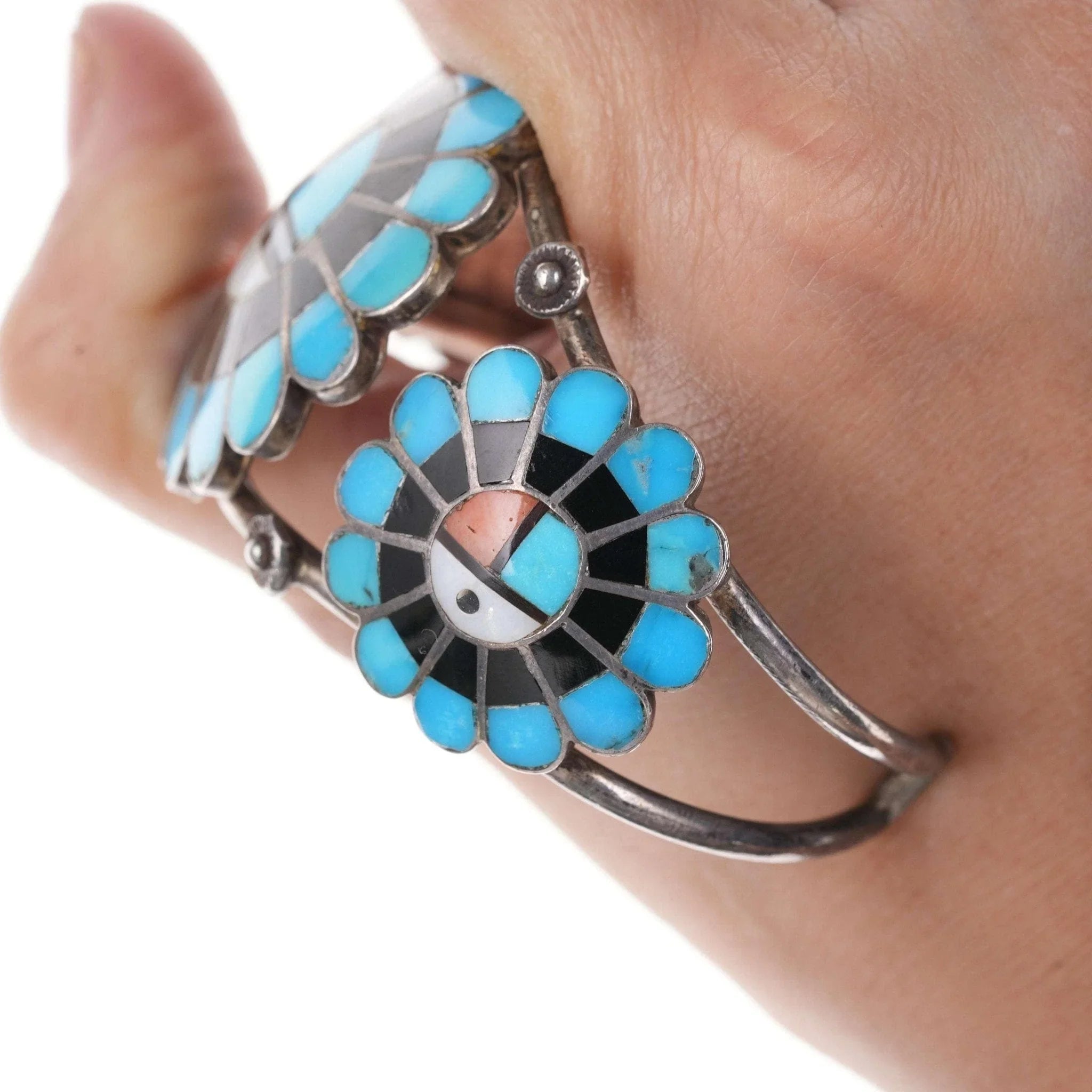 Vintage Eustace Zuni Sunface multi-stone inlay ring and bracelet set. Size 5.5<br>ring, bracelet fits a 7.25" wrist 45.3 grams total with no issues.<br><br><br>All precious metals are tested and guaranteed, any Native American jewelry<br>referred to as Silver or Sterling is guaranteed to be a minimum of 90% (coin)<br>silver and possibly higher content. Anything marked is guaranteed to be what<br>it's marked, most bracelets are photographed on a 6" wrist (non hairy), rings<br>photographed on the appropriate sized finger when possible. With bracelets if<br>the measurement is not given in the description then inside circumference is<br>shown where the metal meets the number on the the cloth tape measure.