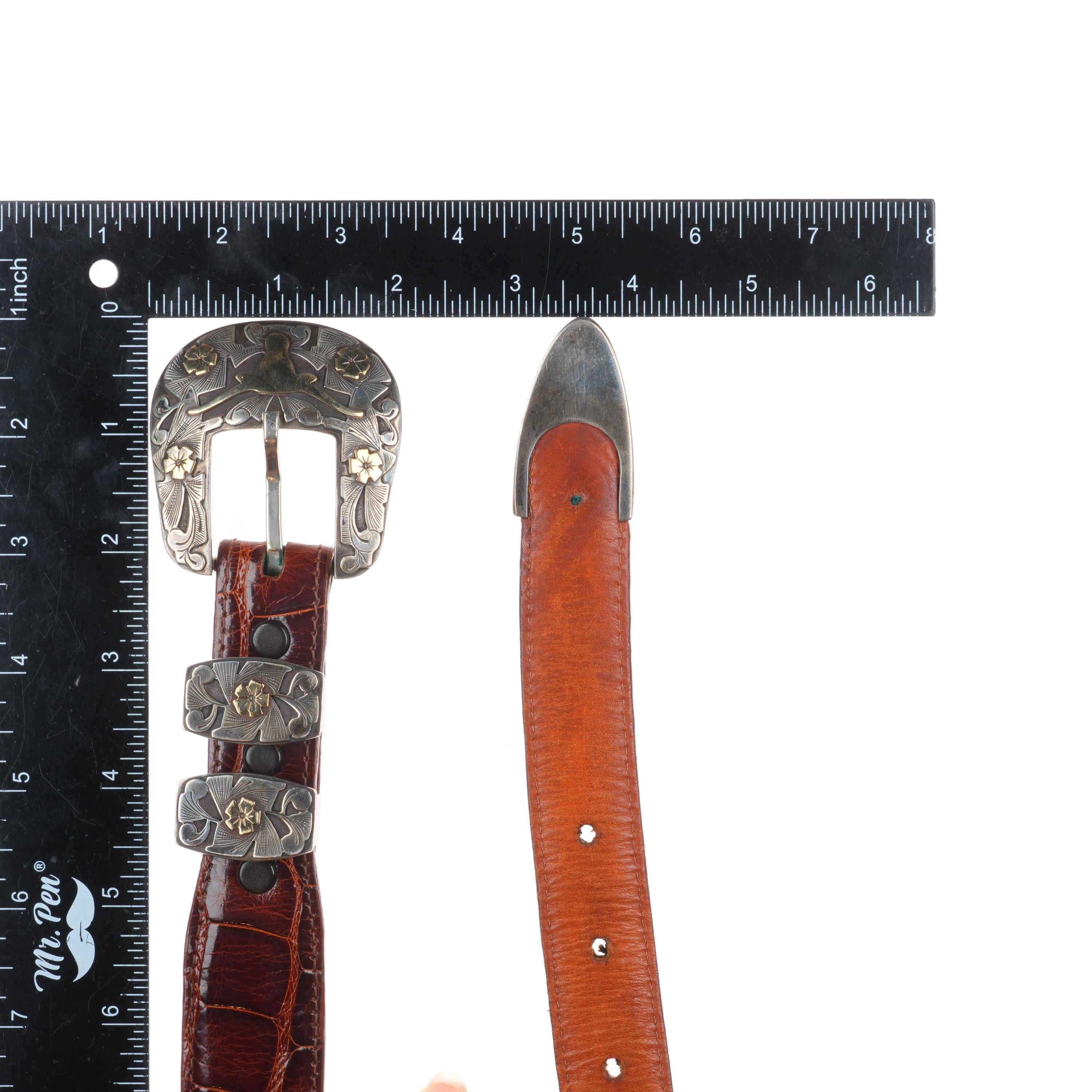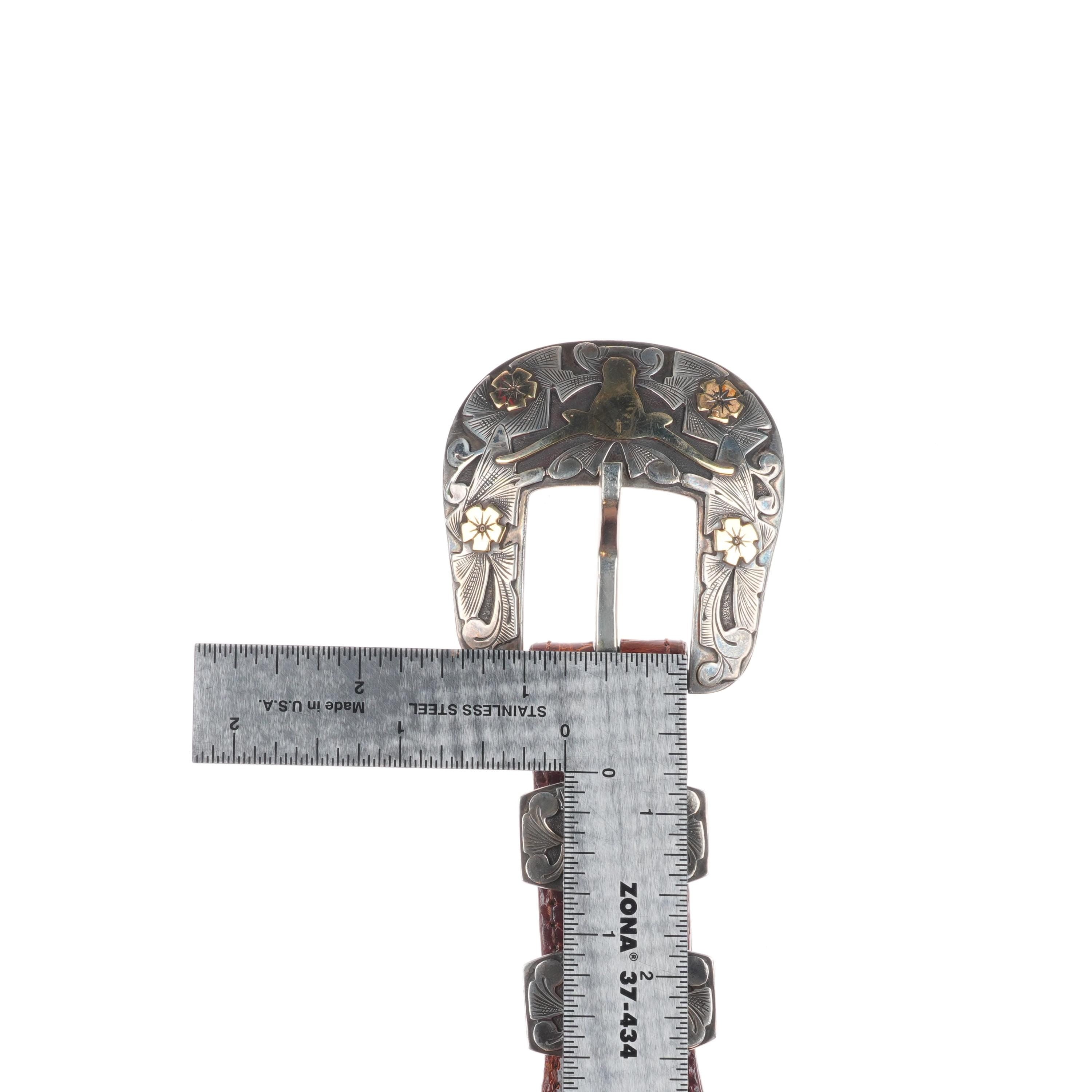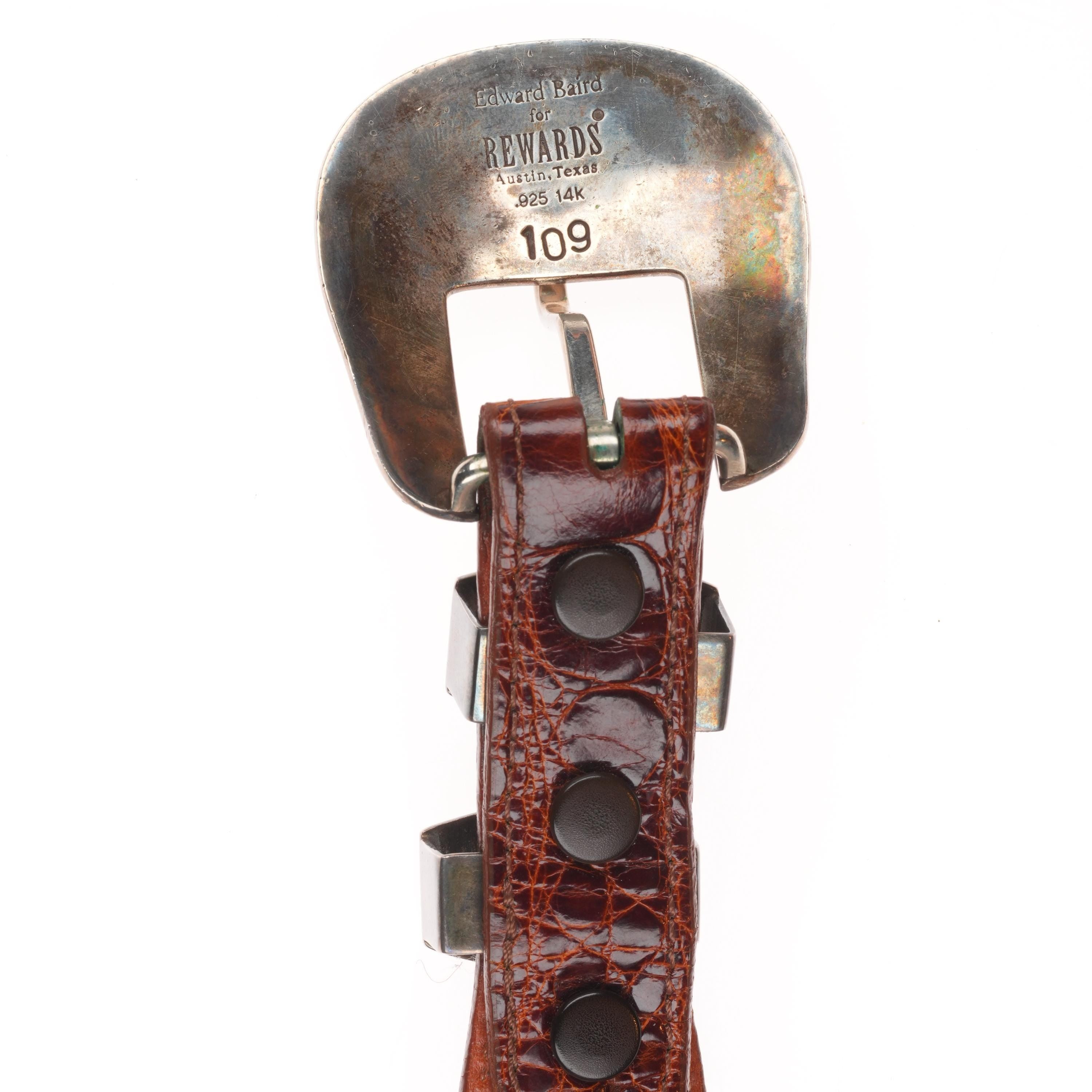 1" 14k/Sterling silver Texas Longhorn Edward Baird/Reward ranger belt buckle set. Vintage set with some expected wear but no significant issues. Fits up to 1" ranger belt. Ranger belts are wider and taper down at the buckle/keepers/tip. Selling the buckle set shown, giving the belt for free.