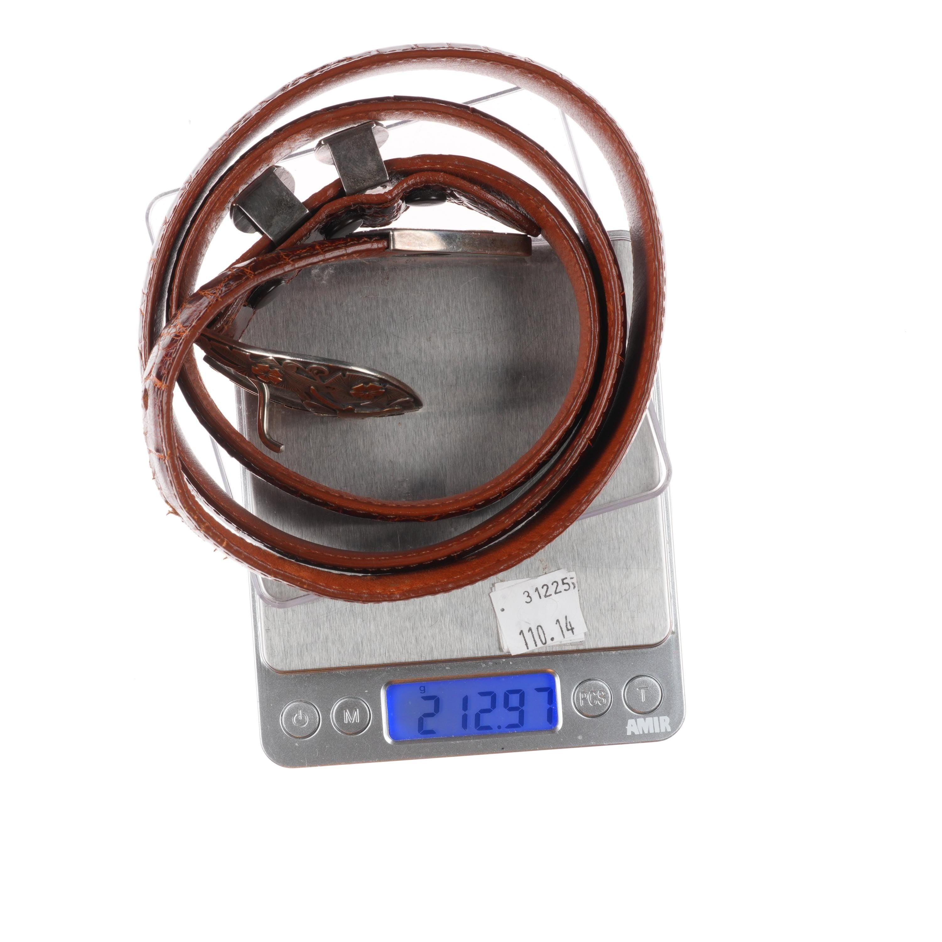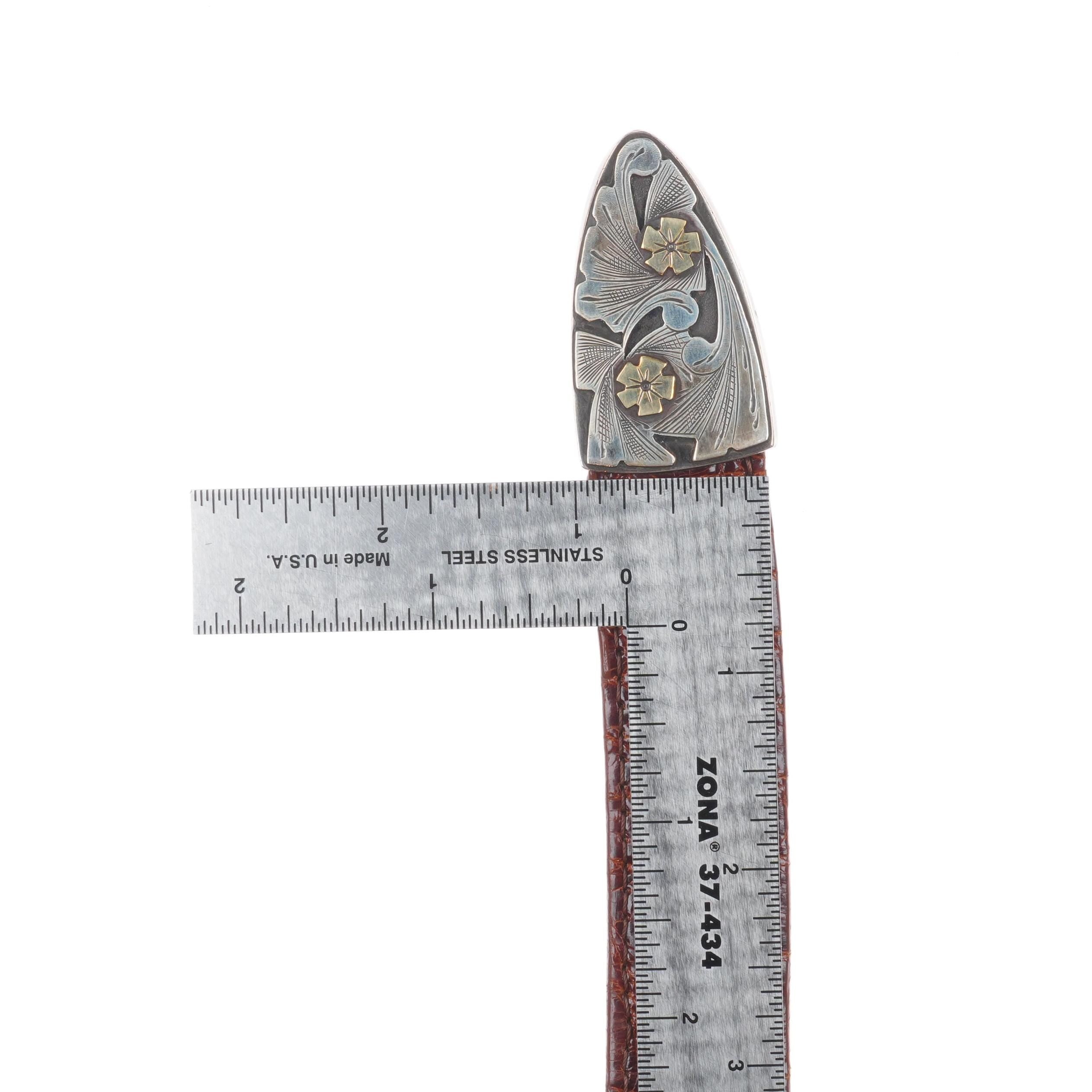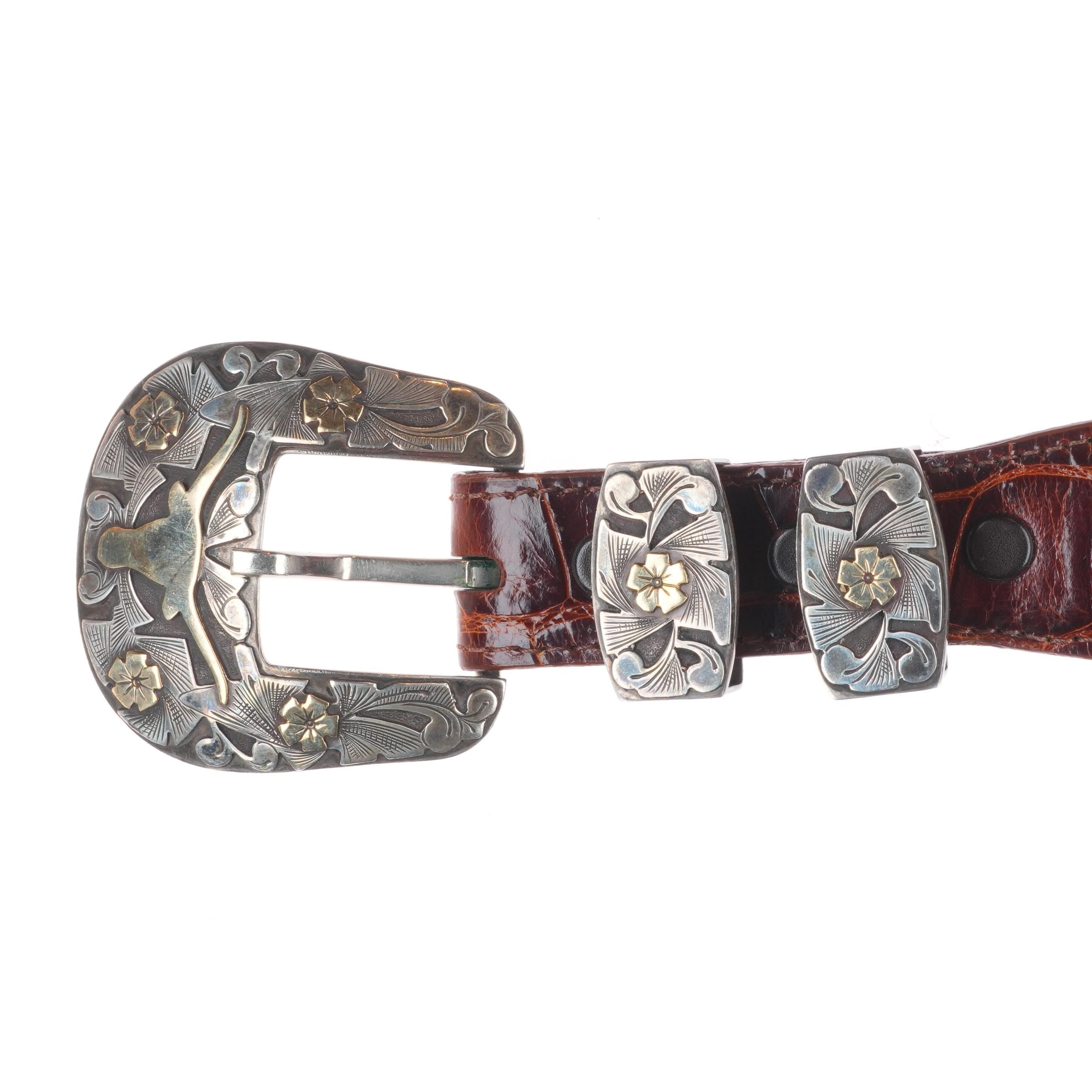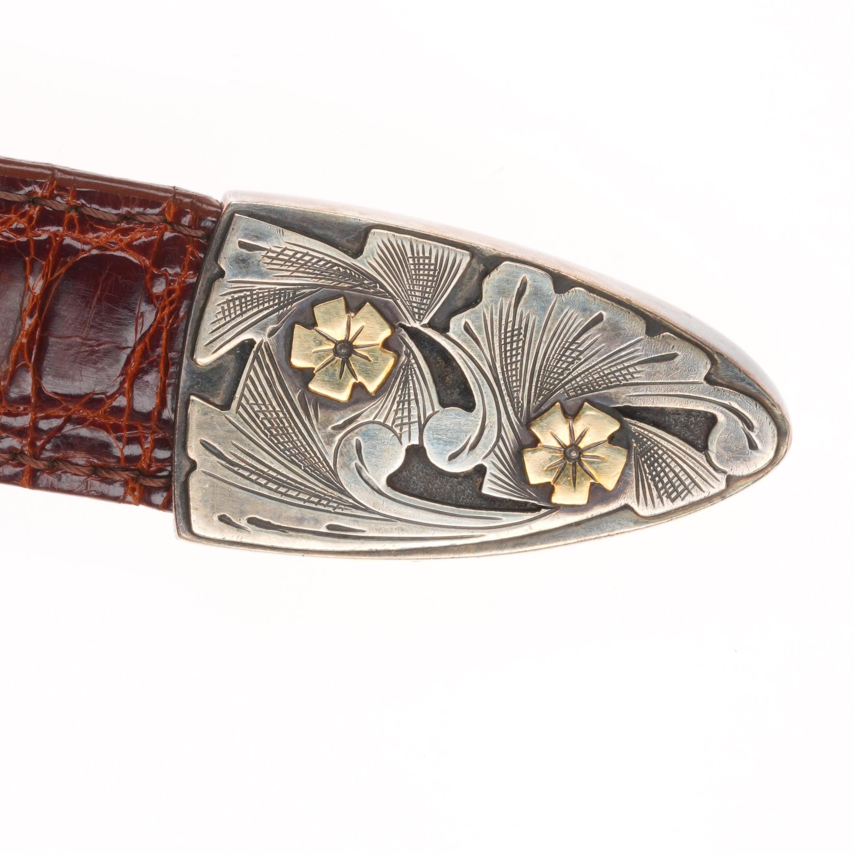 1" 14k/Sterling silver Texas Longhorn Edward Baird/Reward ranger belt buckle set. Vintage set with some expected wear but no significant issues. Fits up to 1" ranger belt. Ranger belts are wider and taper down at the buckle/keepers/tip. Selling the buckle set shown, giving the belt for free.