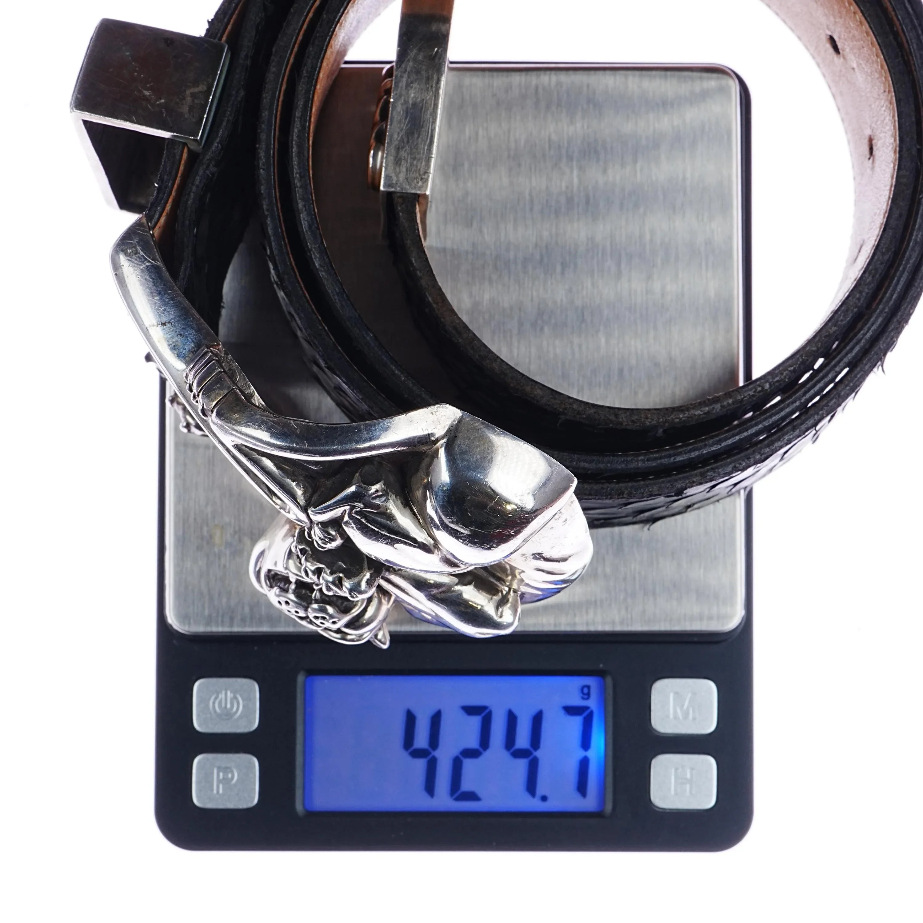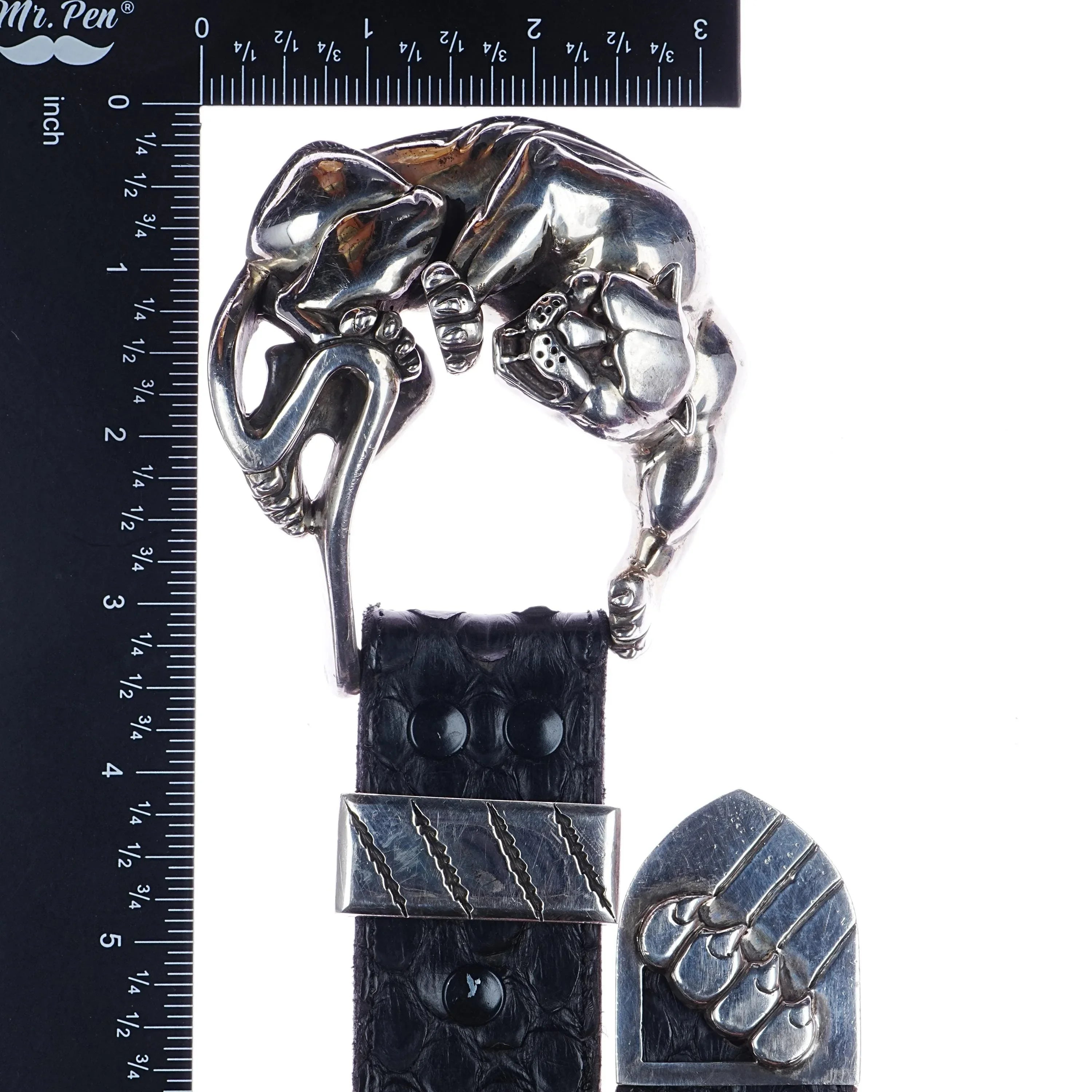 1.5" 1993 Kokopelli Designs Sterling silver Jaguar Ranger belt buckle set. This is on a 1.5" belt, the center hole is 34" and two on each side, more could be added, belt is high quality and in good condition and it is free with the very heavy solid sterling silver, Buckle, keeper, and tip that I am selling. Weights and measurements are in the pictures. This company was in Business in the 1990‘s, the modern day equivalent of this type of quality would cost a small fortune.