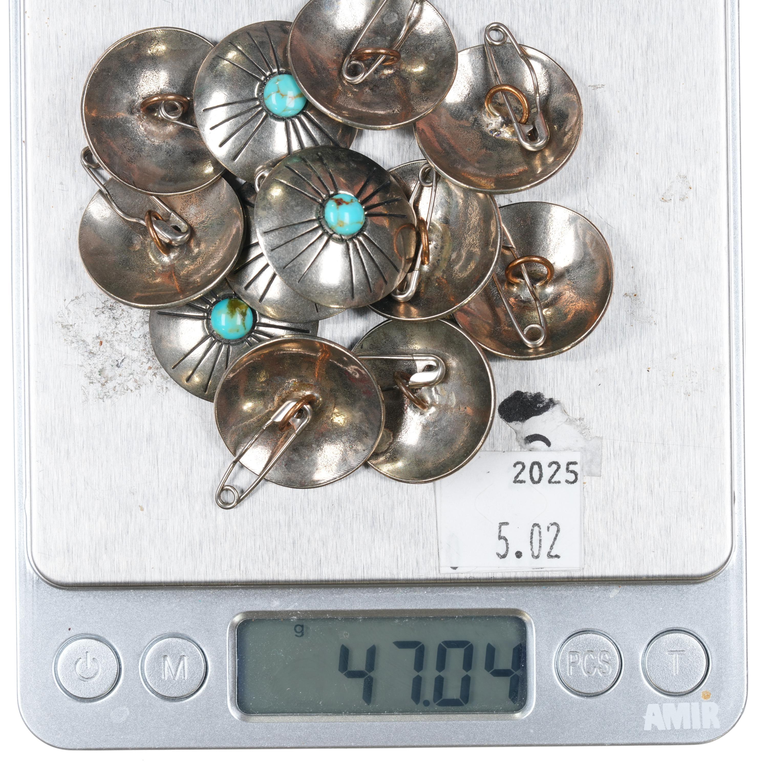 12 Vintage Navajo Southwestern sterling silver button cover set w/turquoise. Selling the 12 shown, all solid sterling silver with copper loops and safety pins attached from where these were pinned on something. . Weight and measurements in the pictures.