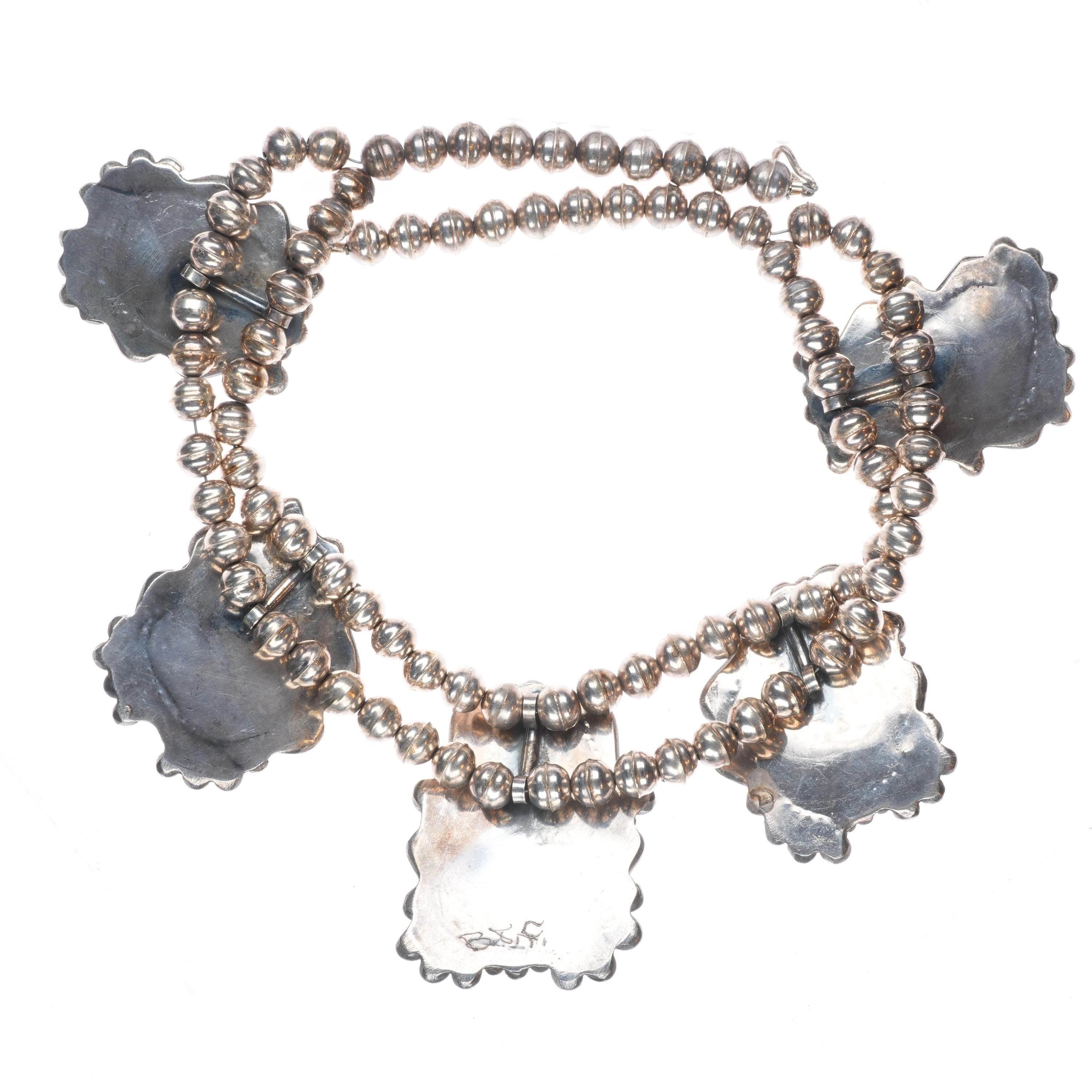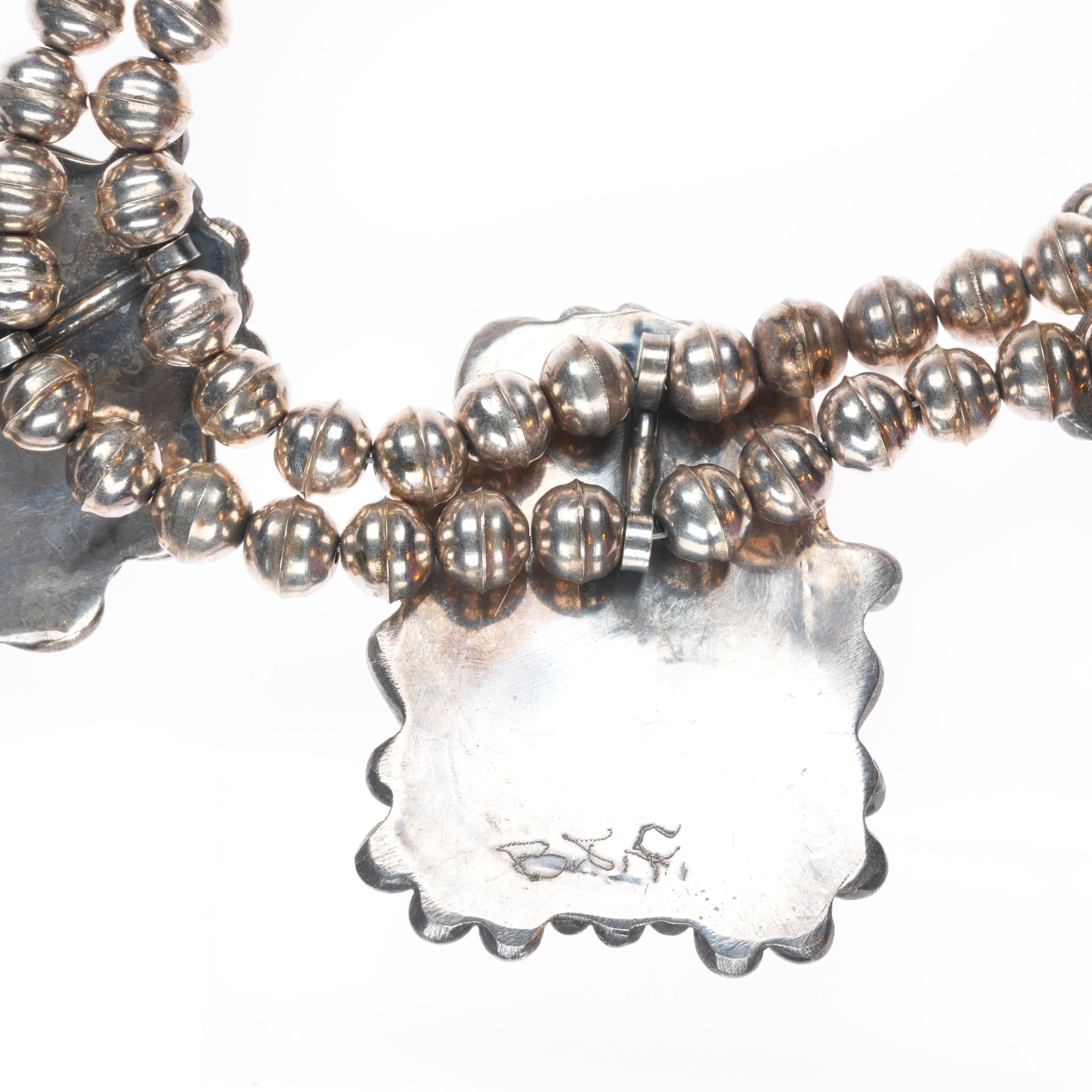 18" Vintage Navajo sterling silver turquoise tab beaded necklace. Solid sterling silver tested and guaranteed with weight and measurements in the pictures. Circa third quarter of the 20th century. Illegible/unresearched artists marking.