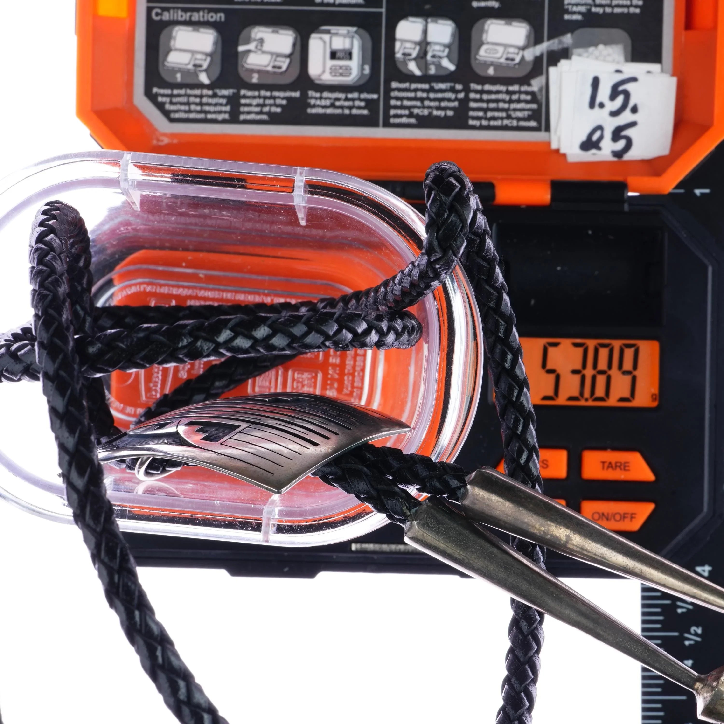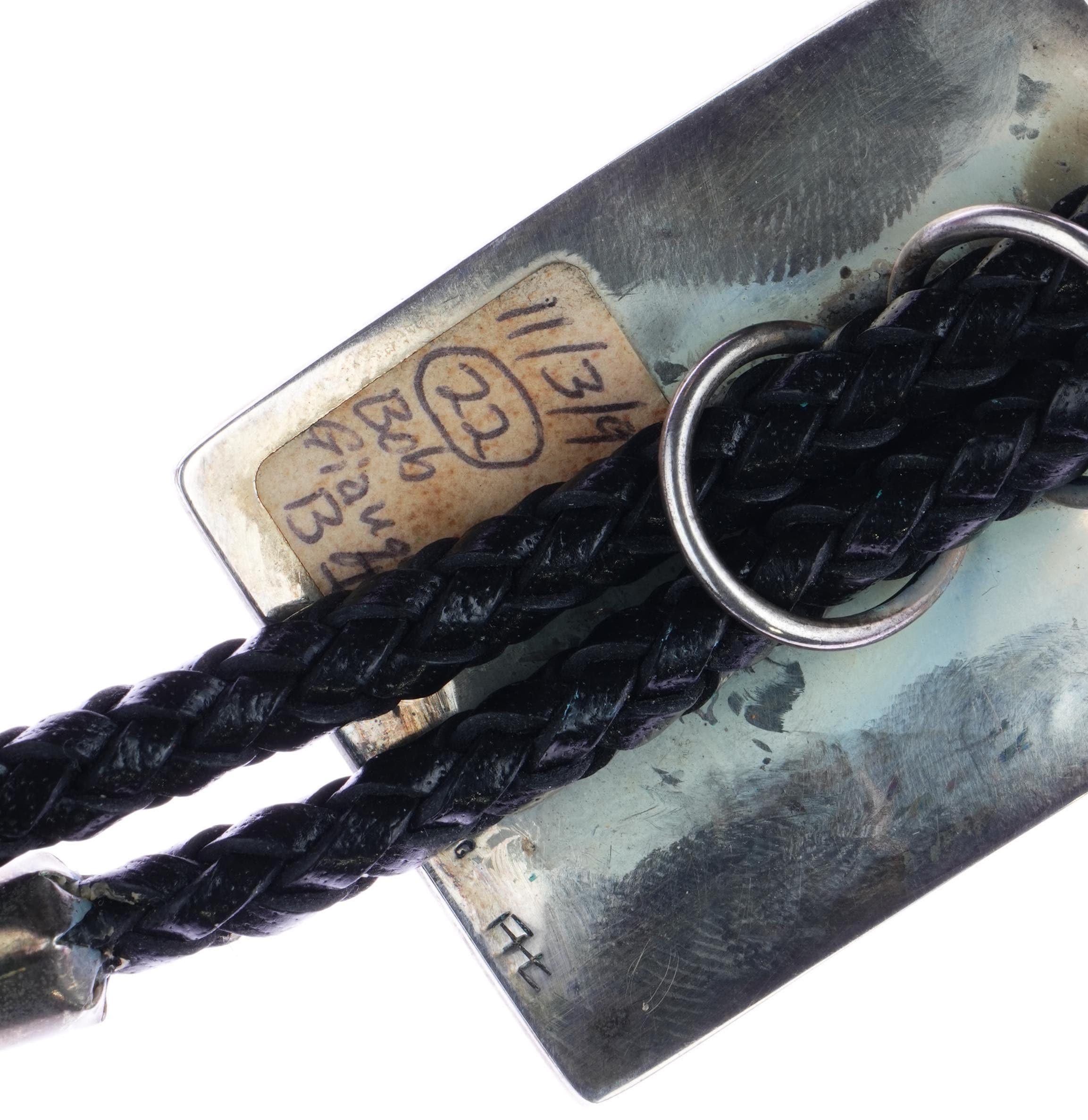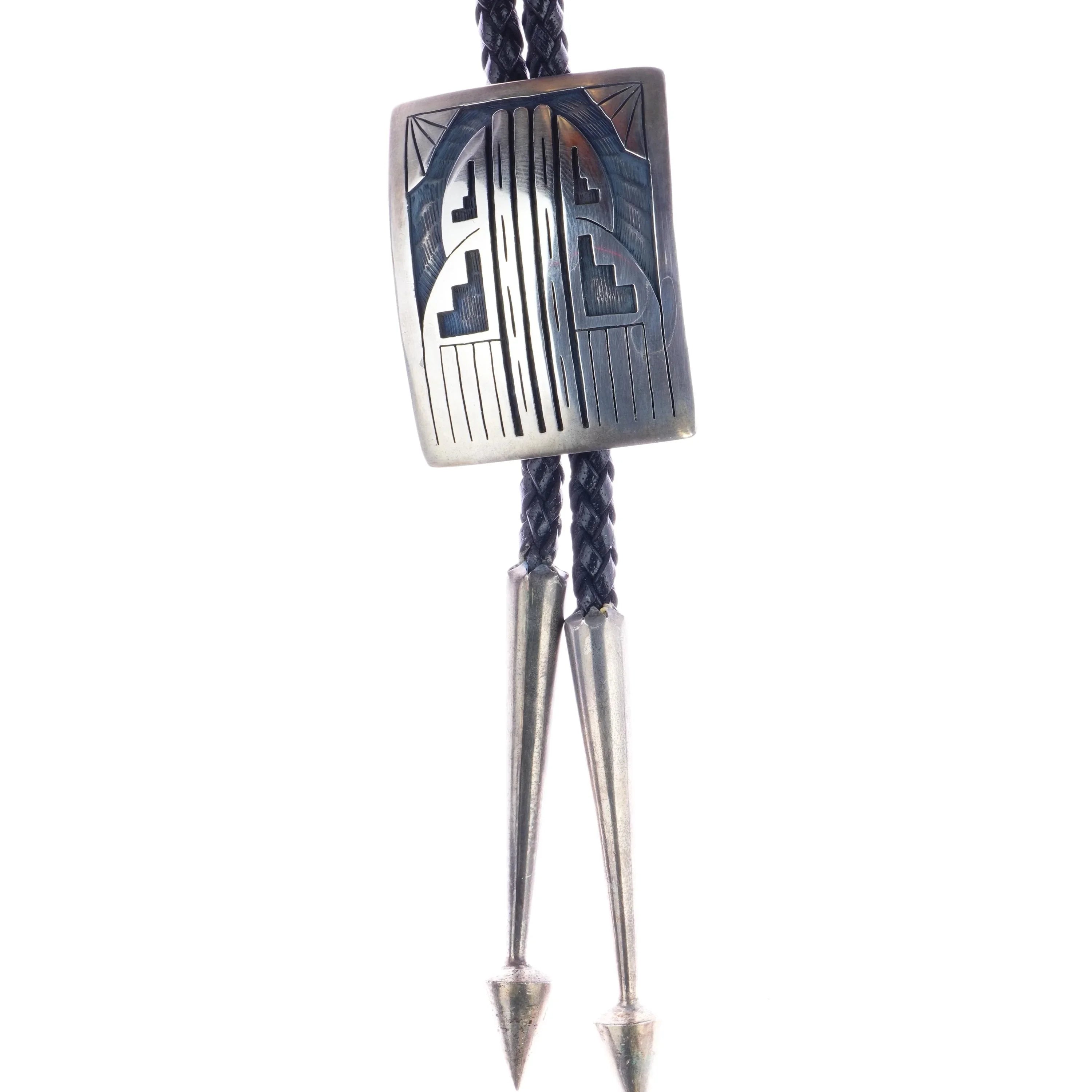 1990‘s Signed Hopi overlay bolo tie sterling silver. Solid sterling, weight and measurements in pics (scale tared out with containter, weight shown is just the bolo). No damage, sterling tips and bolo slide. Hallmarked as shown, possibly FHC on bottom right of reverse pic. From huge collection, only worn once or twice, 41" total length.