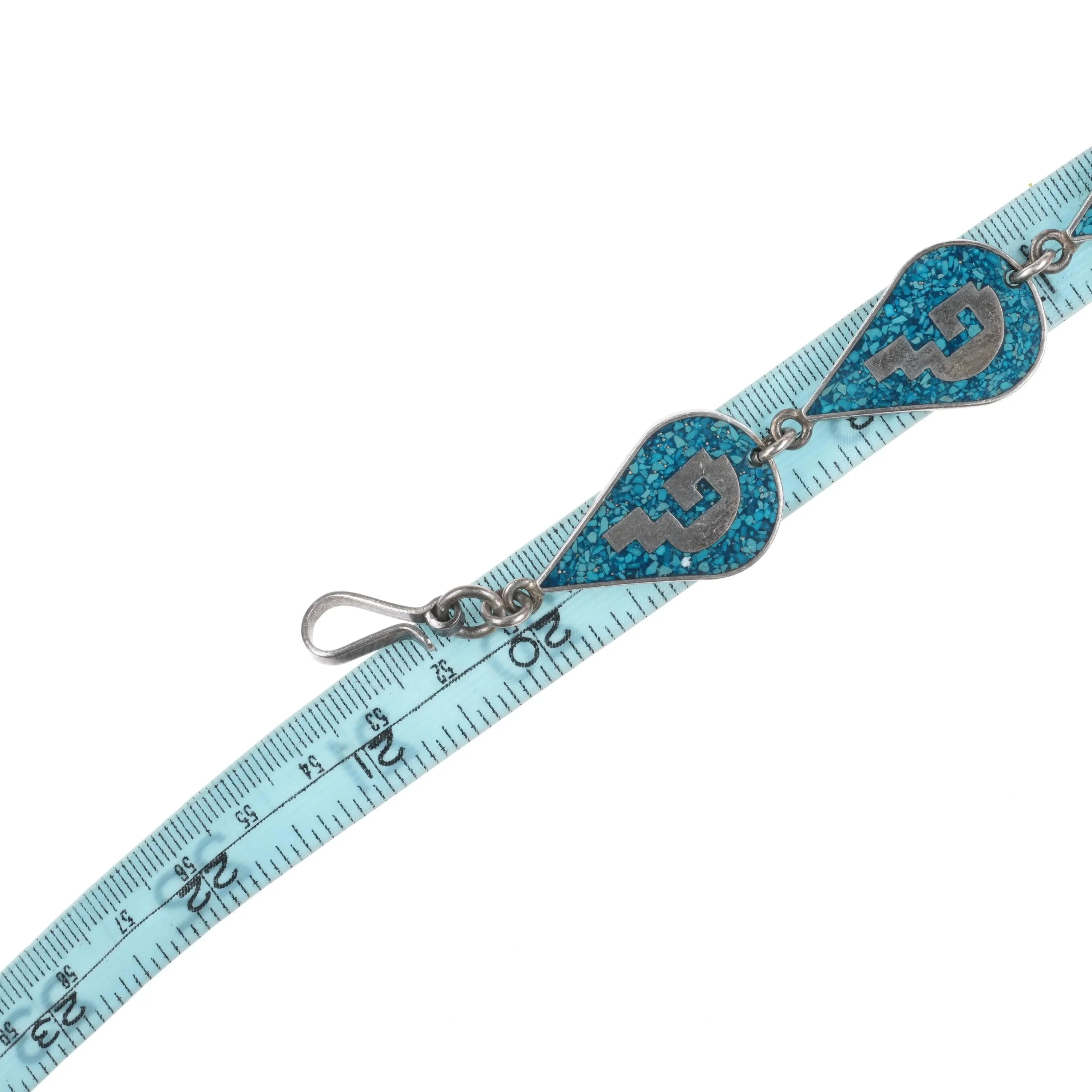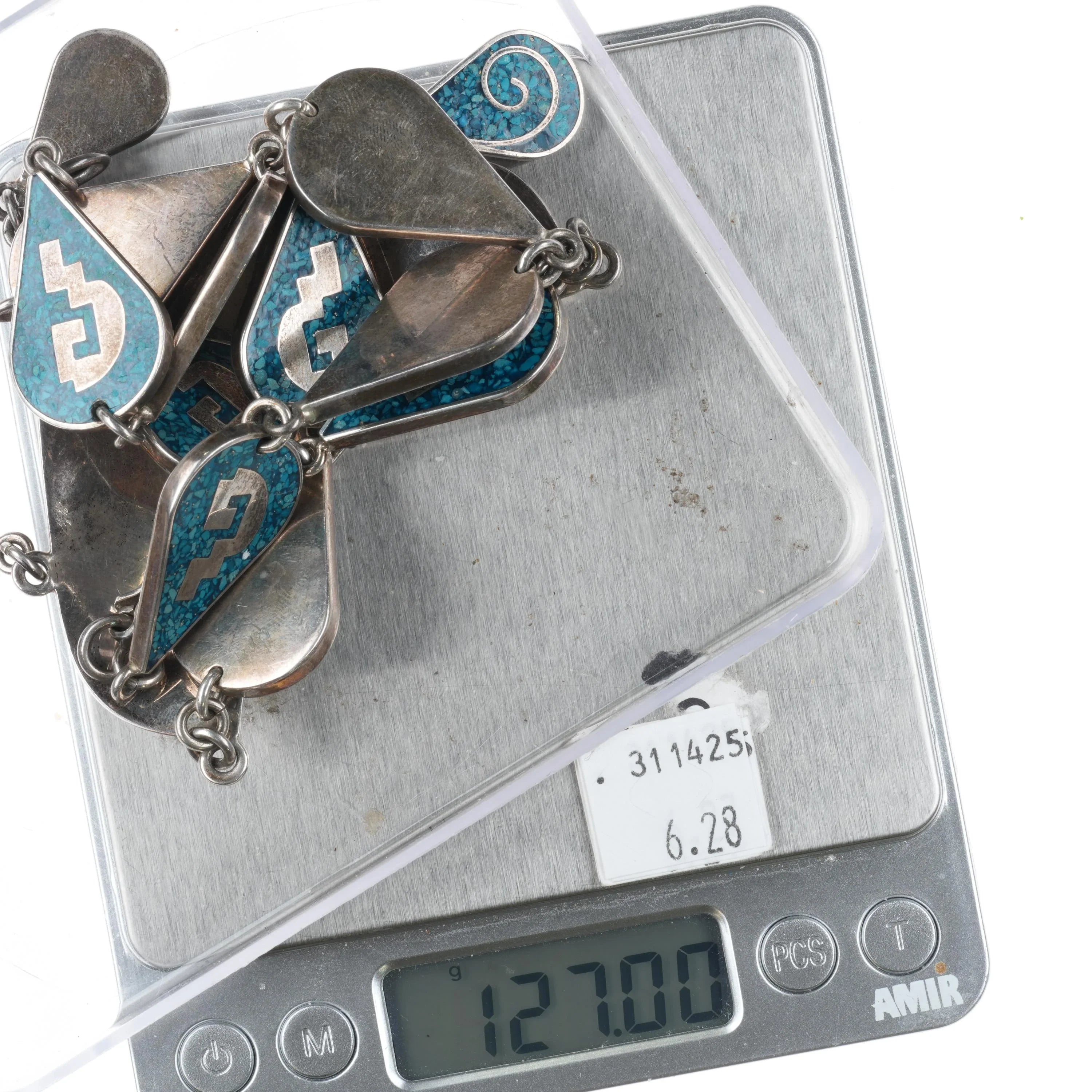 21" Retro Mexican Aztec style sterling silver turquoise chip inlay link necklace. Solid sterling silver, marked as shown, with weight and measurements in the pictures. Tested and guaranteed solid sterling silver. No damage.