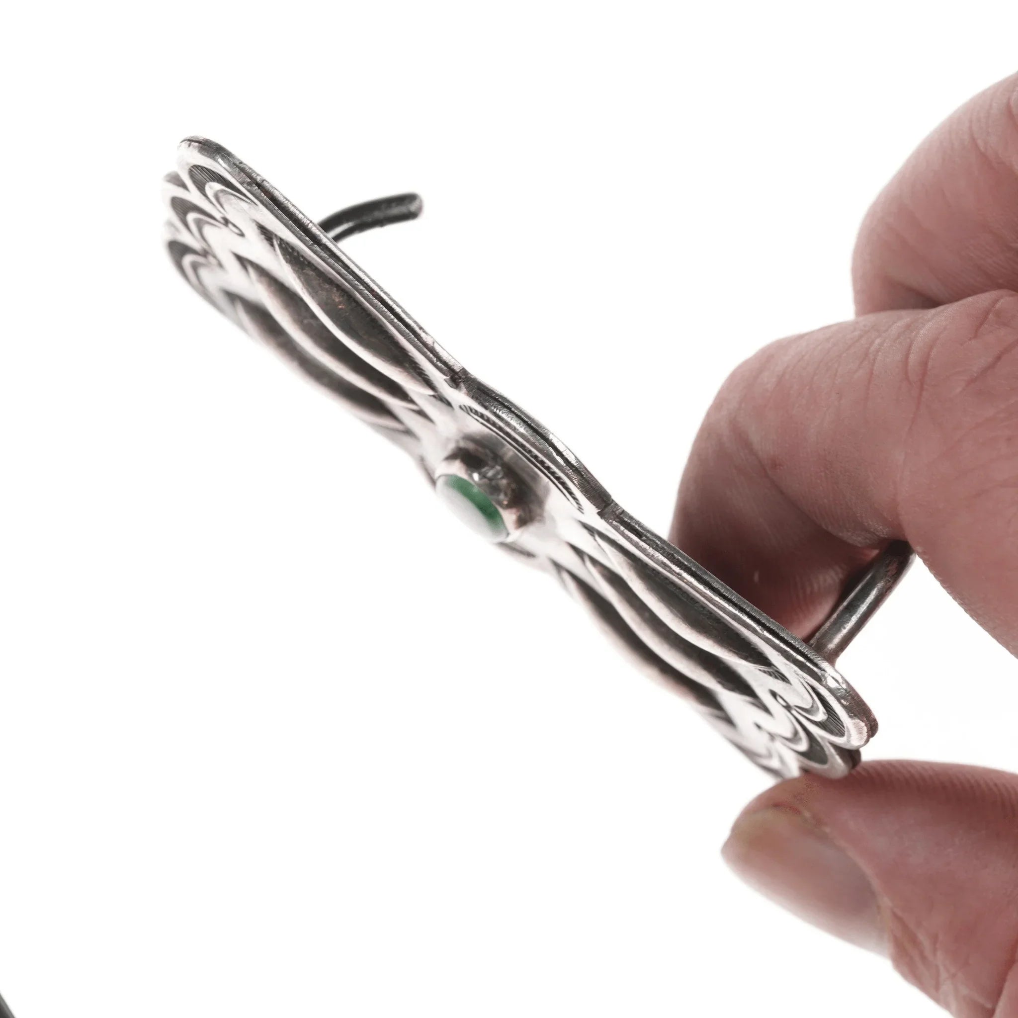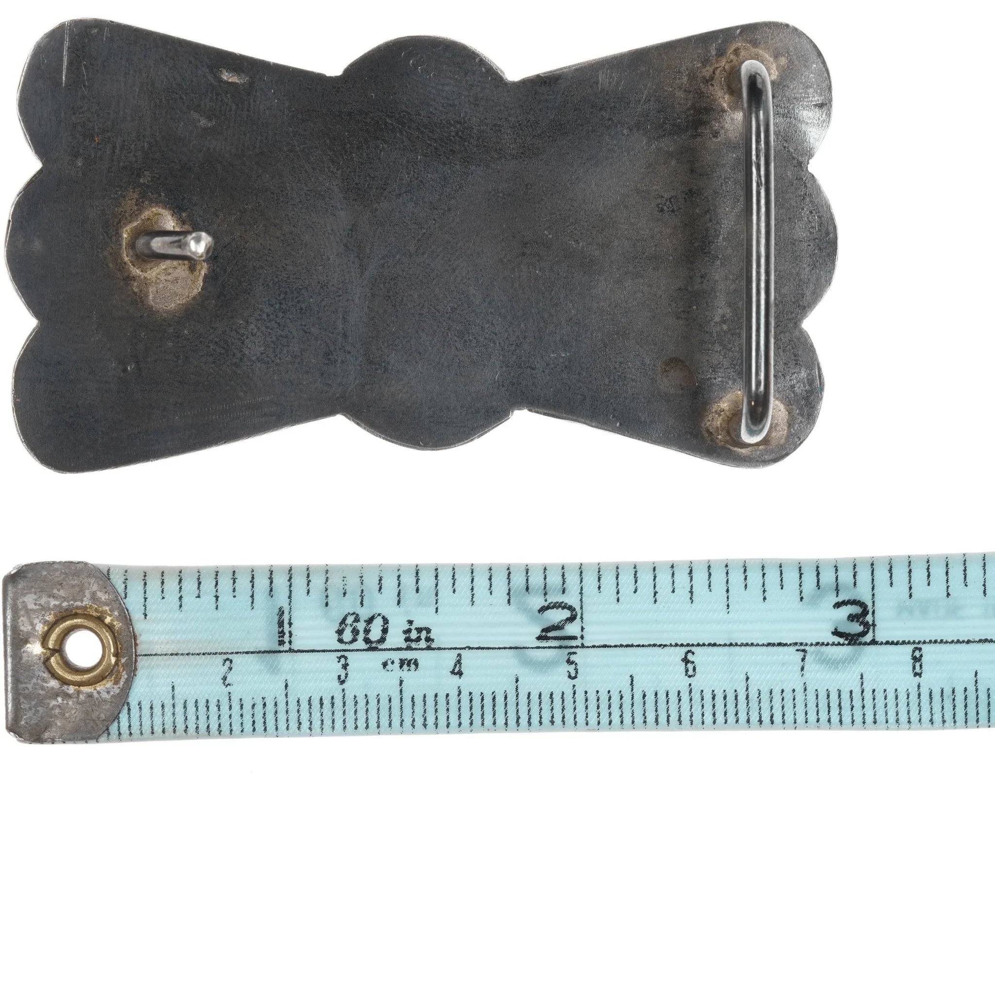 30's-40's Navajo Silver and turquoise bowtie belt buckle, fits a 1" belt, 46.1 grams. Likely a large butterfly from a larger sized concho belt from the second quarter of the 20th century later made into a stand alone buckle by soldering this back on it. If that's the case they did it long ago and did a perfect job in making a super cool/one of a kind buckle.