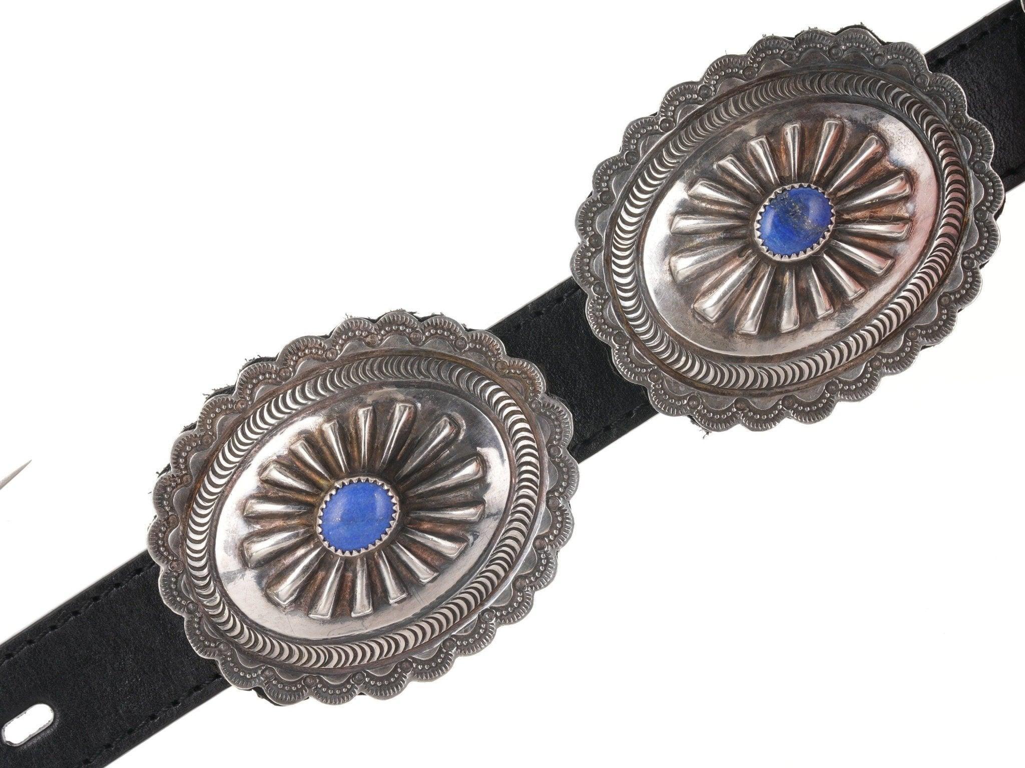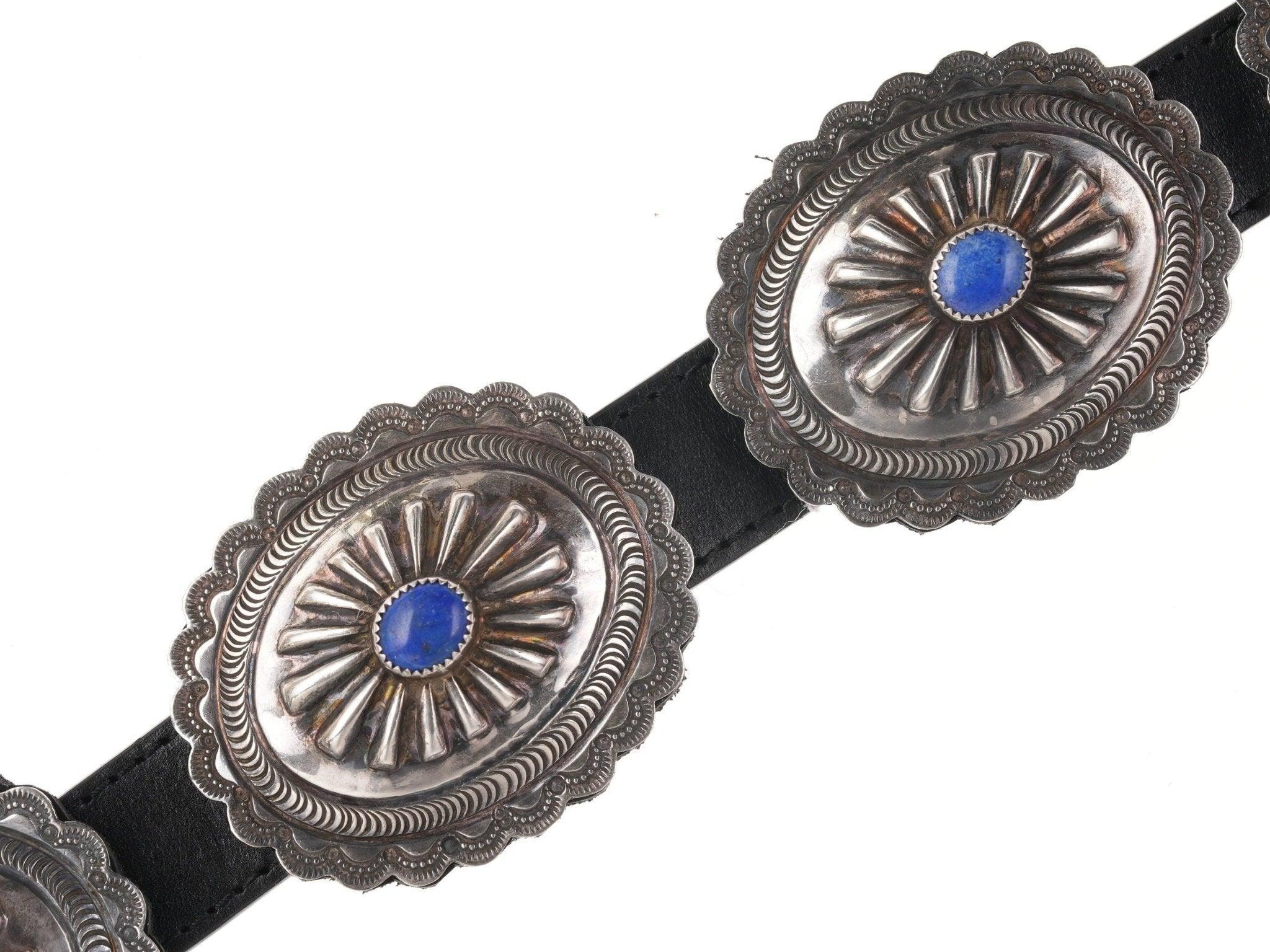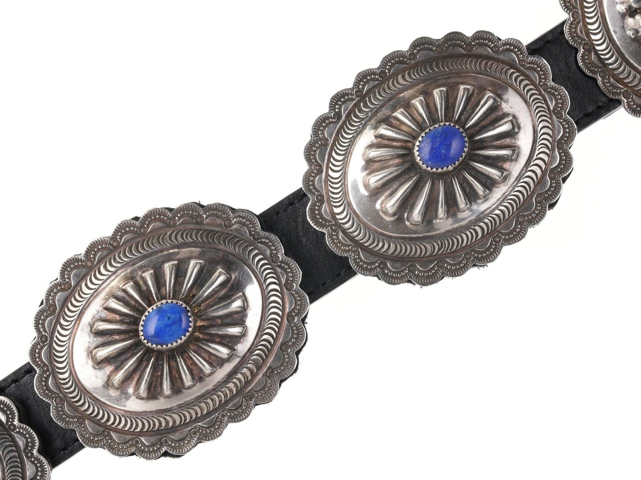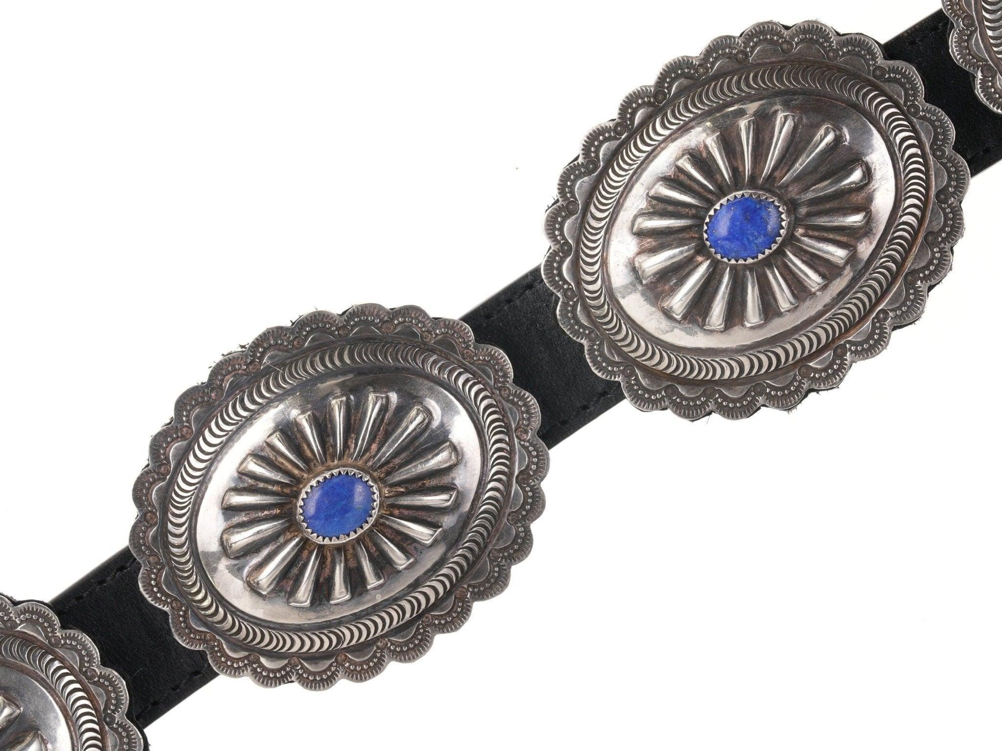 32"-37" Alfred Martinez Navajo Sterling/Lapis Concho belt. Larger Oval buckle and ten matched slightly smaller conchos, each with central blue lapis cabochon within serrated bezel, stampwork accents, on a leather belt, belt: approx 32.75"l (buckle catch to to first hole), approx 36.5" (buckle catch to last hole), buckle: approx 2 5/8"h, 3"w, each concho: approx 2 1/8"h, 2 5/8"w, 448 grams total. No damage or issues with belt or conchos, the quality is amazing on both the stampwork/silverwork and the leather belt.