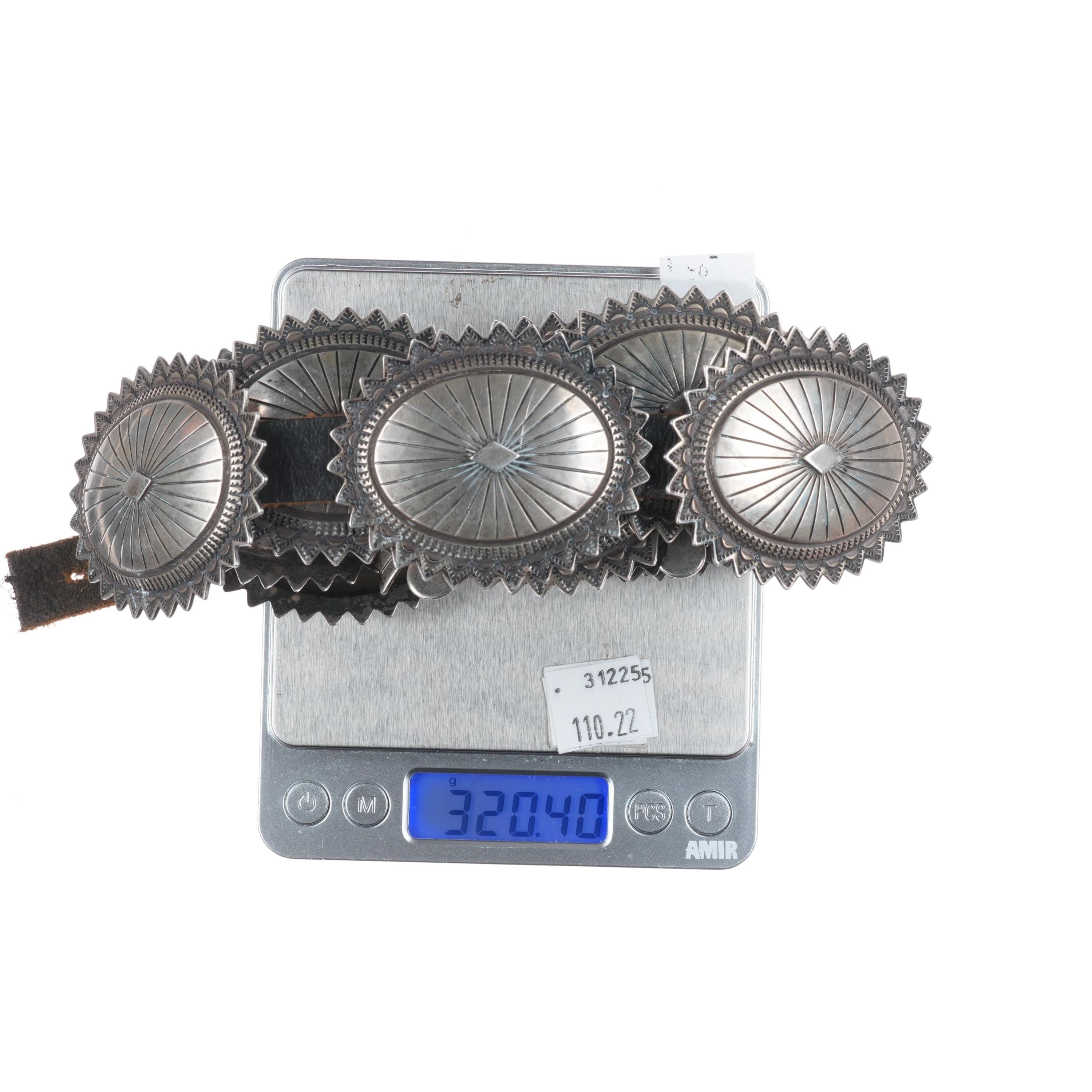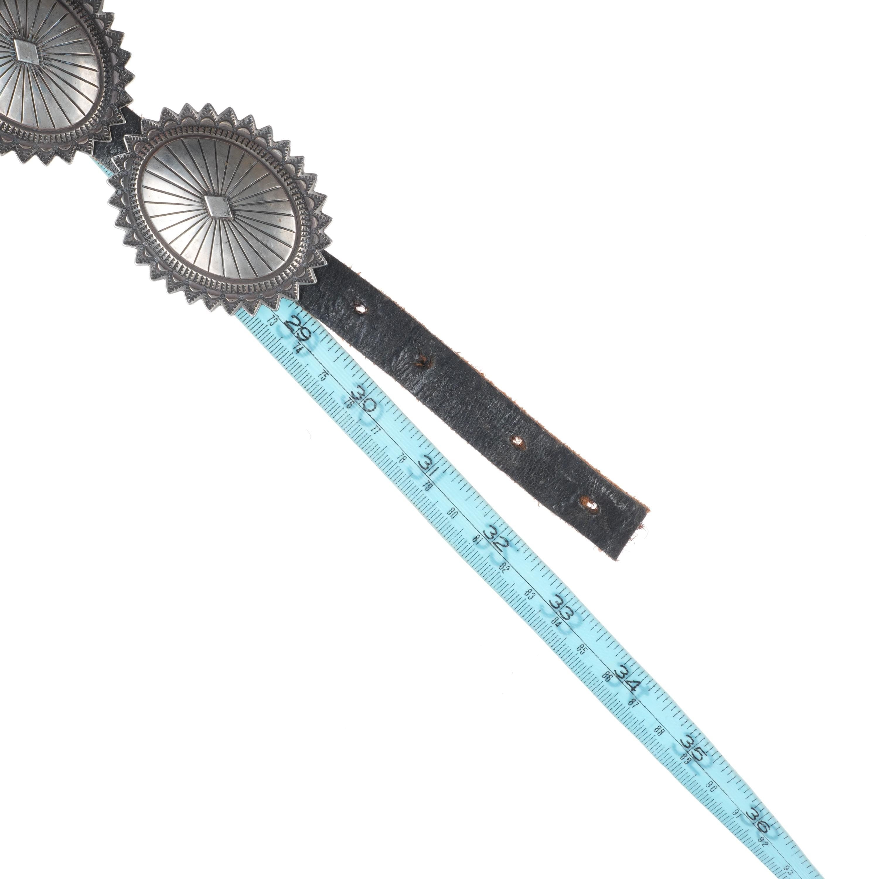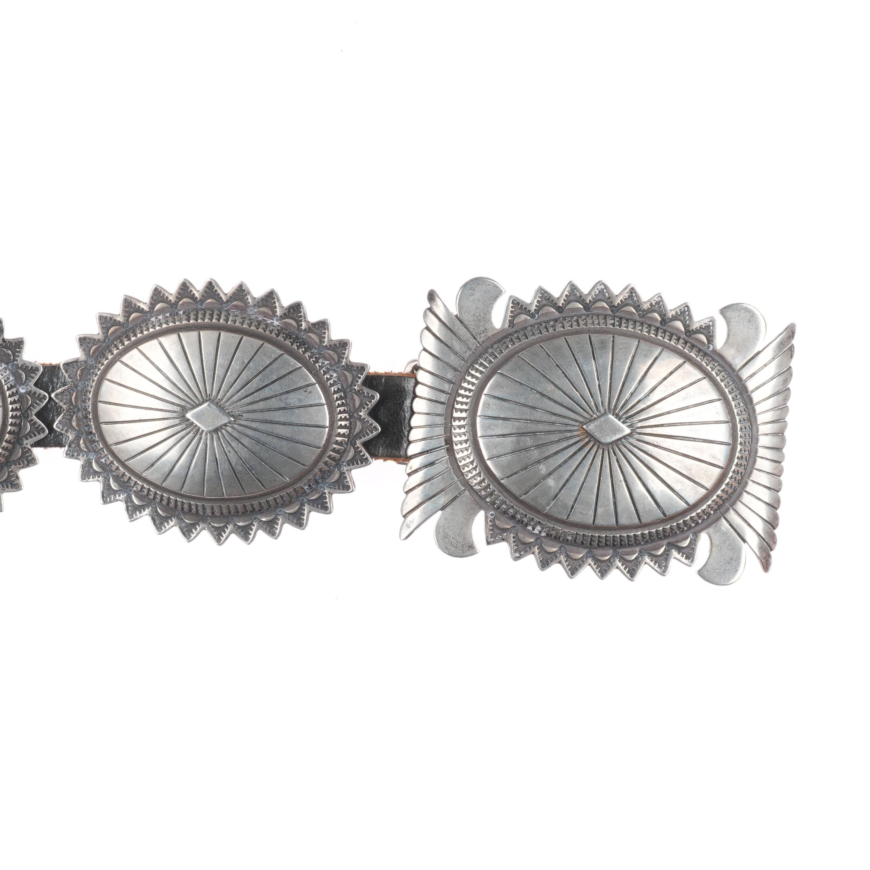 32.5" Curtis Pete Navajo sterling silver deep stamped concho belt Fits up to a 32.5" waist but obviously could be worn shorter. Tape measure shown in pics.. Weight and measurements in pictures. No damage or issues, tested and guaranteed solid sterling silver. 10 Conchos and one buckle, circa last quarter of the 20th century, hallmarked as shown.
