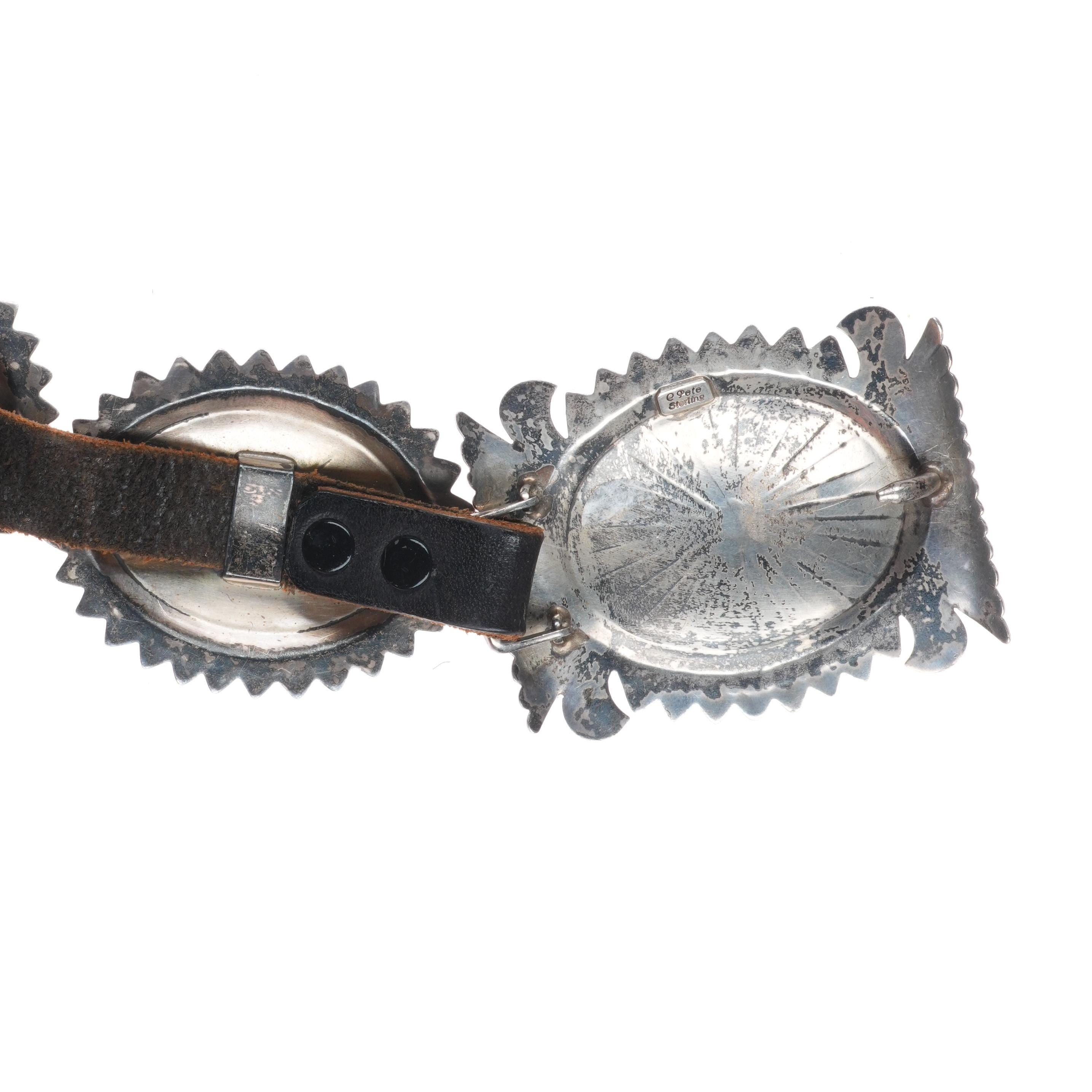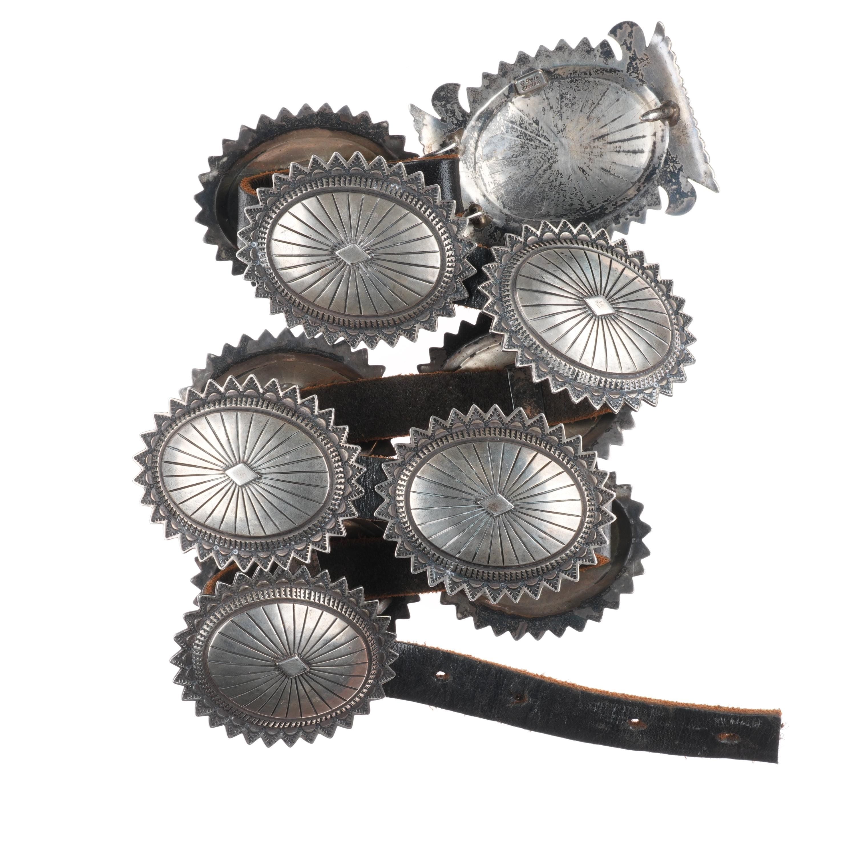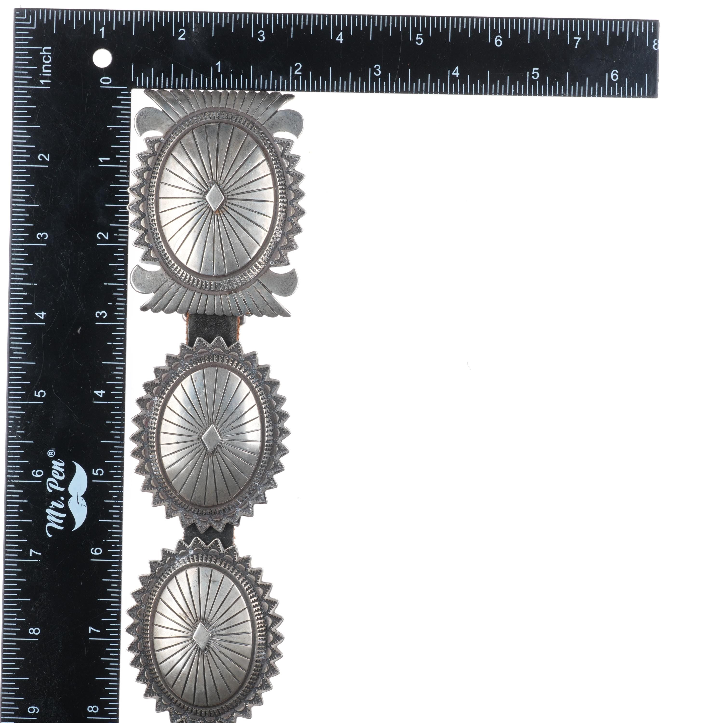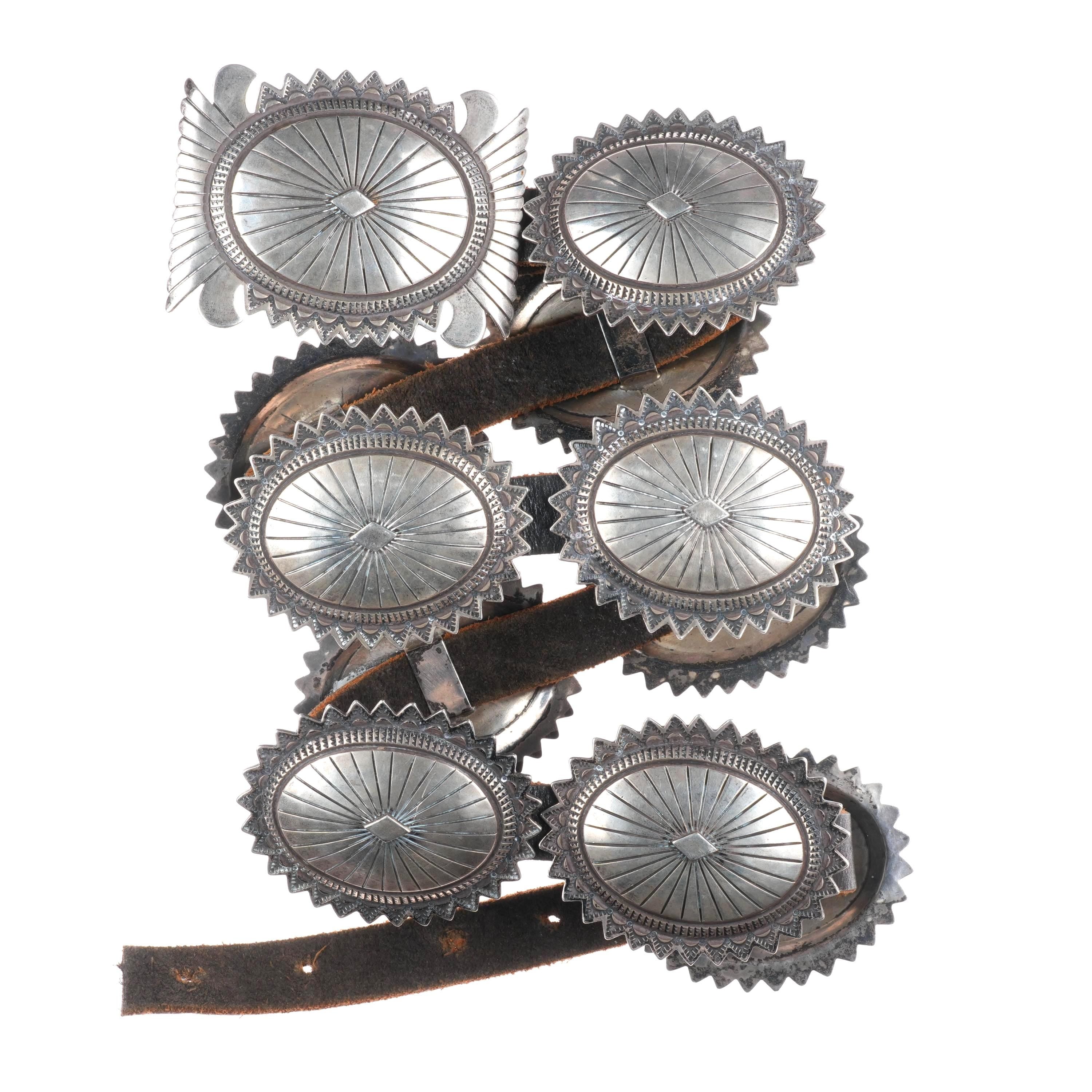 32.5" Curtis Pete Navajo sterling silver deep stamped concho belt Fits up to a 32.5" waist but obviously could be worn shorter. Tape measure shown in pics.. Weight and measurements in pictures. No damage or issues, tested and guaranteed solid sterling silver. 10 Conchos and one buckle, circa last quarter of the 20th century, hallmarked as shown.