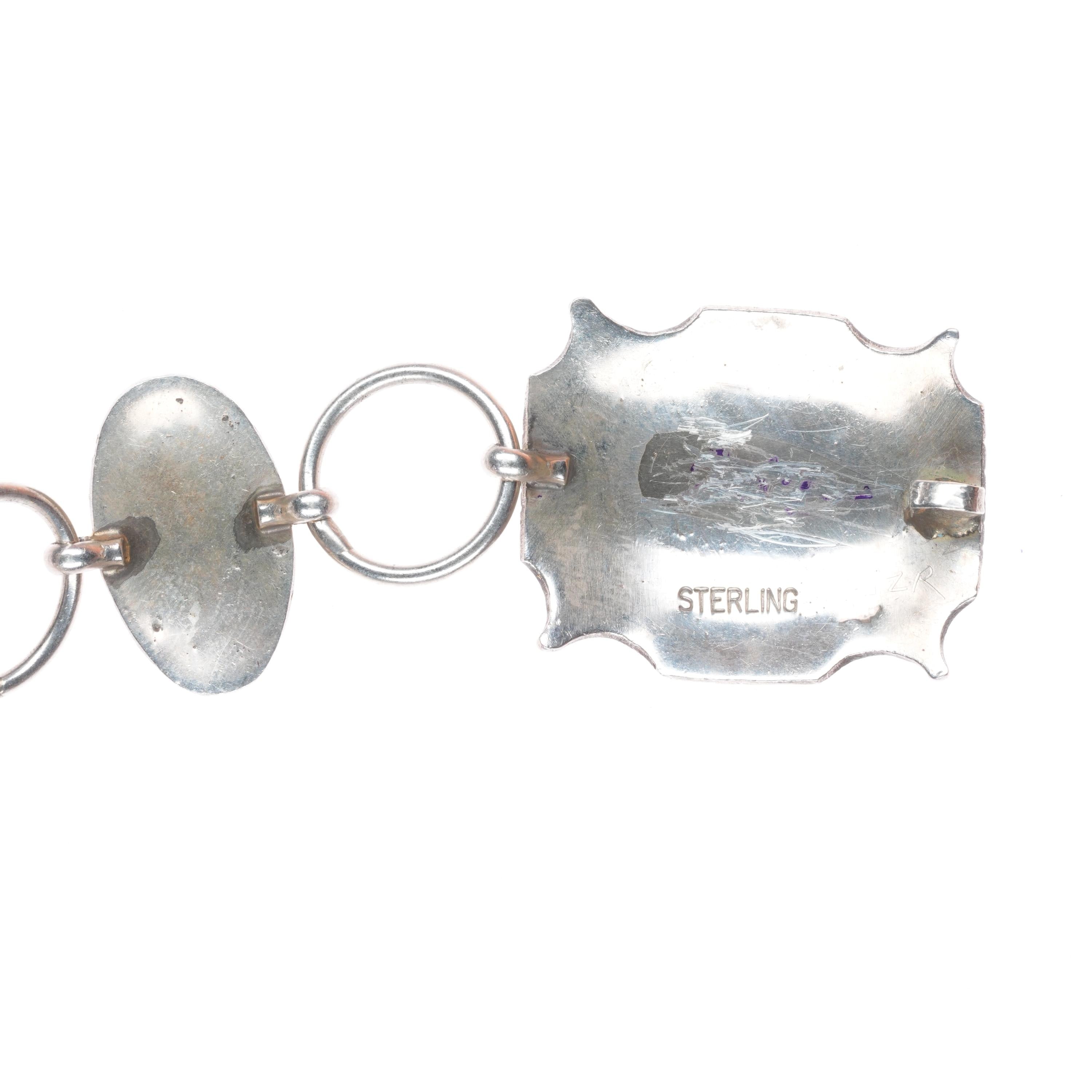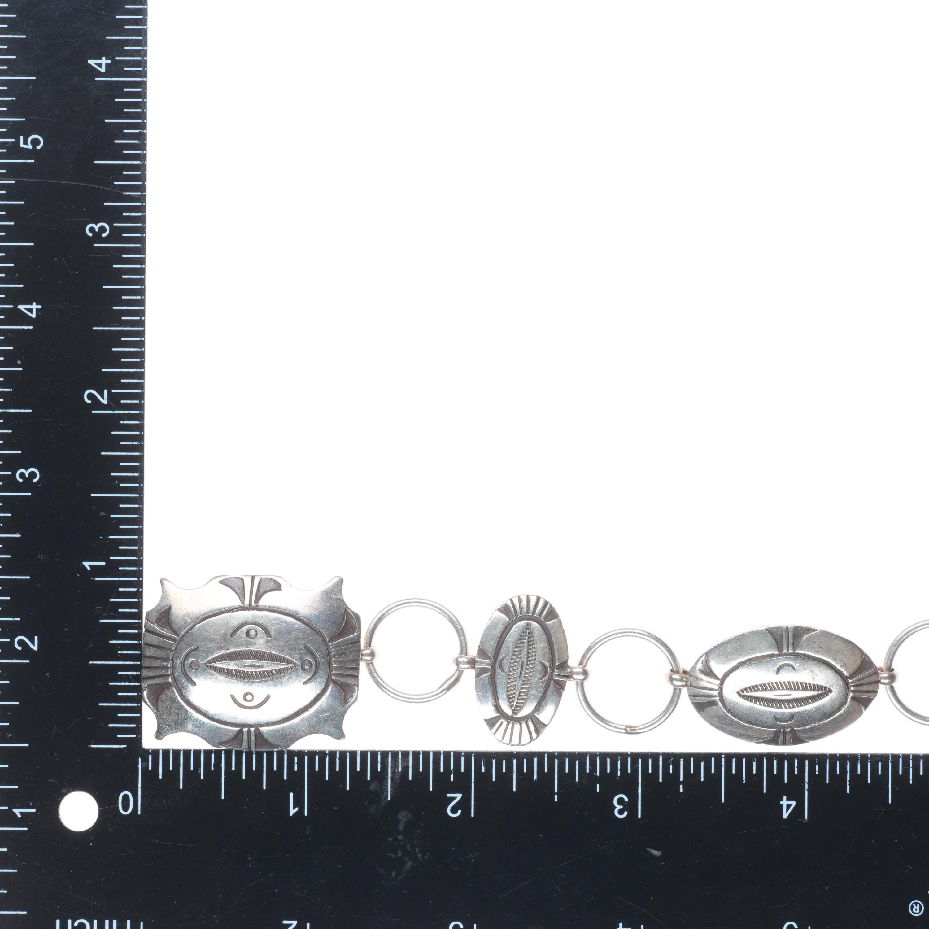 32" c1950 Vintage Navajo sterling silver hand stamped link concho belt. Tested and guaranteed solid sterling silver with weight and measurements in pictures. Fully functional. Fits up to a 32" waist but can be hooked shorter. Circa mid 20th century.