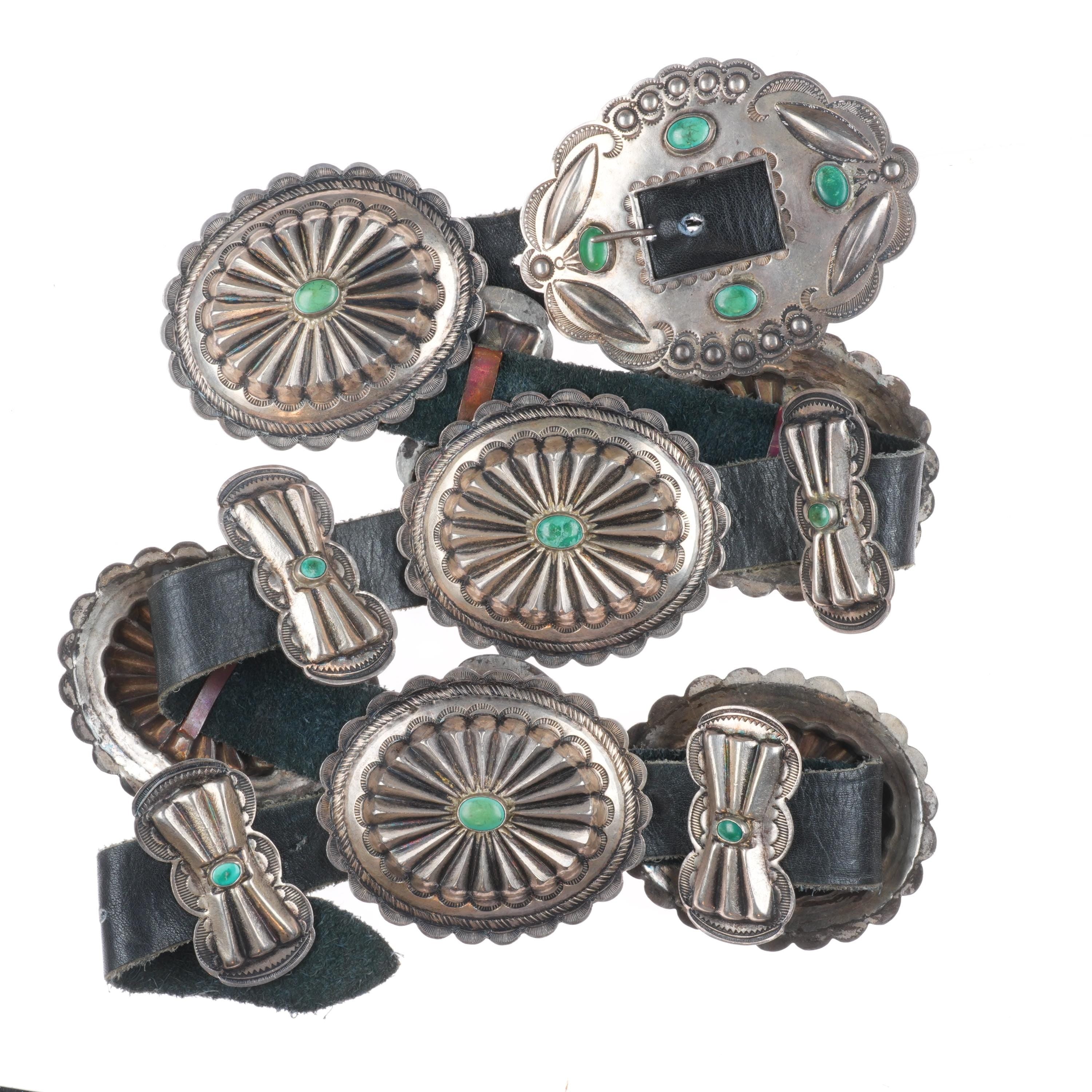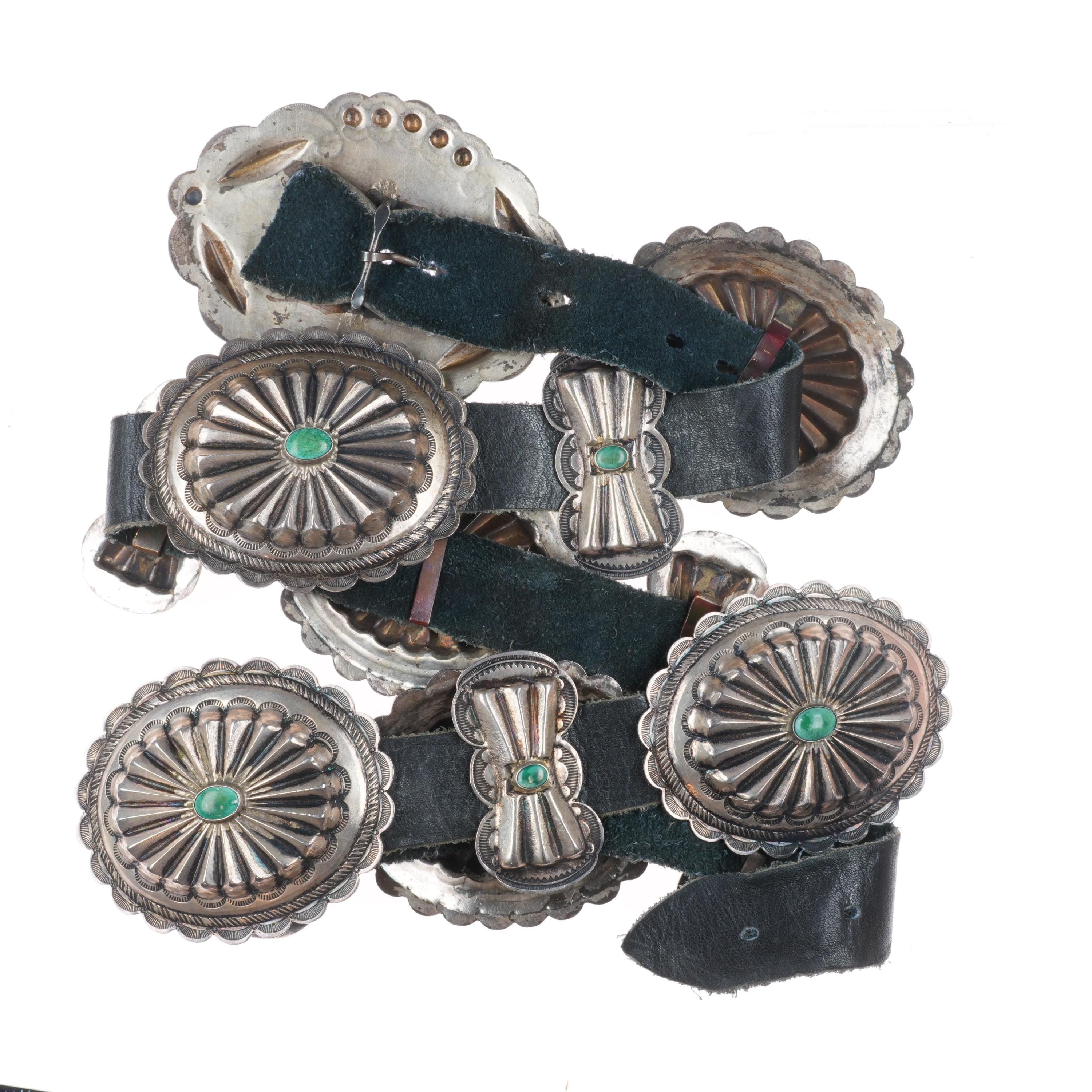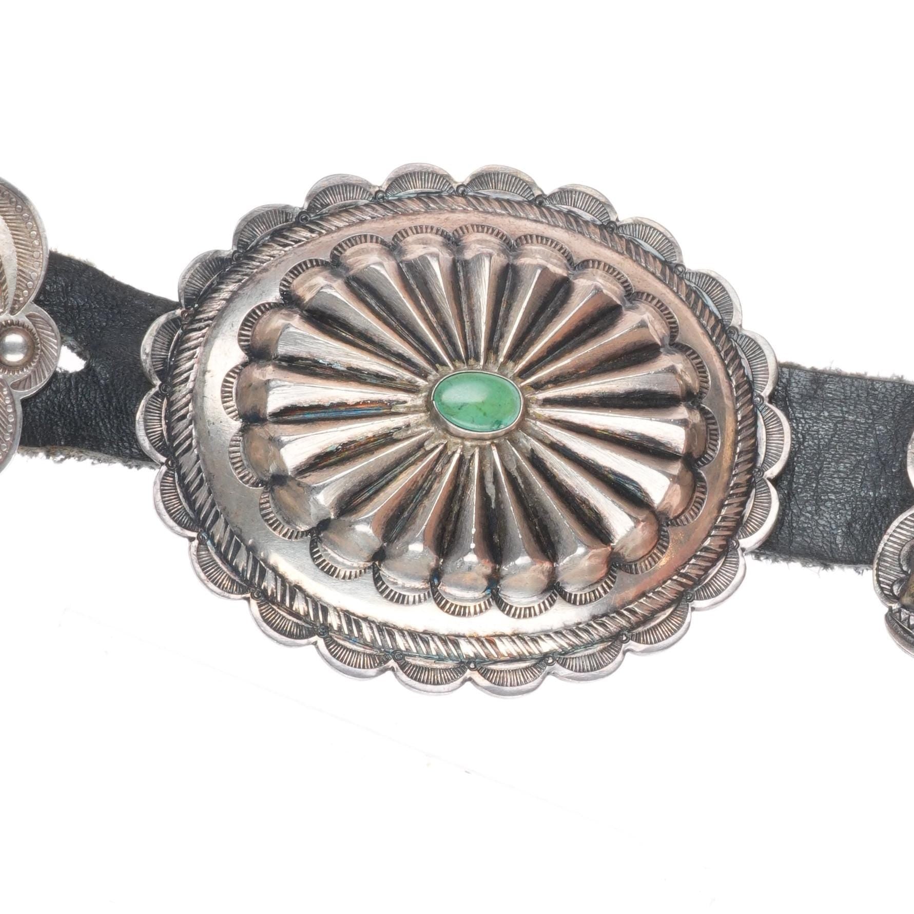 33" Vintage Navajo turquoise hand stamped sterling silver butterfly concho belt . Tested and guaranteed solid sterling silver with weight and measurements in pictures. Fully functional. Fits up to a 33" waist with added holes, great condition, circa second quarter of the 20th century. 6 butterfly conchos, 6 Conchos, 1 buckle.