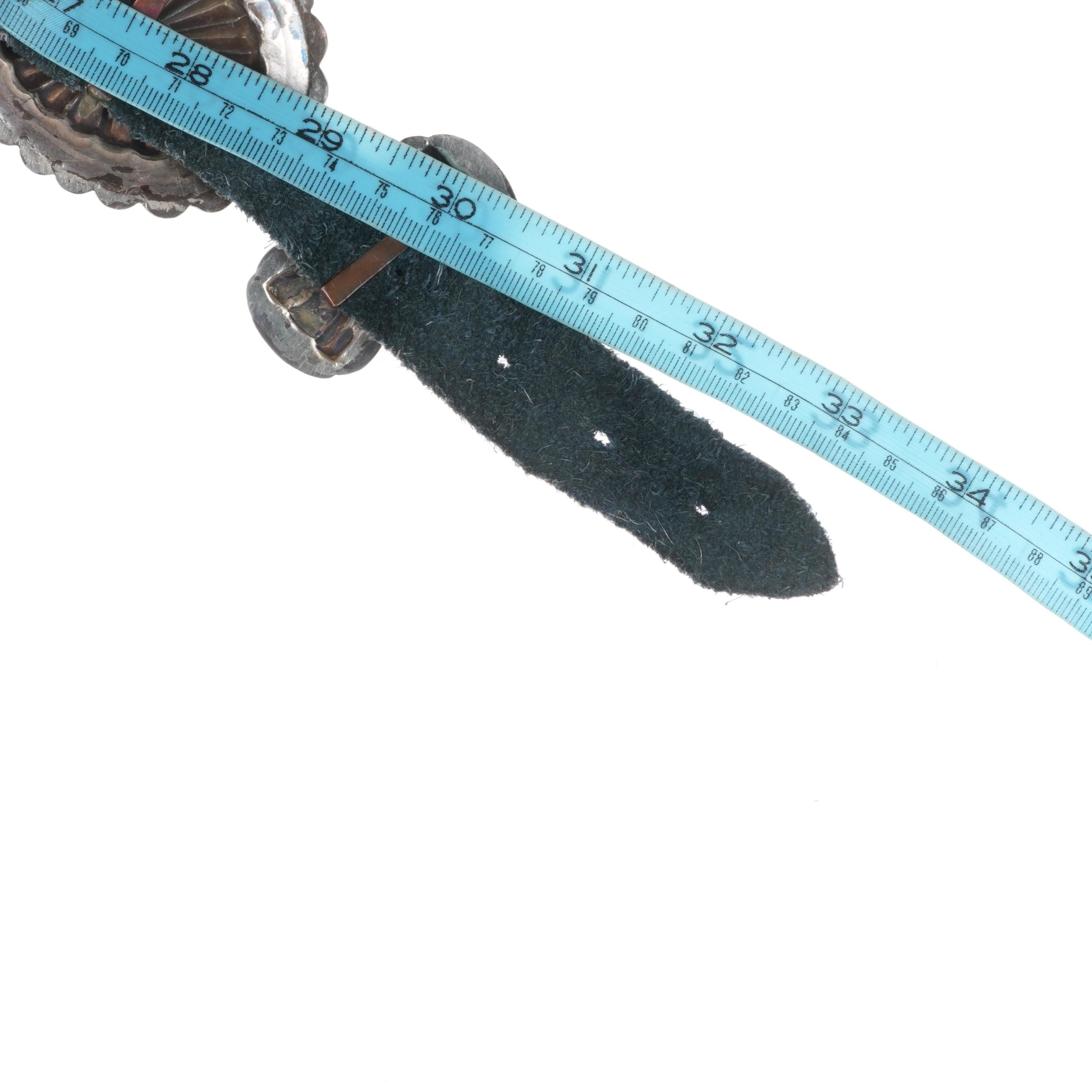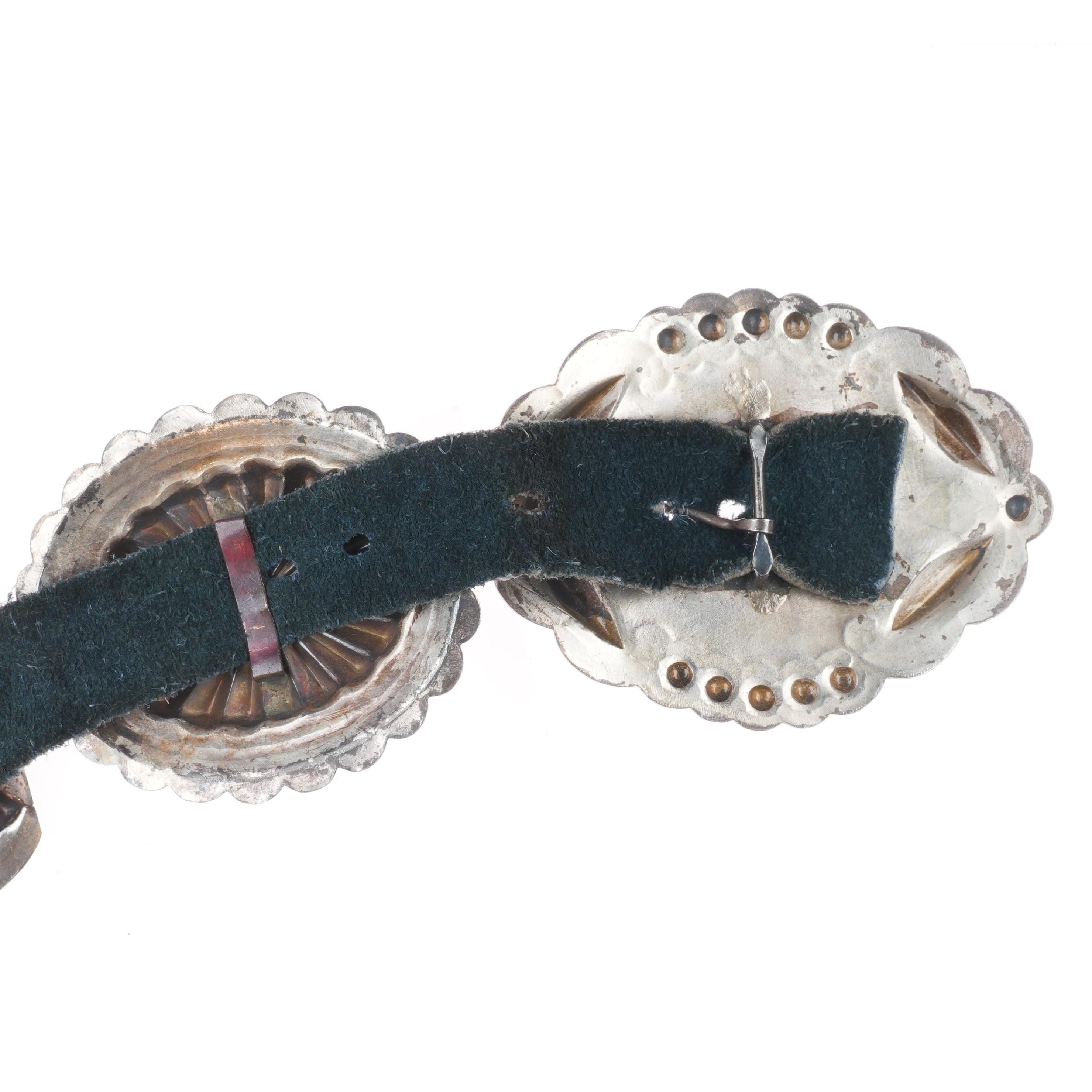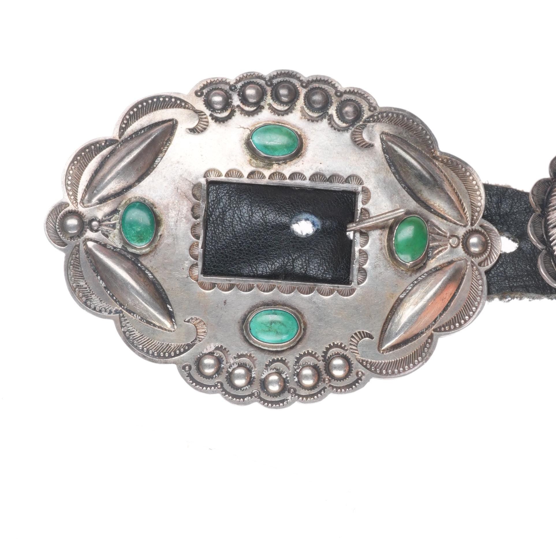 33" Vintage Navajo turquoise hand stamped sterling silver butterfly concho belt . Tested and guaranteed solid sterling silver with weight and measurements in pictures. Fully functional. Fits up to a 33" waist with added holes, great condition, circa second quarter of the 20th century. 6 butterfly conchos, 6 Conchos, 1 buckle.
