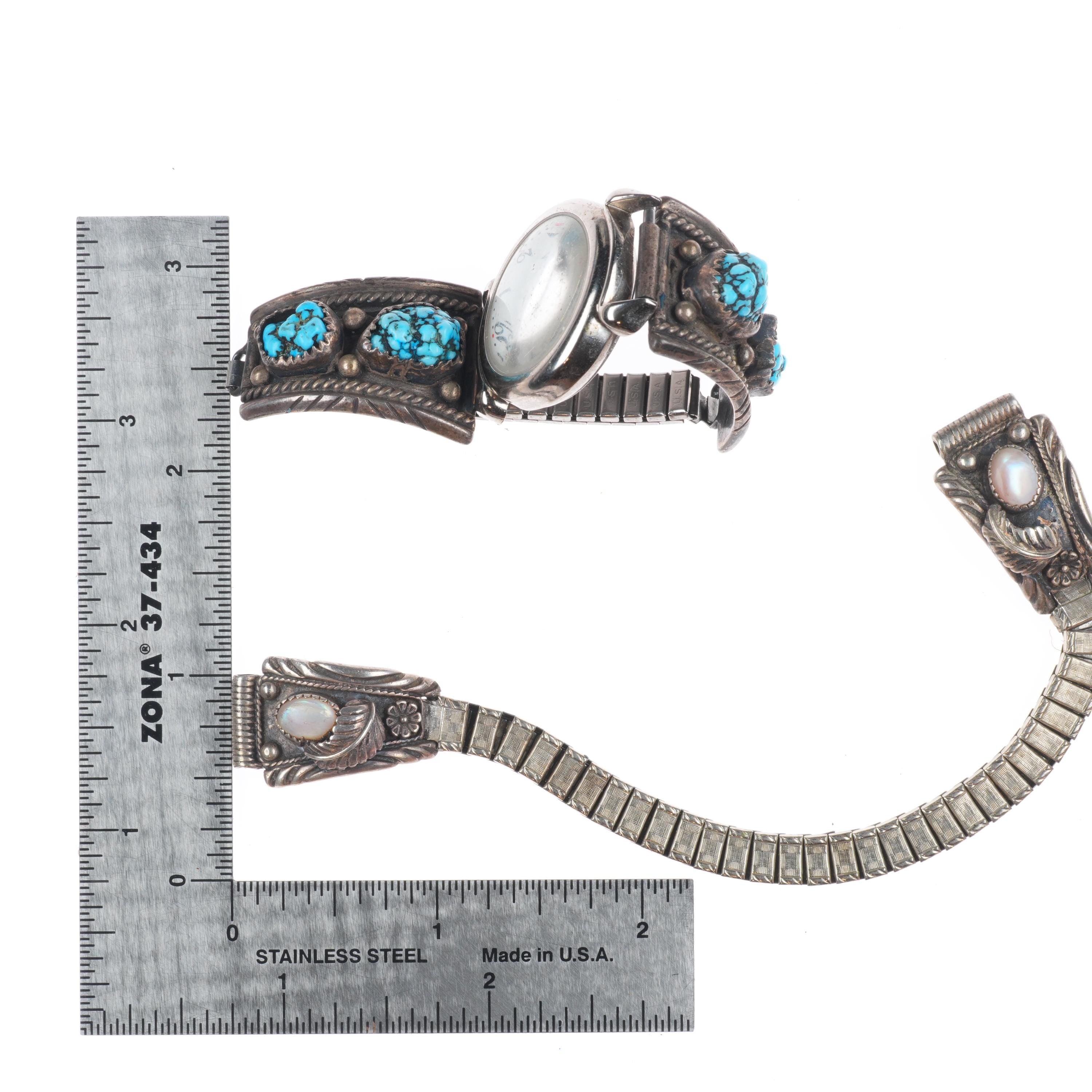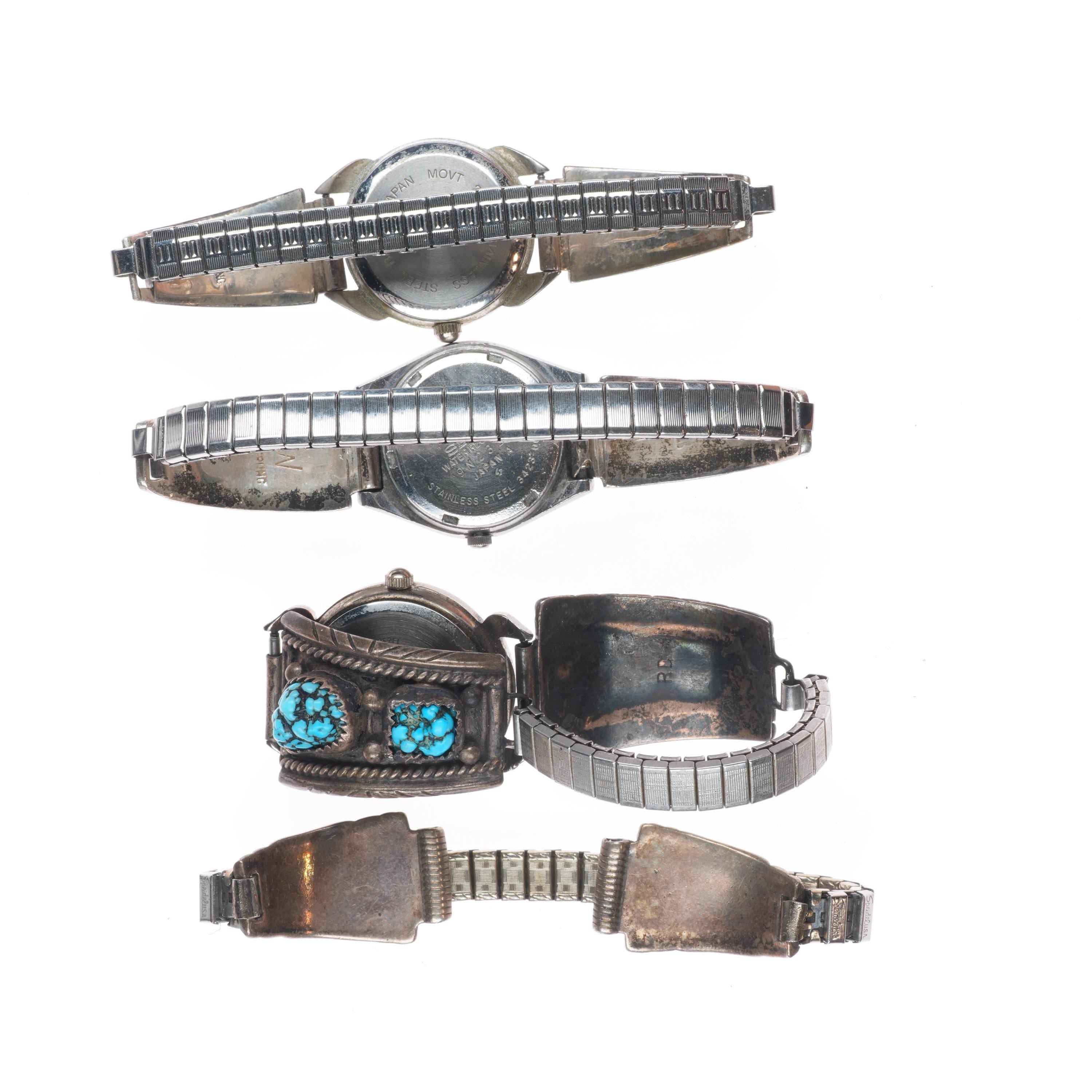 4 Vintage Navajo sterling silver channel inlay/turquoise ladies watch tips. Selling the watch bracelets shown, tested and guaranteed solid sterling silver. Weight and measurements in pictures. Marked as shown. Stretchy band is not sterling, watches are not sterling. Watches are untested and will at least need a battery. Selling all 4 shown with measurements in pictures.