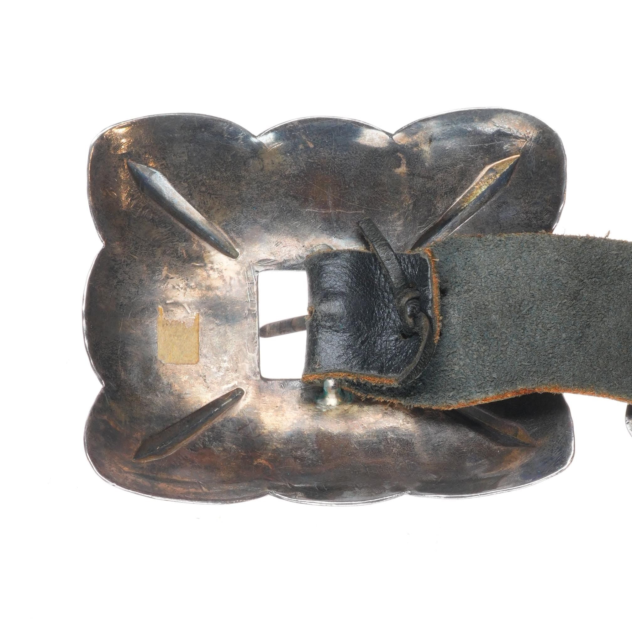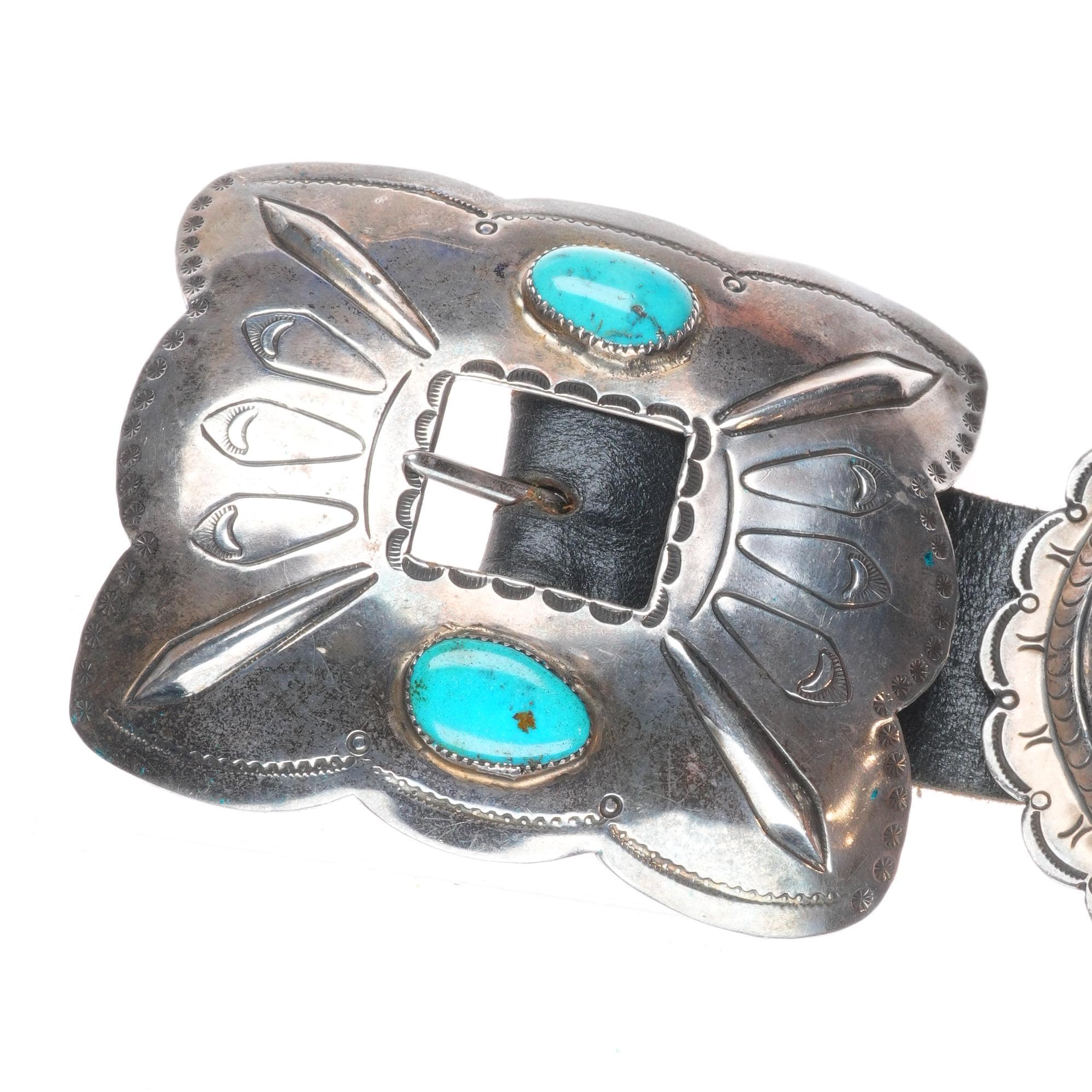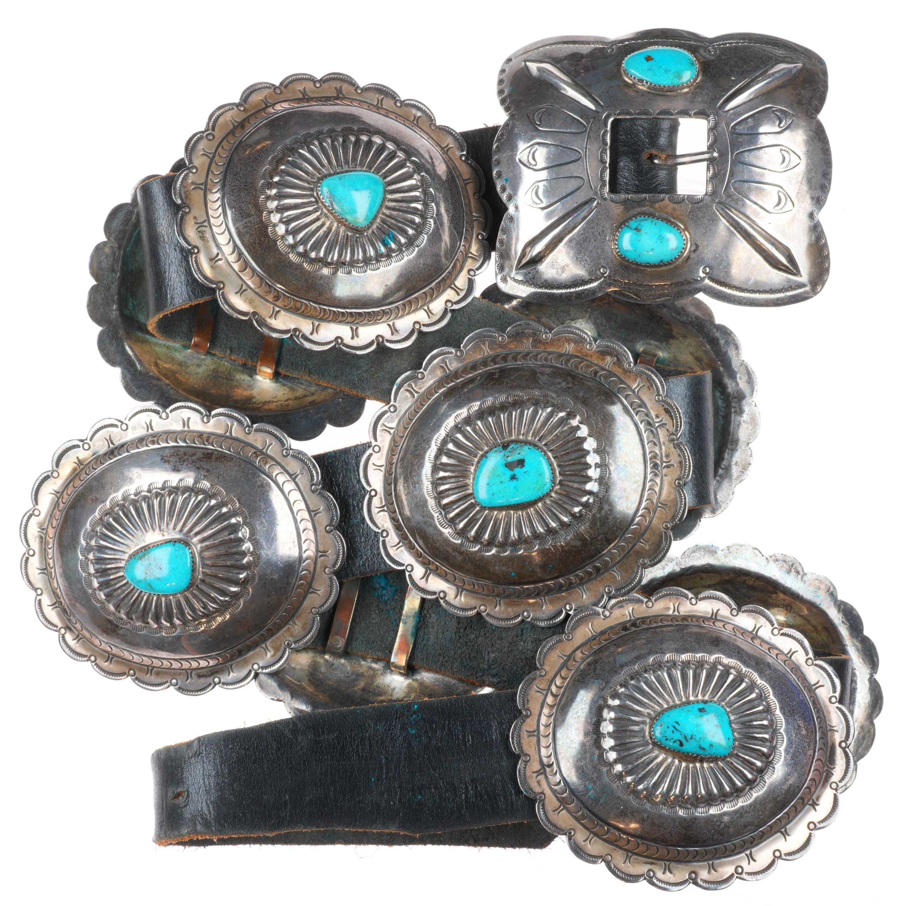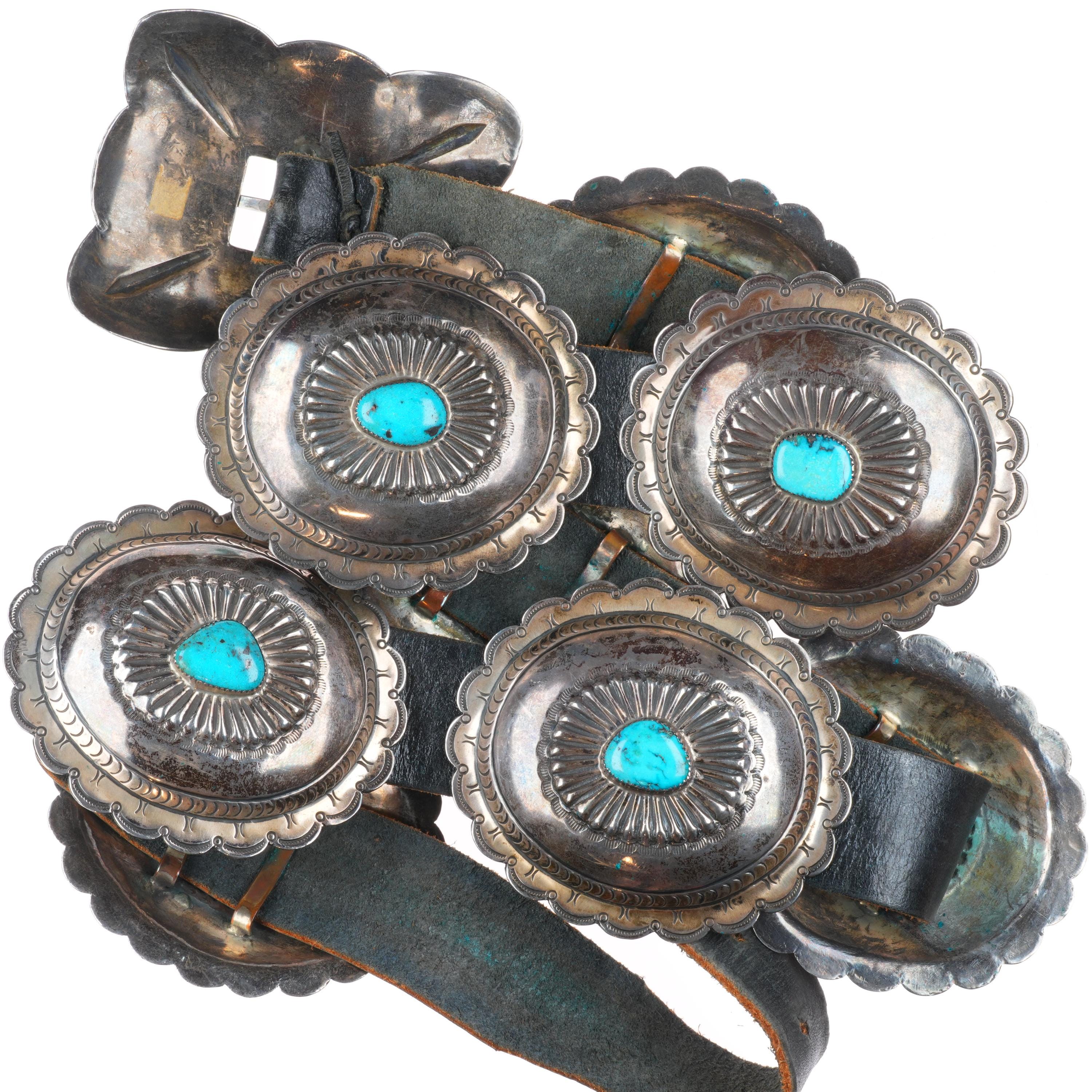 42" Heavy vintage Navajo sterling silver/turquoise hand stamped concho belt. Tested and guaranteed solid sterling silver with weight and measurements in pictures. Fully functional. Fits up to a 42" waist with added holes, great condition, circa mid 20th century. 8 Conchos, 1 buckle.