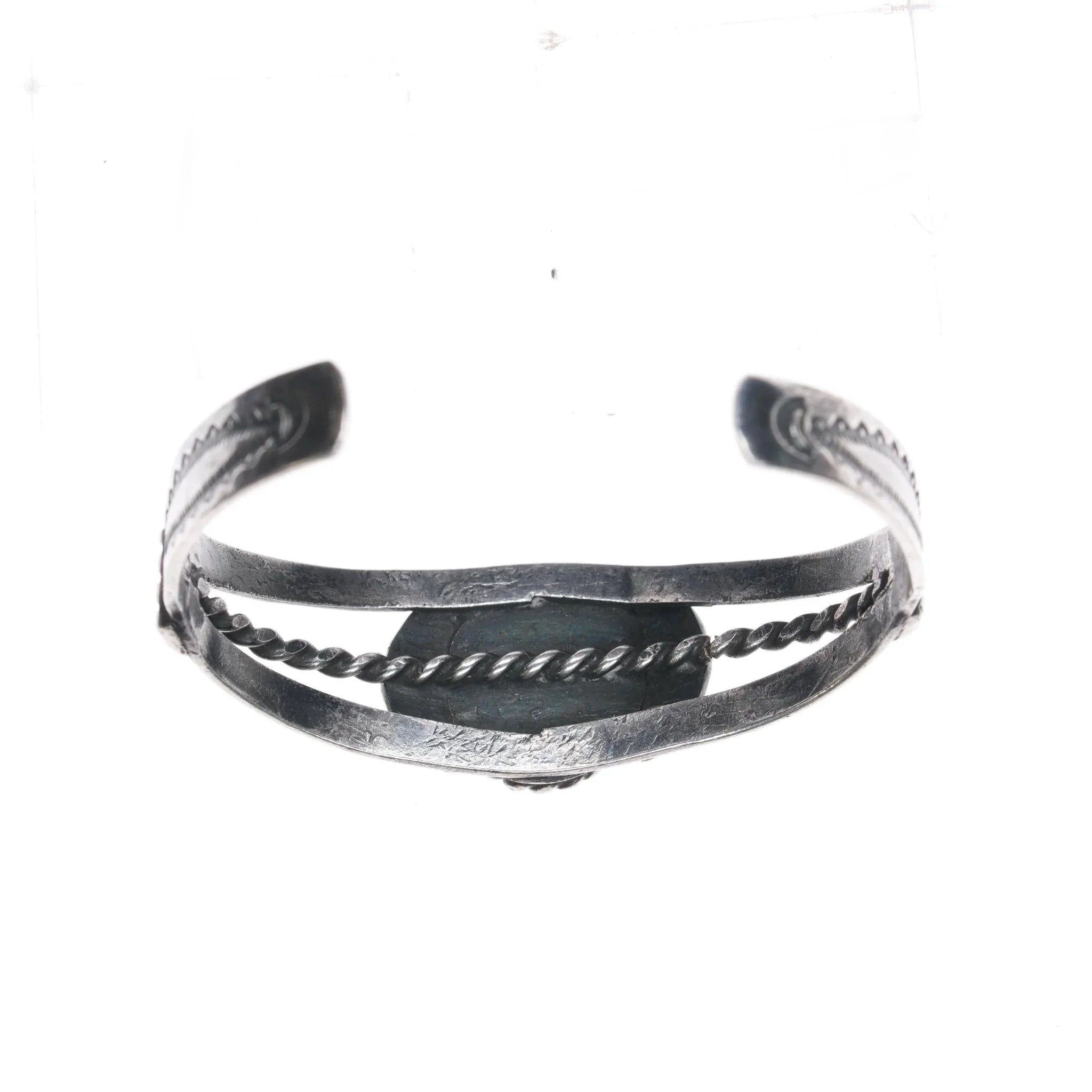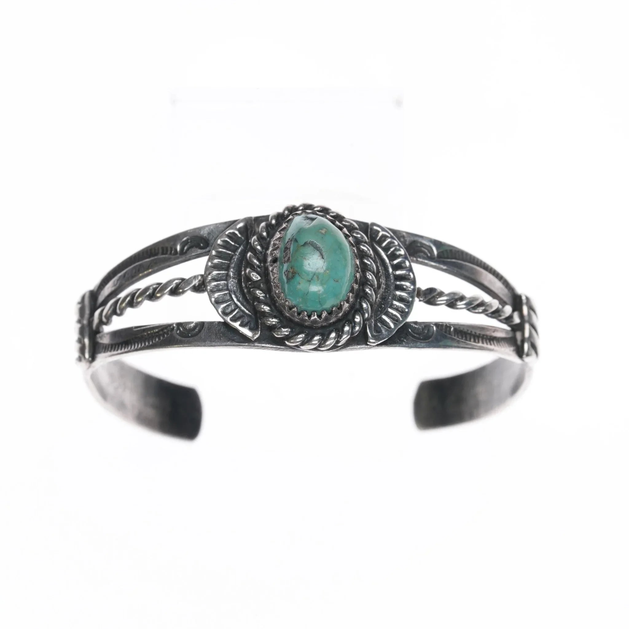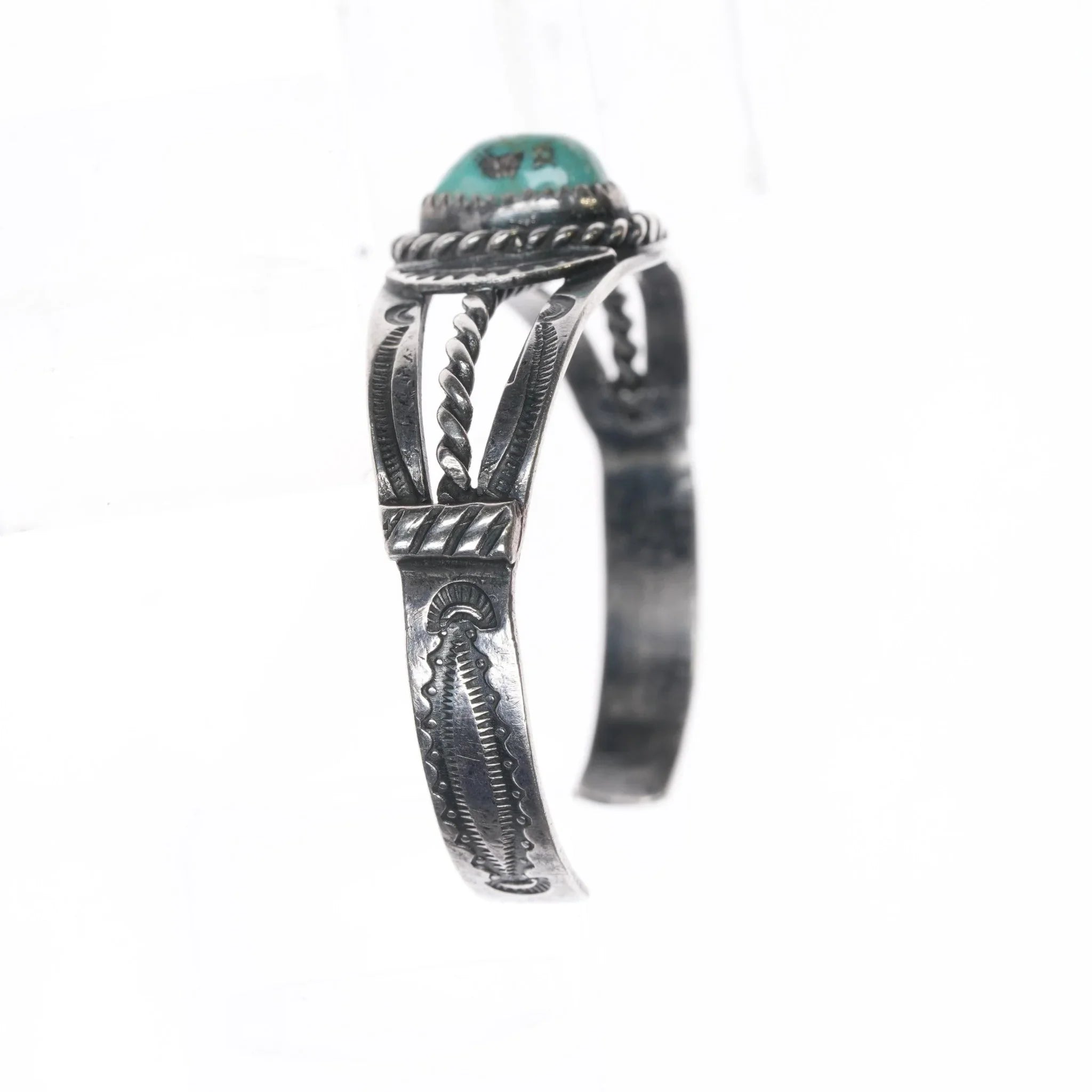 5 1/8" 1940‘s Navajo hand stamped silver cuff bracelet with turquoise. Solid silver, weights and measurements in pics.