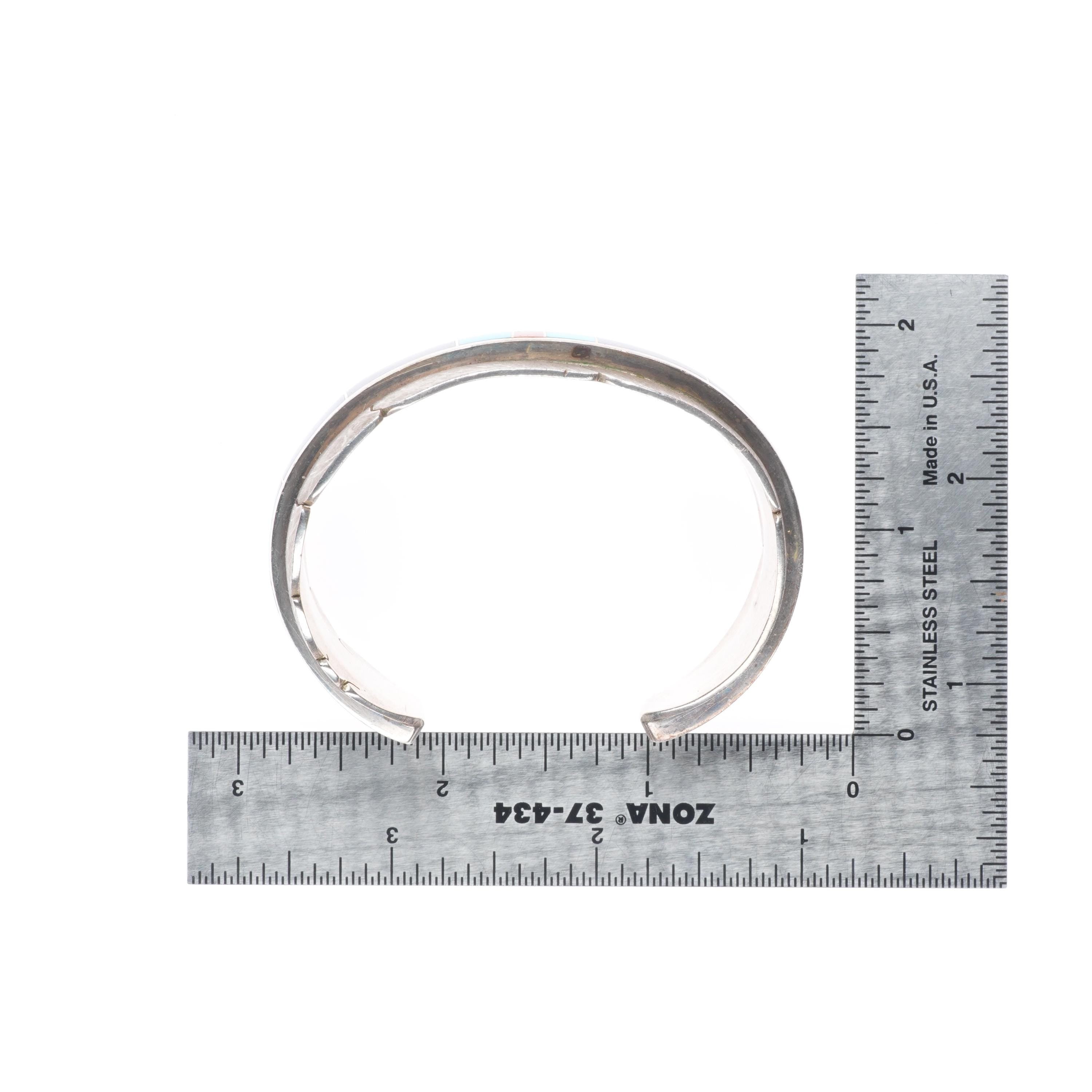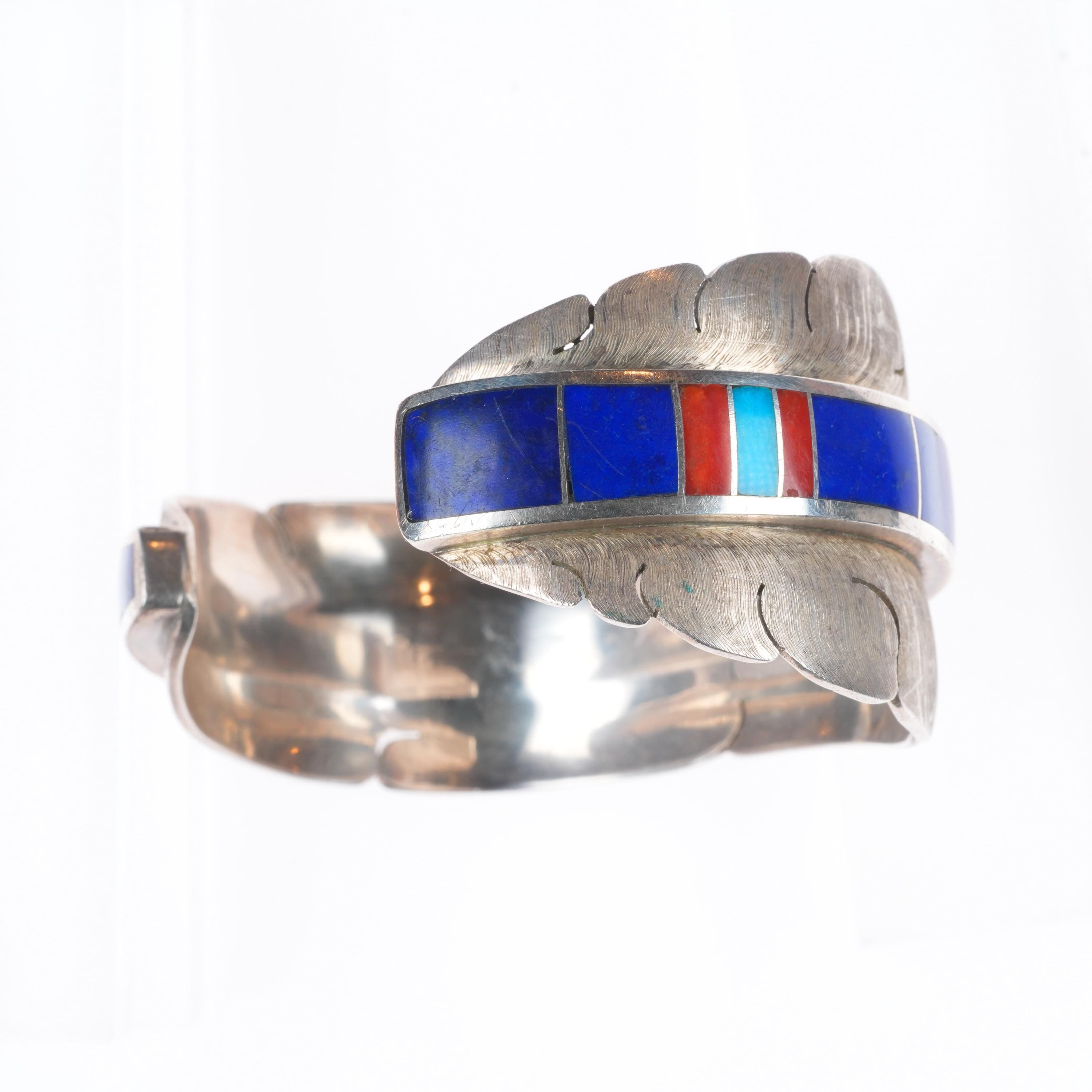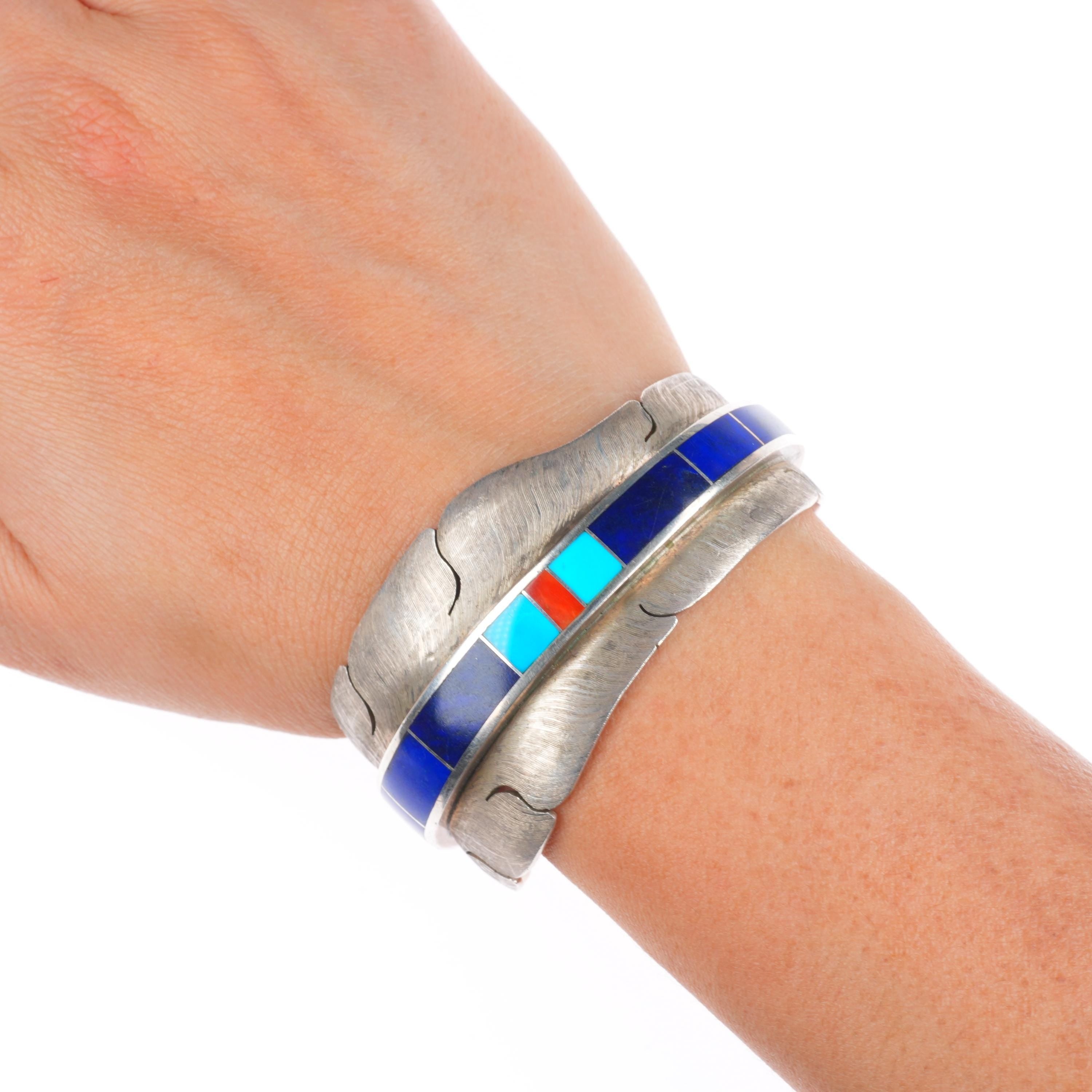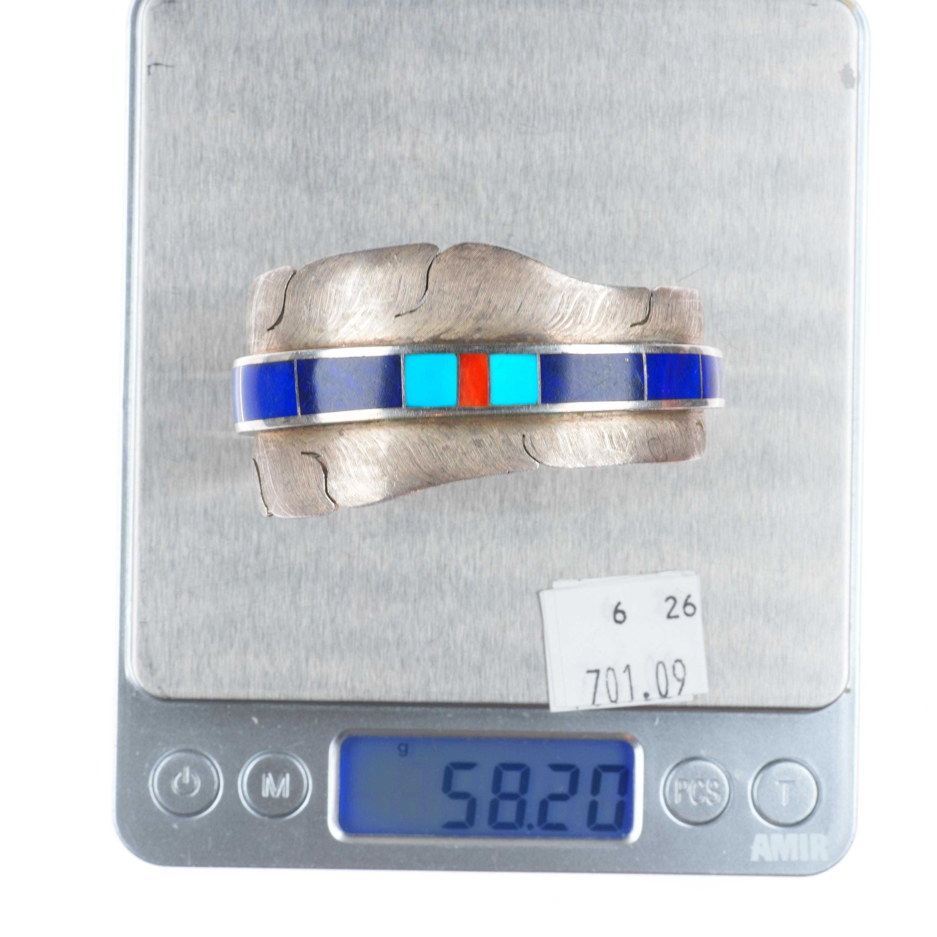 6.1" Michael Kirk Isleta sterling silver lapis/coral/turquoise cuff bracelet. Tested and guaranteed solid sterling silver with weight and measurements in pictures. Great condition with age appropriate wear, circa last quarter of the 20th century.