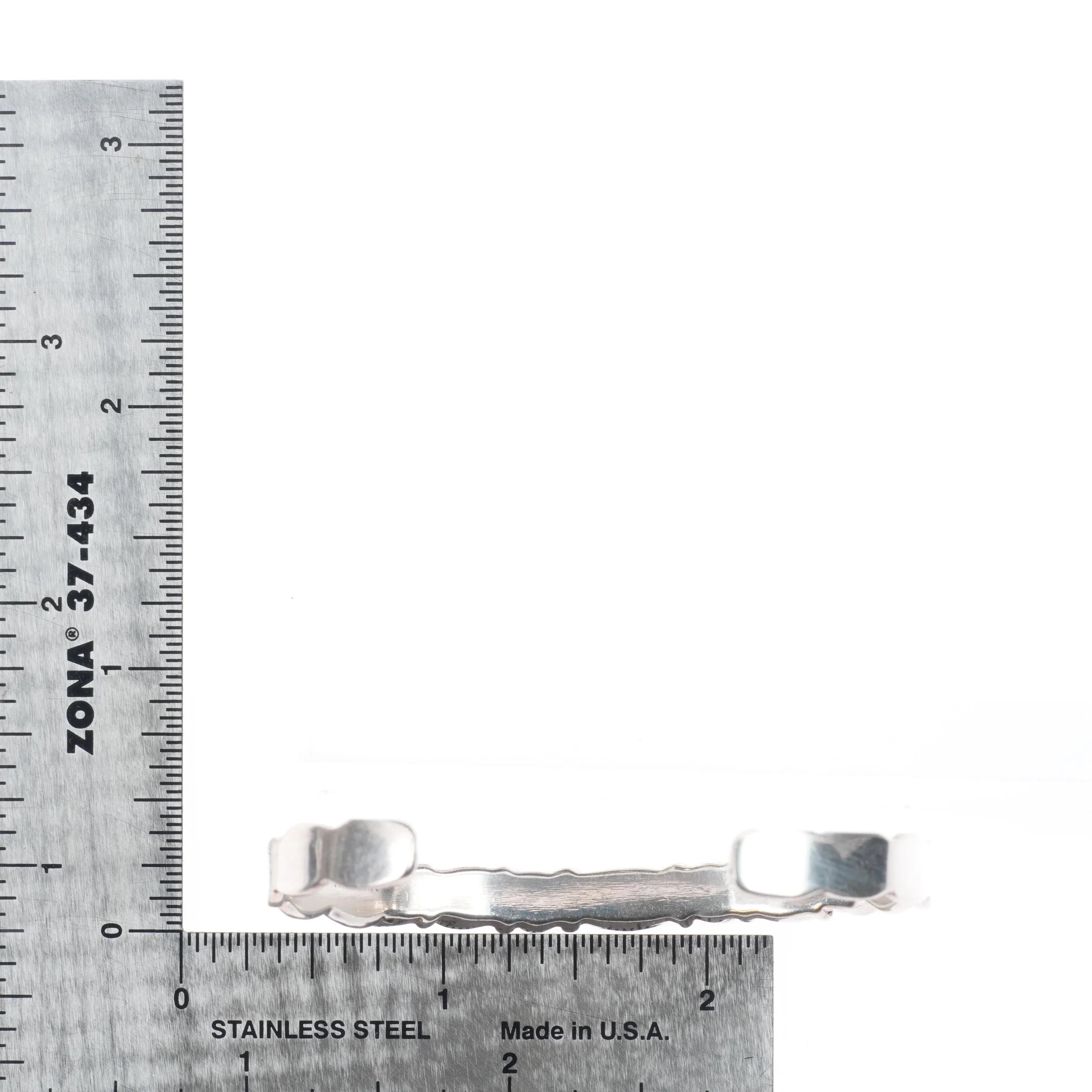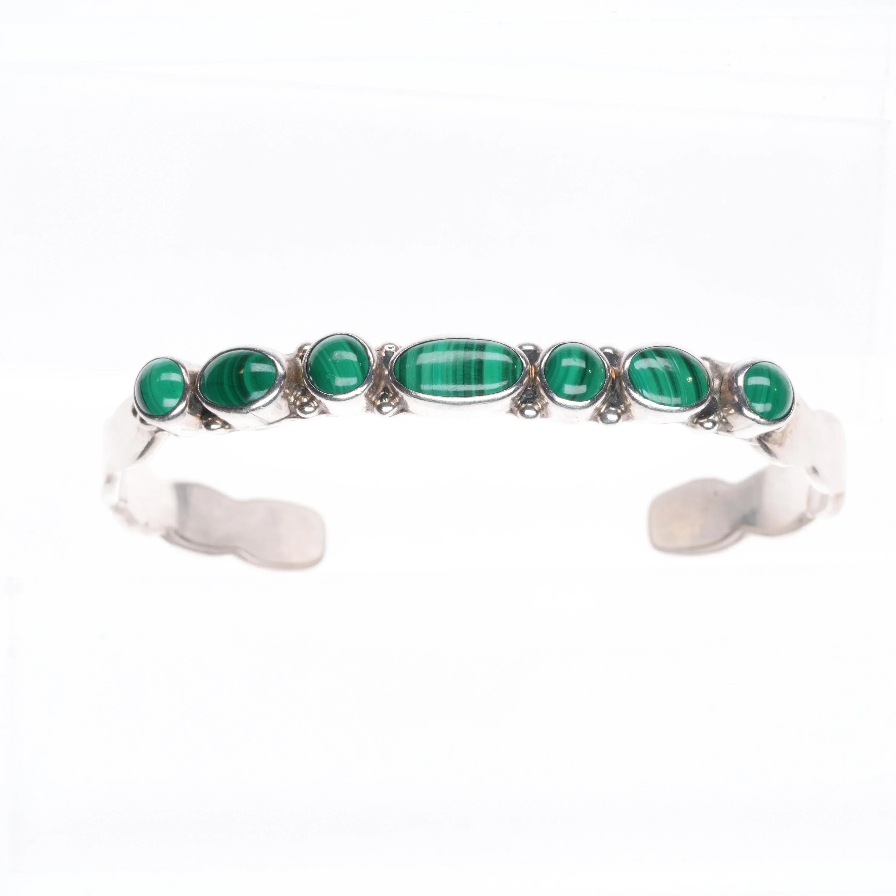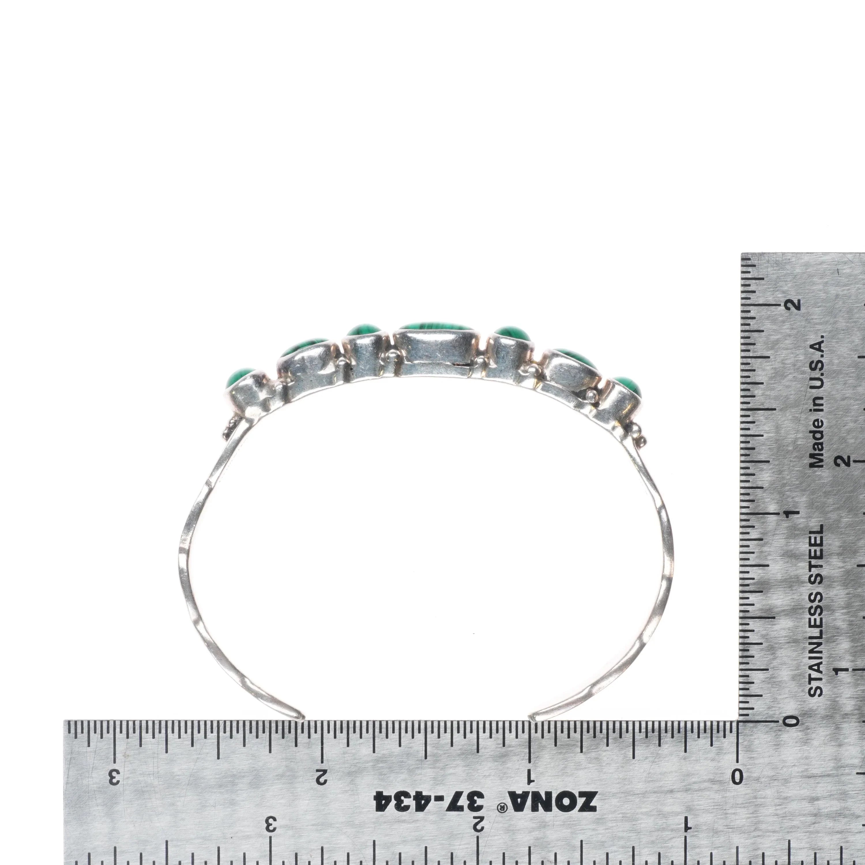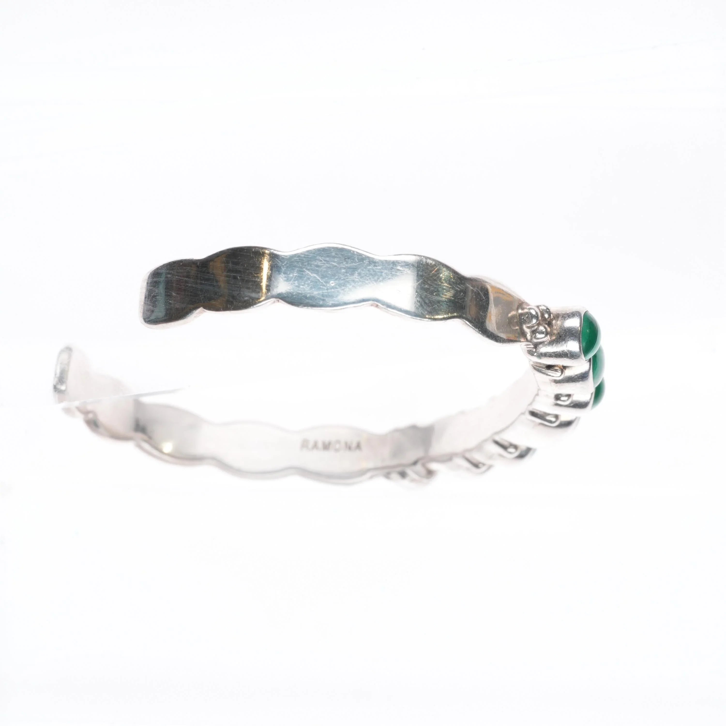 6.1" Ramona Loloma Hopi sterling silver malachite row cuff bracelet. Tested and guaranteed solid sterling silver with weight and measurements in pictures. Good condition, circa last quarter of the 20th century with no damage.