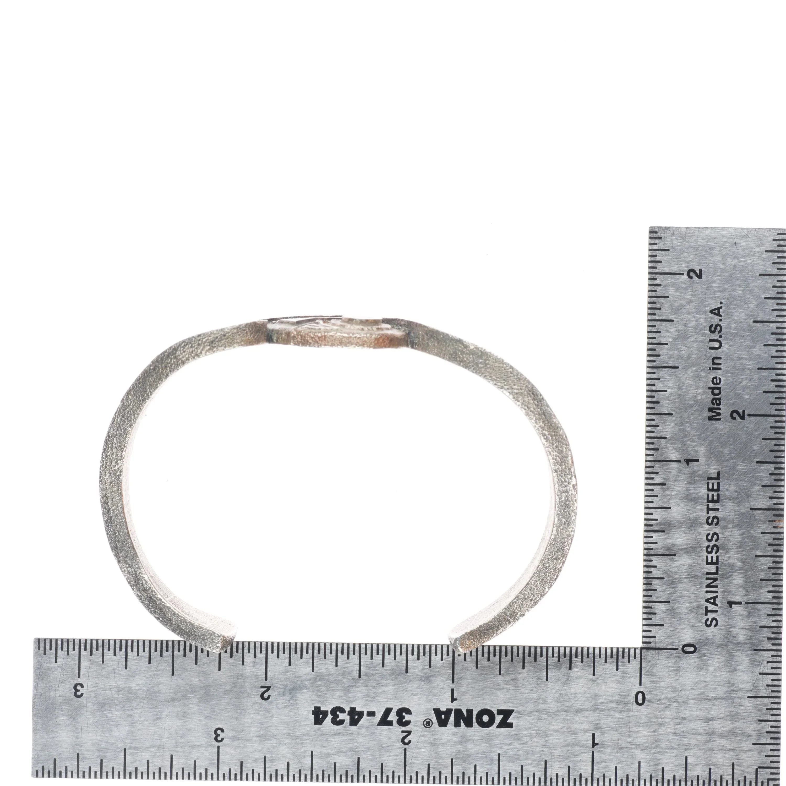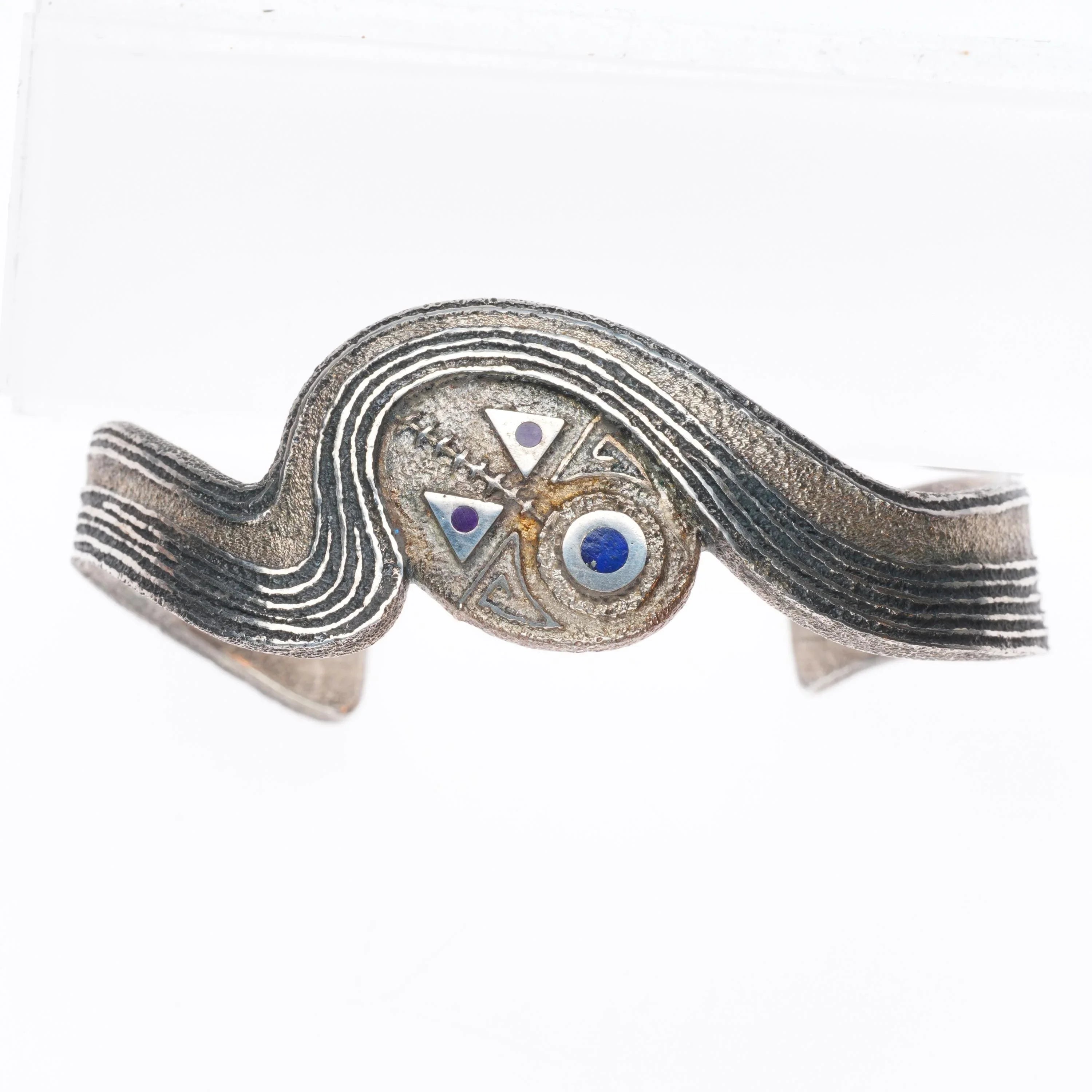 6.1" Ric Charlie Navajo Tufa Cast sterling silver sugilite/lapis Yei cuff bracelet. Tested and guaranteed solid sterling silver with weight and measurements in pictures. Circa last quarter of the 20th century, collected and possibly never worn. Fantastic bracelet as shown.