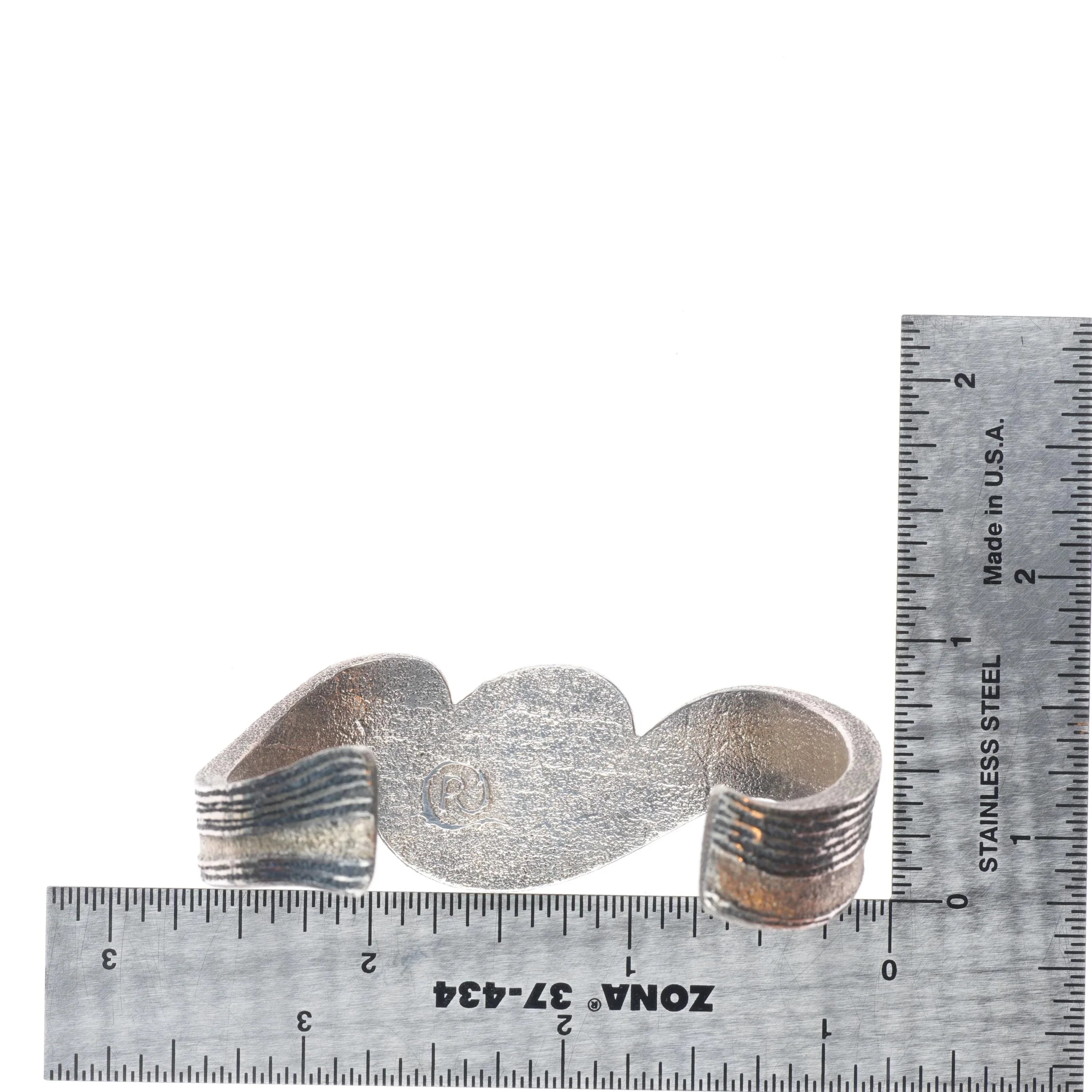 Ric Charlie is noted for his fine tufa cast work. His jewelry often has added colorful patinas in shades of gold, rust, red, purple, blue, and green, achieved by adding liver of sulfur to the silver. His pieces use Navajo landscape scenes, Yei Bi’Ci’s spiritual figures, and sand painting designs. The fine lines in his jewelry are accomplished by incising the tufa stone with the dental tools Ric has used for over 20 years. He uses a wide range of techniques, including mosaic, channel inlay, and set natural stones. Ric is also a painter and sculptor.