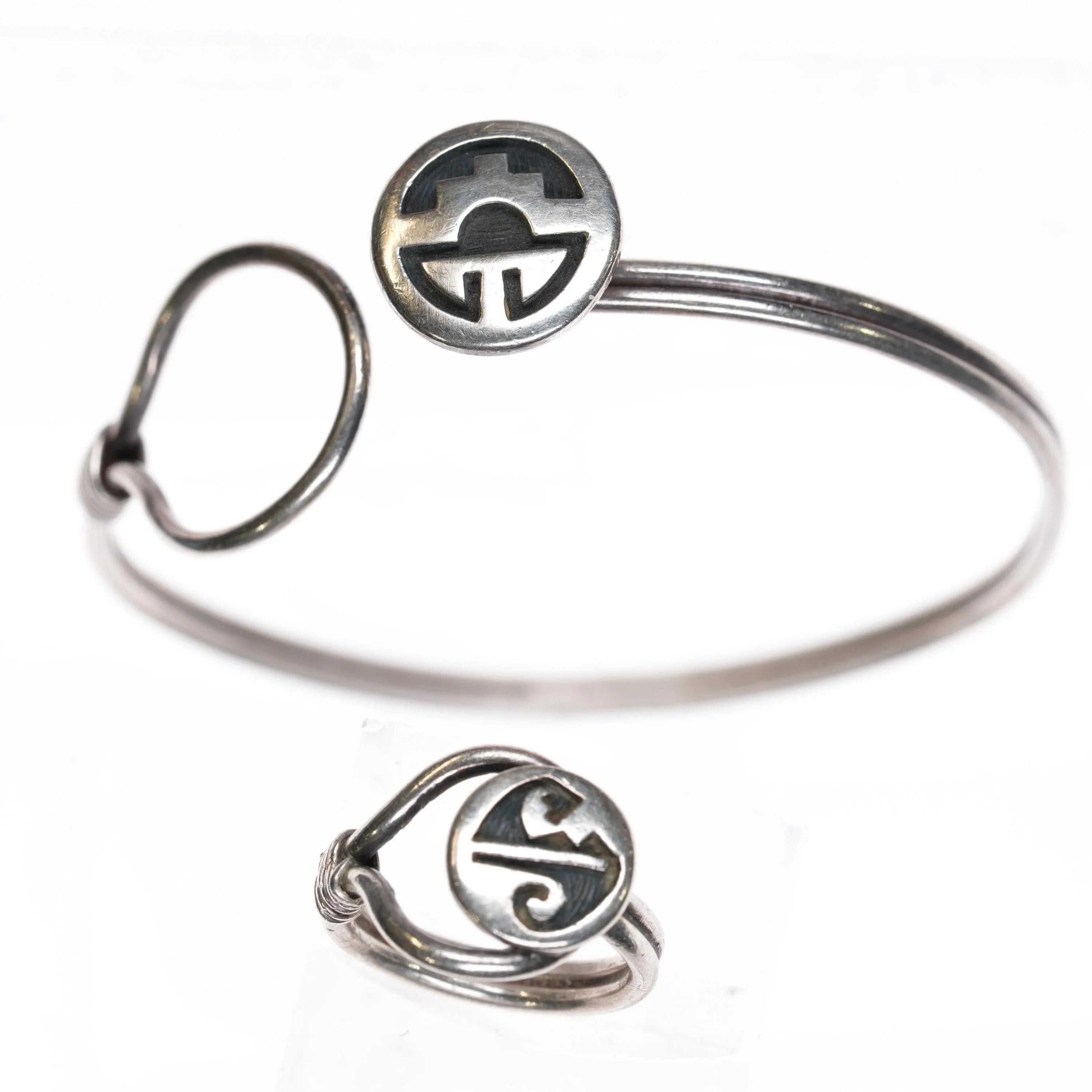 6.1" Vintage Hopi Silvercraft guild overlay bangle sz4 ring sterling silver. Tested and guaranteed solid sterling silver with Hopi guild mark, looks like another picto-hallmark on the bracelet, illegible.. Weight and measurements in pictures.