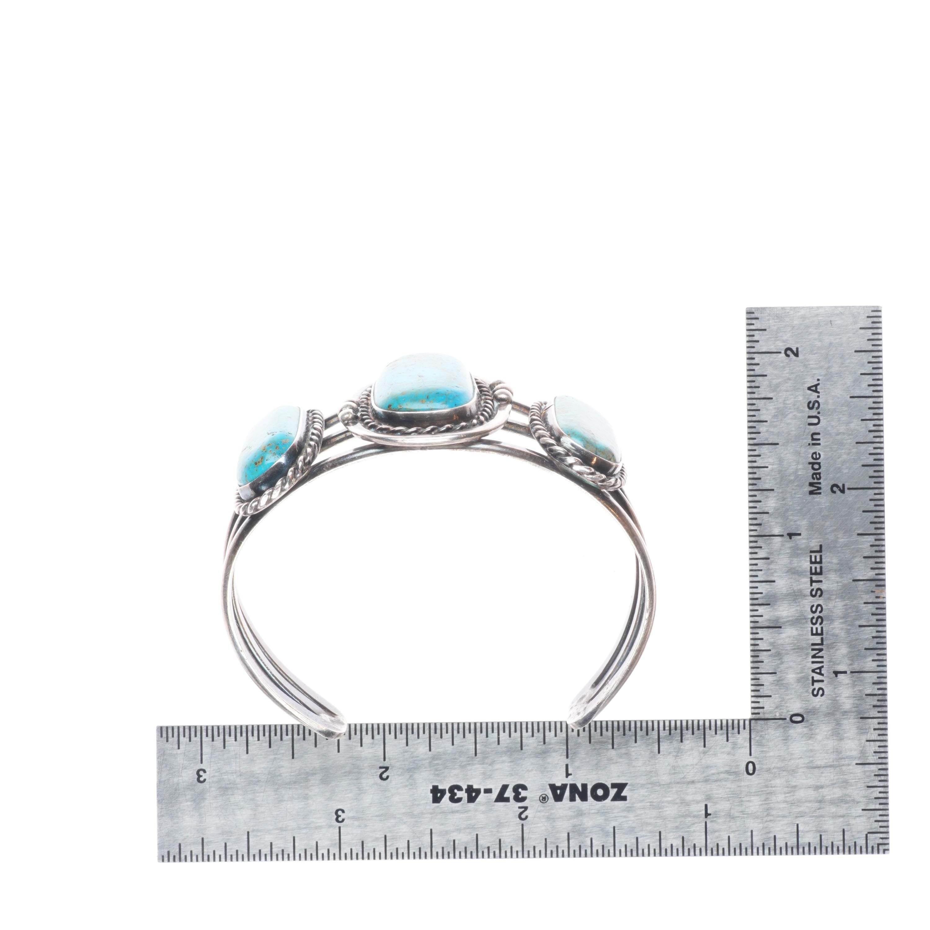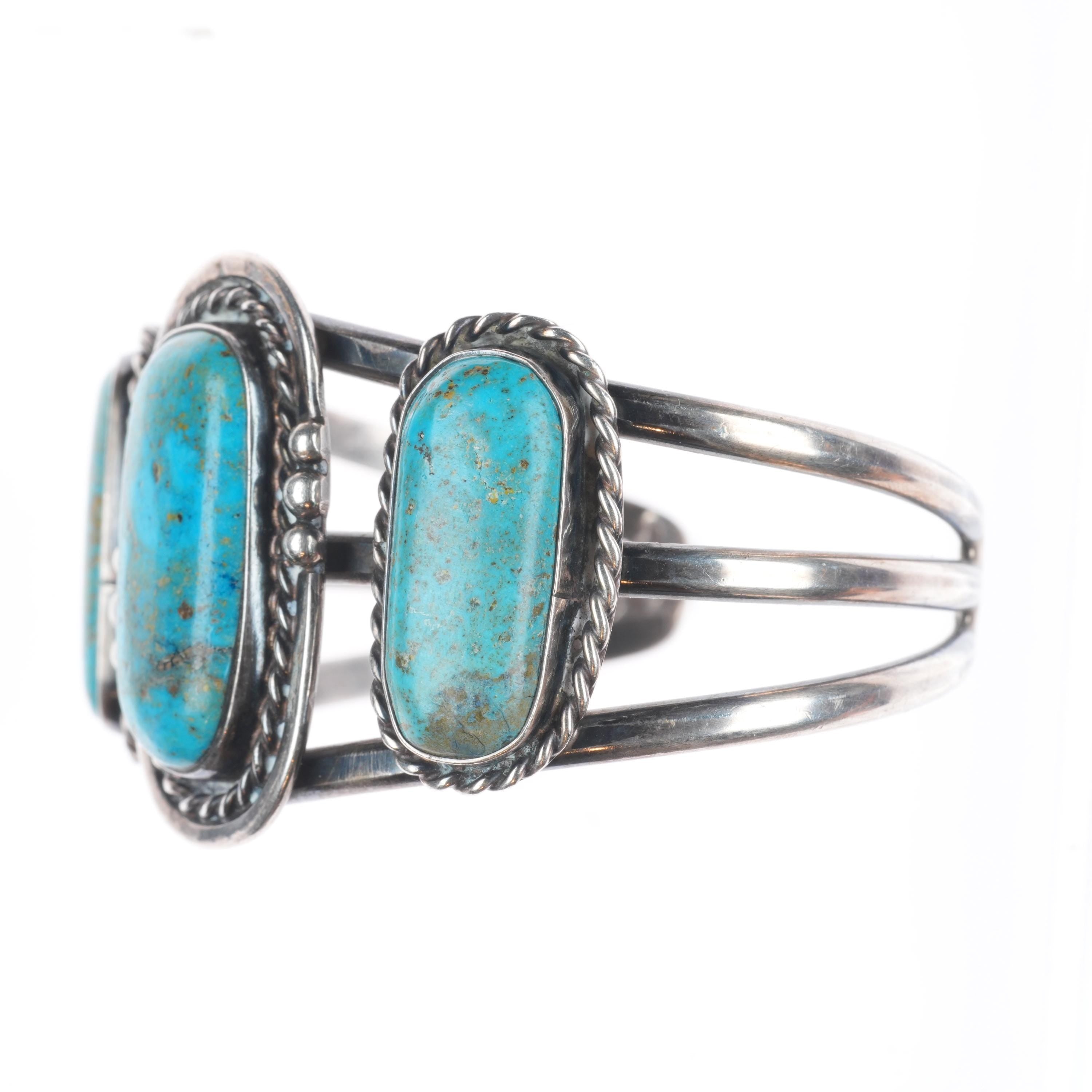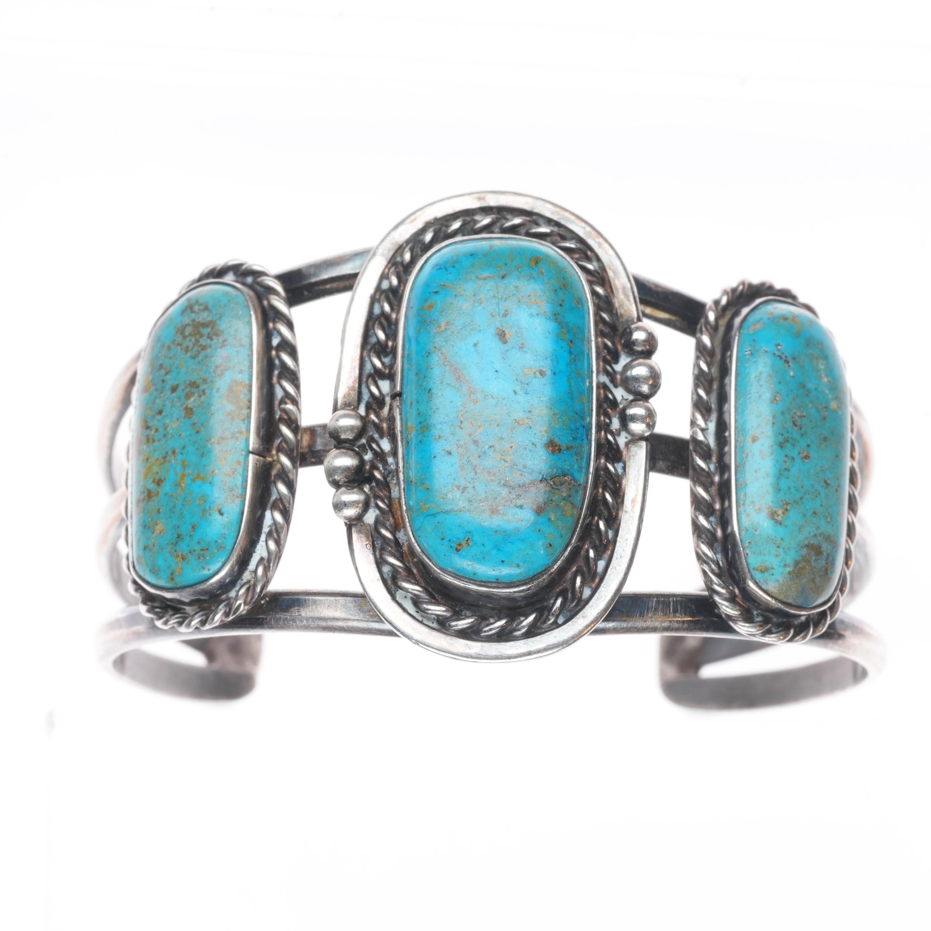 6.1" Vintage Navajo sterling silver 3 stone turquoise cuff braclet. Tested and guaranteed solid sterling silver with weight and measurements in pictures. Great condition with age appropriate wear, circa third quarter of the 20th century.