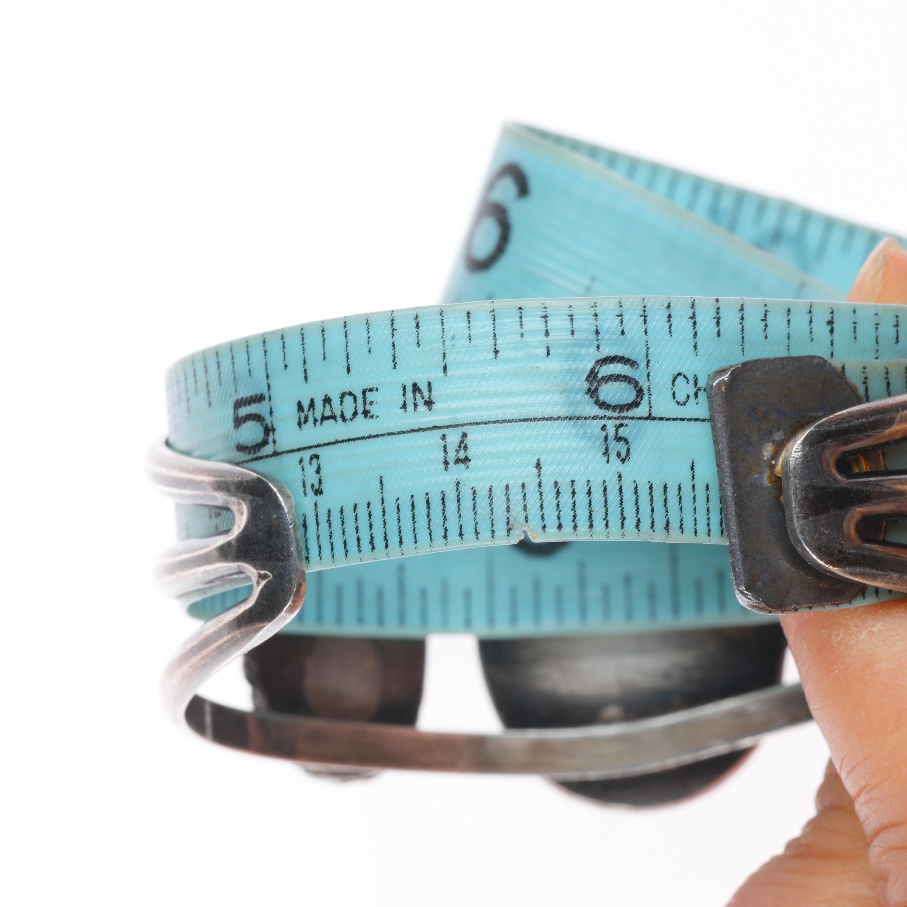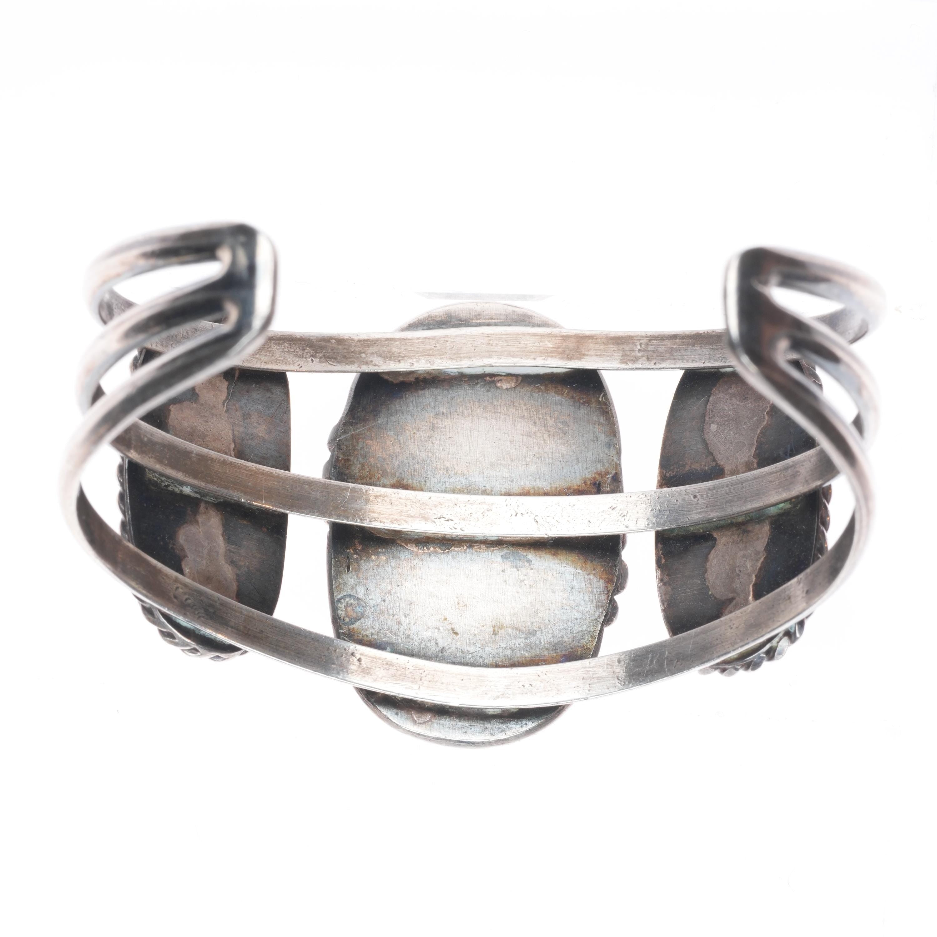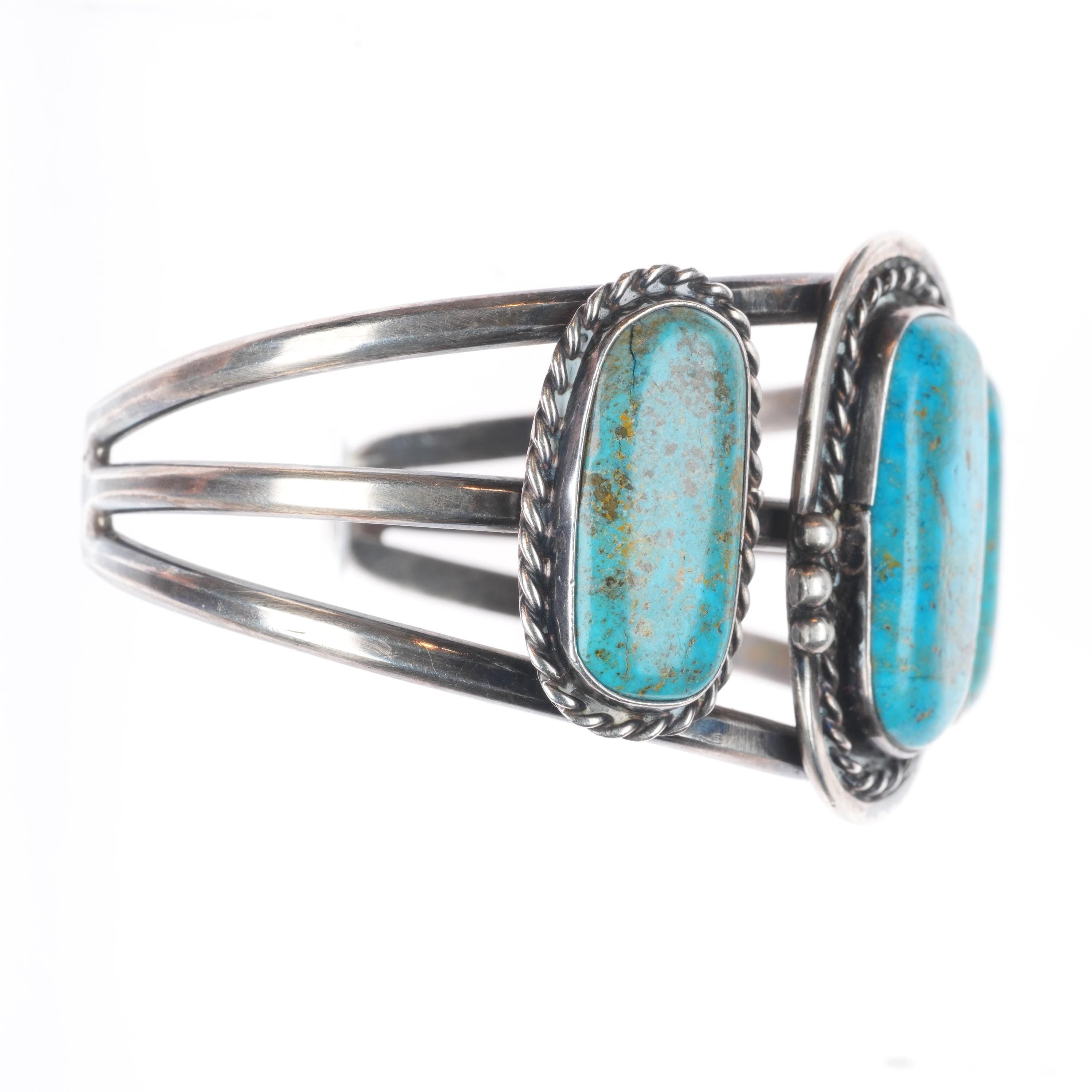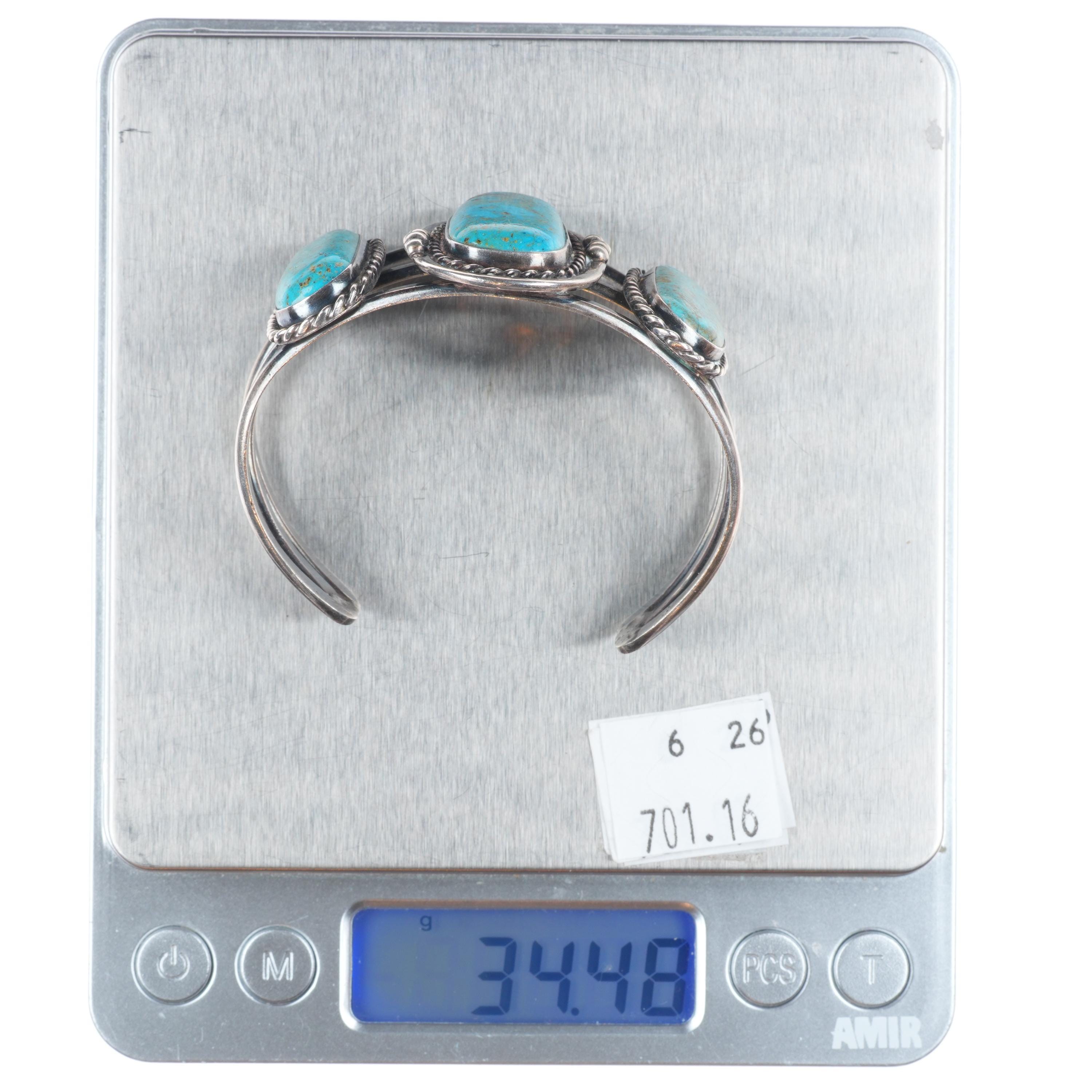 6.1" Vintage Navajo sterling silver 3 stone turquoise cuff braclet. Tested and guaranteed solid sterling silver with weight and measurements in pictures. Great condition with age appropriate wear, circa third quarter of the 20th century.