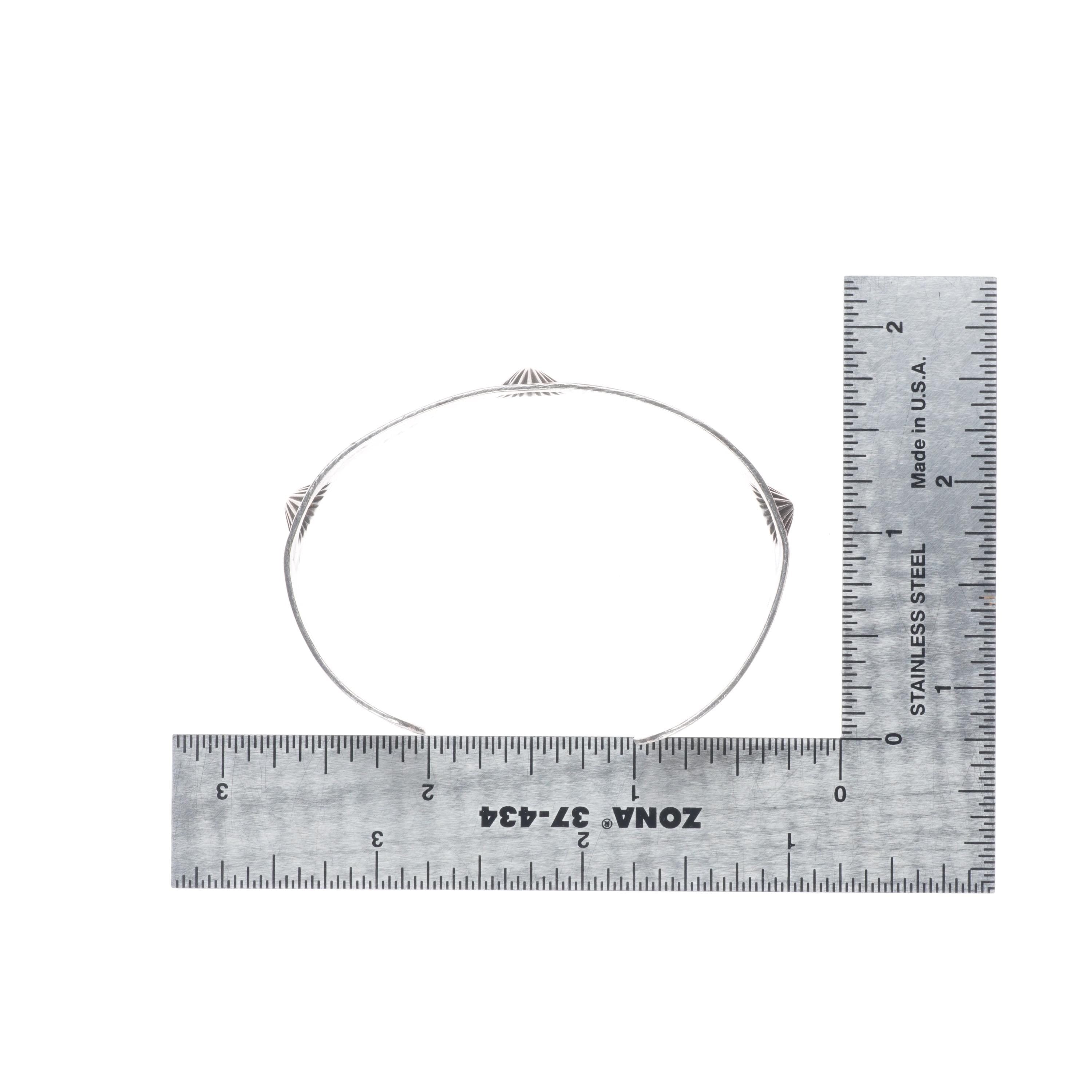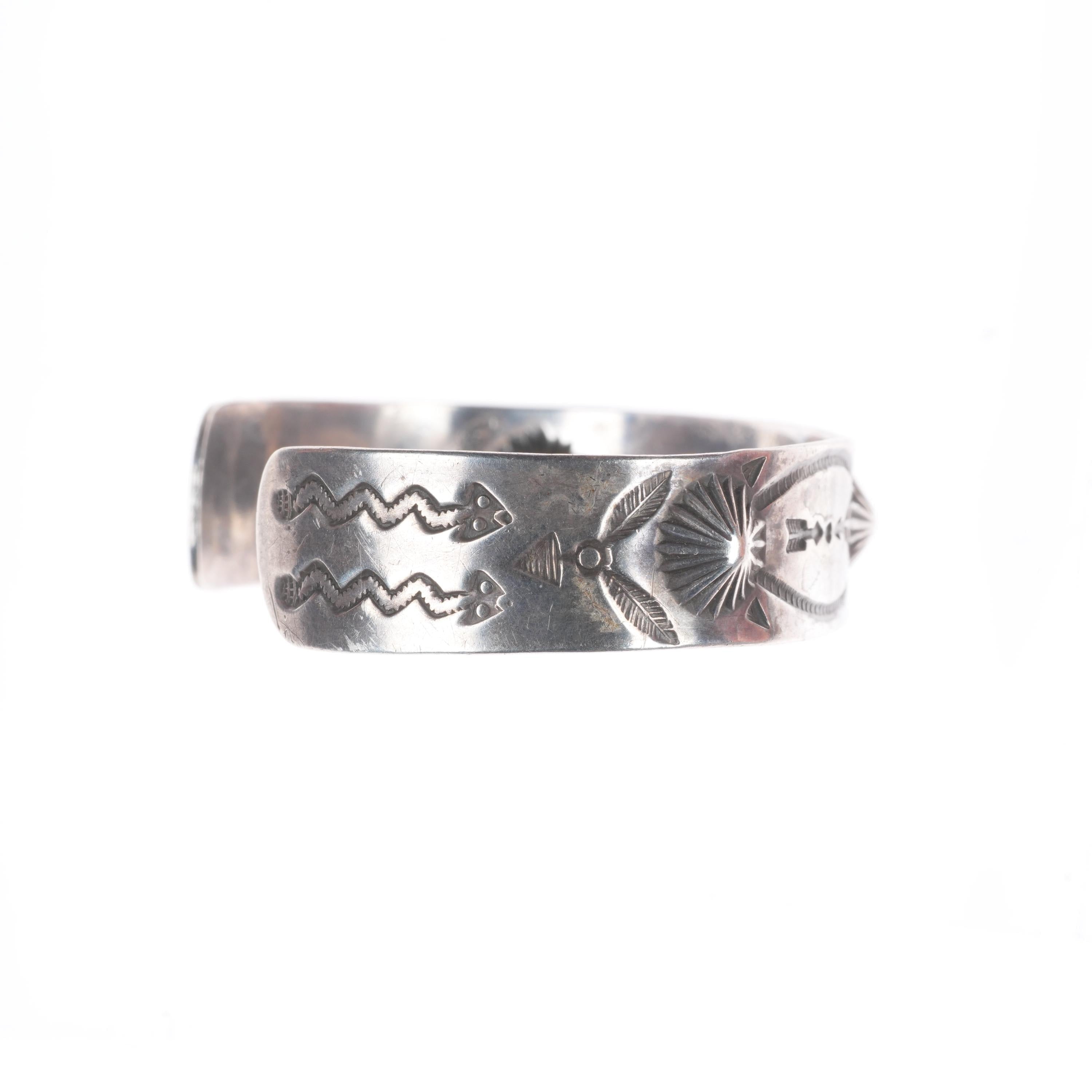 6.2" c1930's Navajo ingot silver snake and arrow stamped repousse cuff bracelet. Tested and guaranteed solid sterling silver with weight and measurements in pictures. Overall expected wear circa second quarter of the 20th century. From a high end collection of historic Navajo and Zuni jewelry. 15 grams.