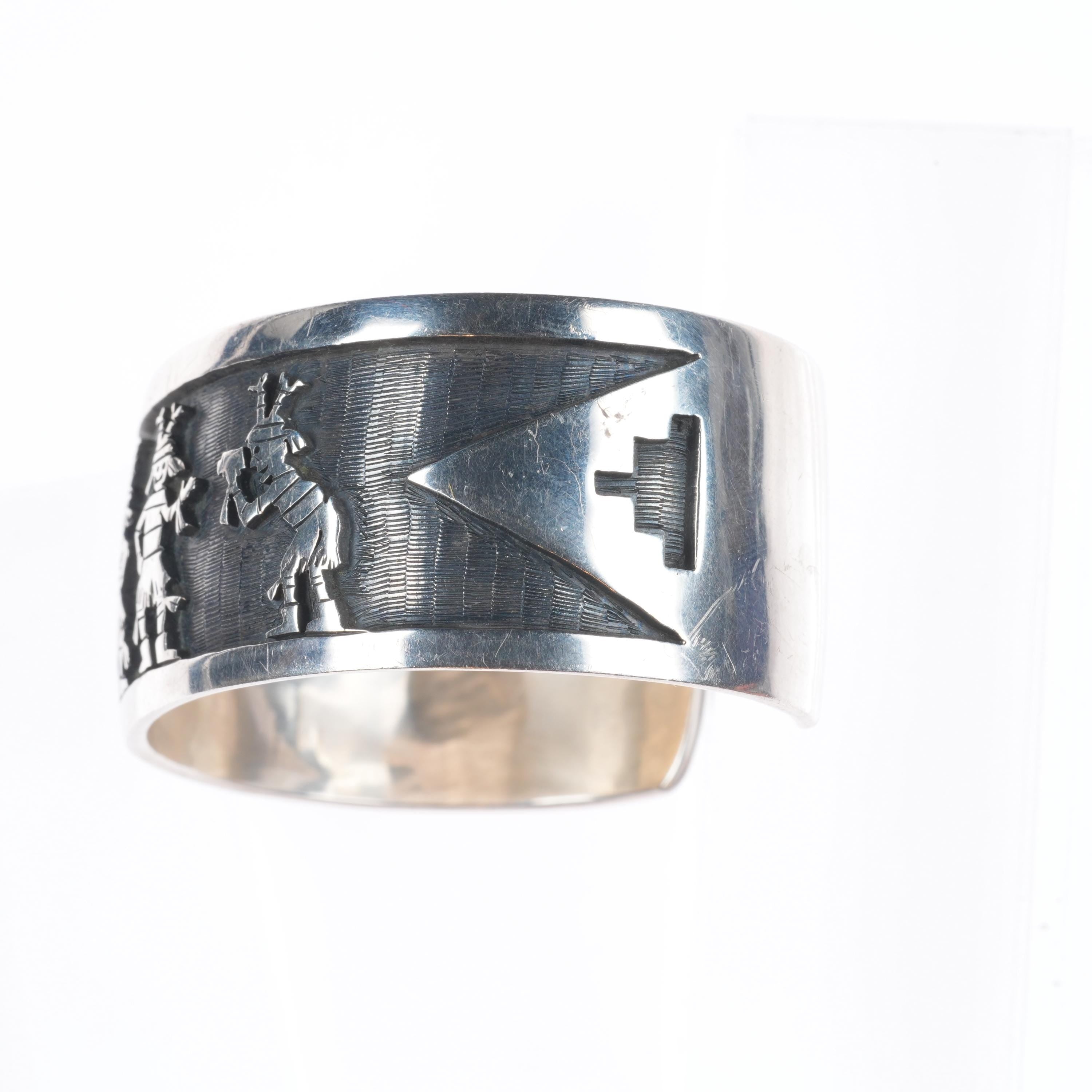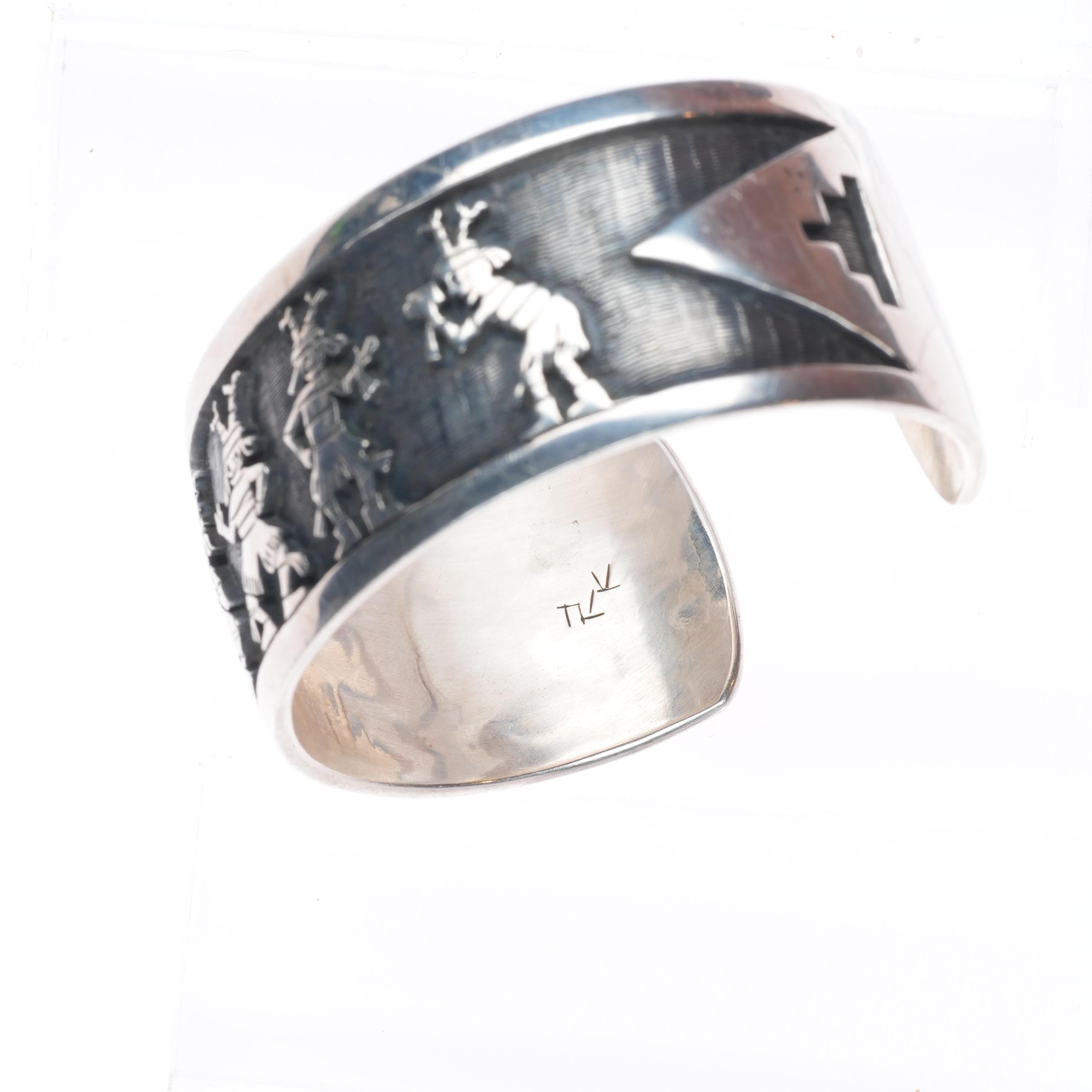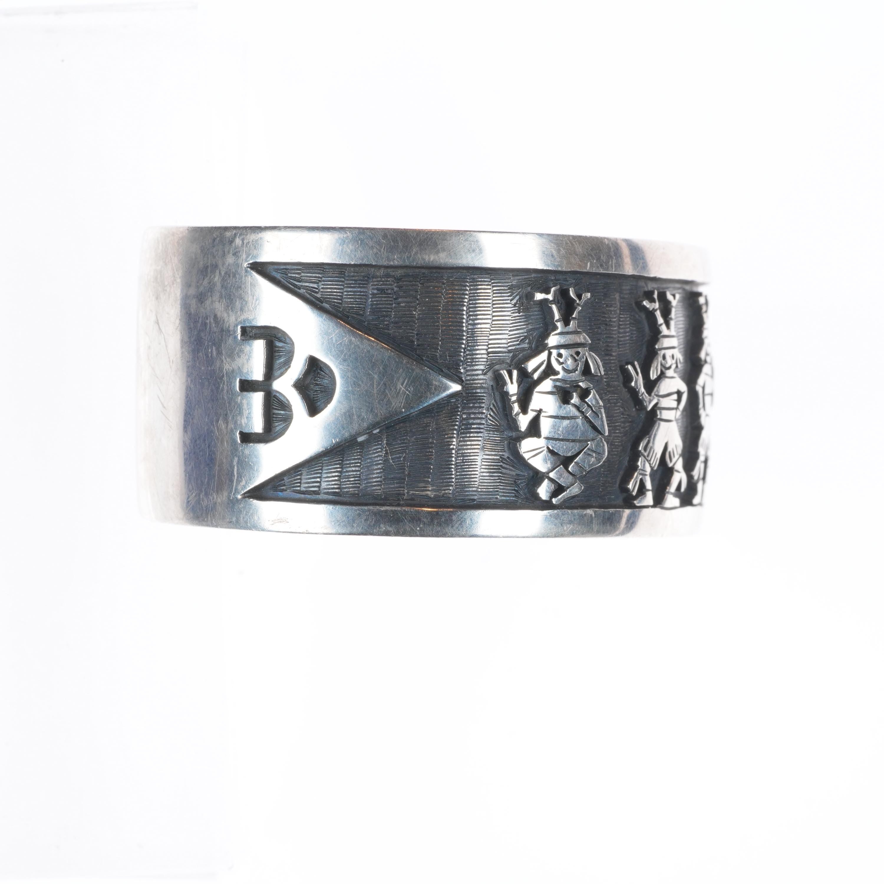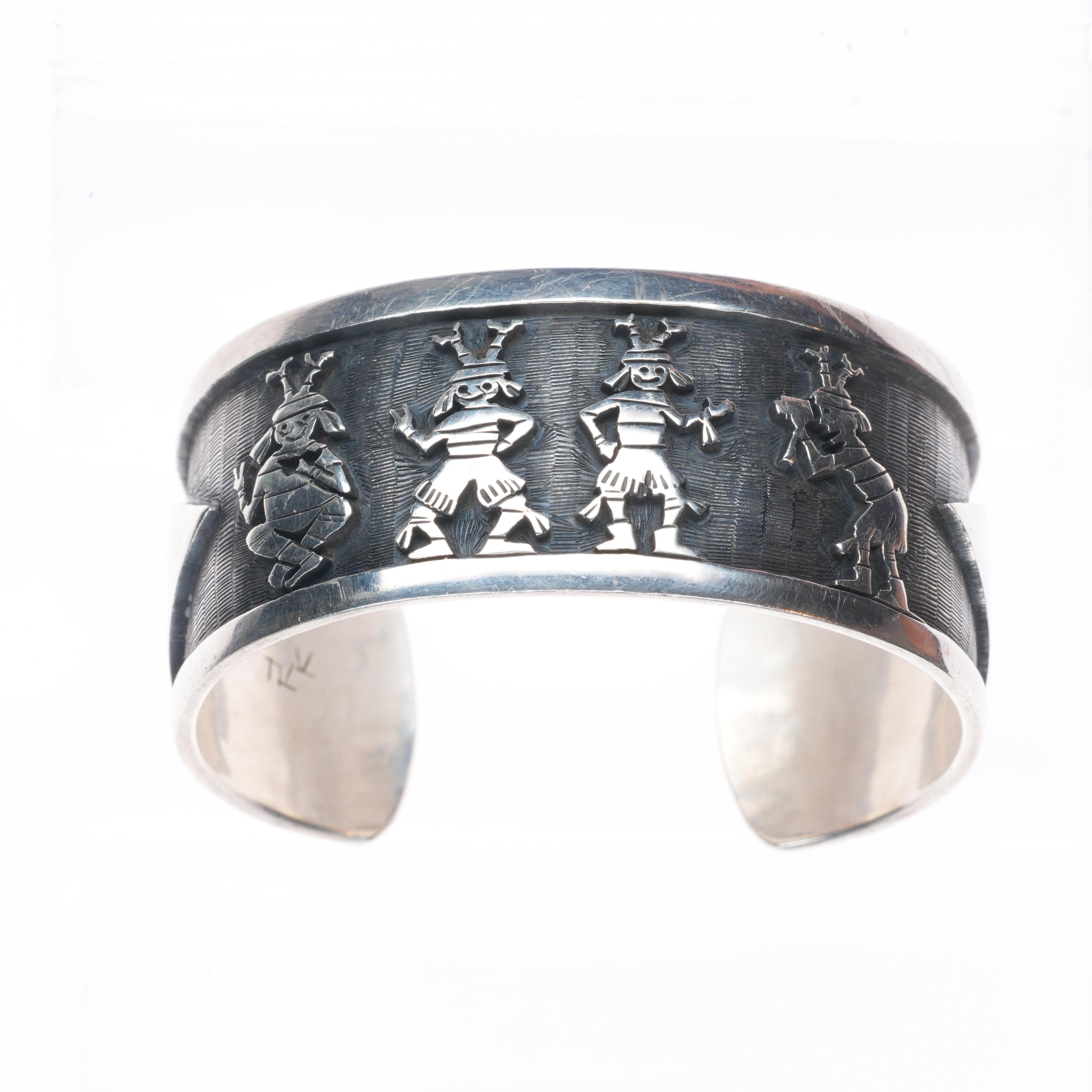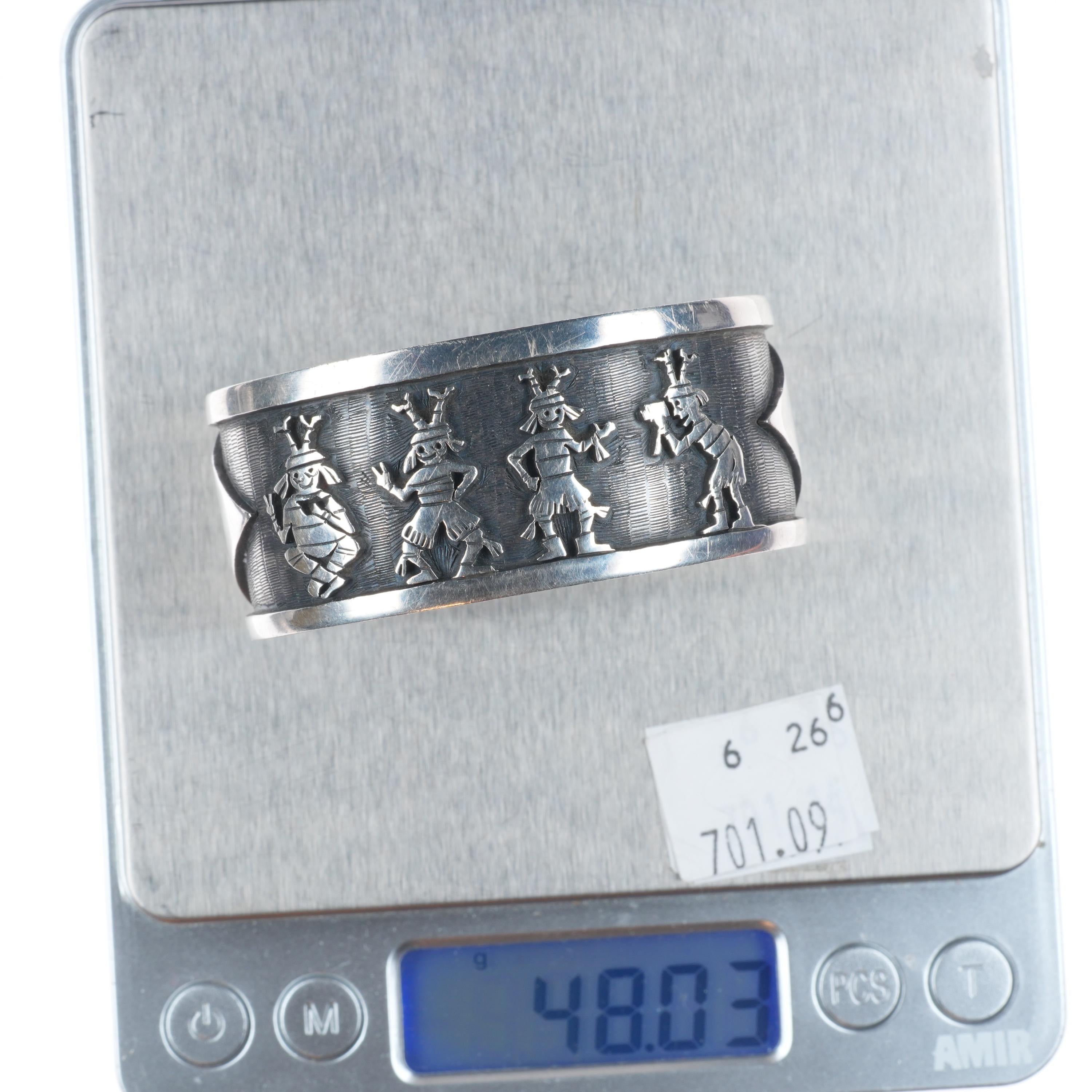 6.2" Ray & Dorothy Kyasyousie Hopi Overlay dancing kachinas cuff bracelet. Tested and guaranteed solid sterling silver with weight and measurements in pictures. Great condition with age appropriate wear, circa last quarter of the 20th century.