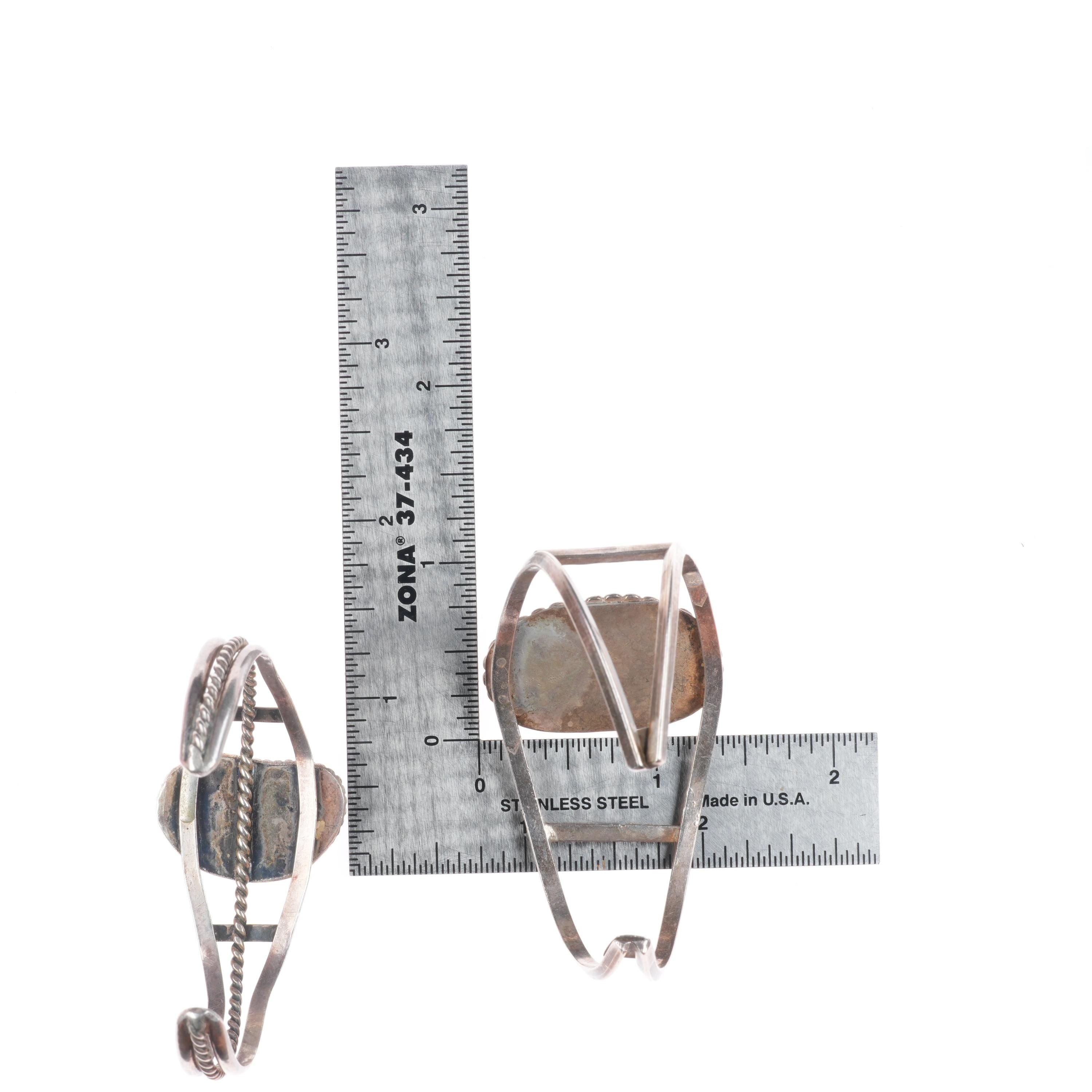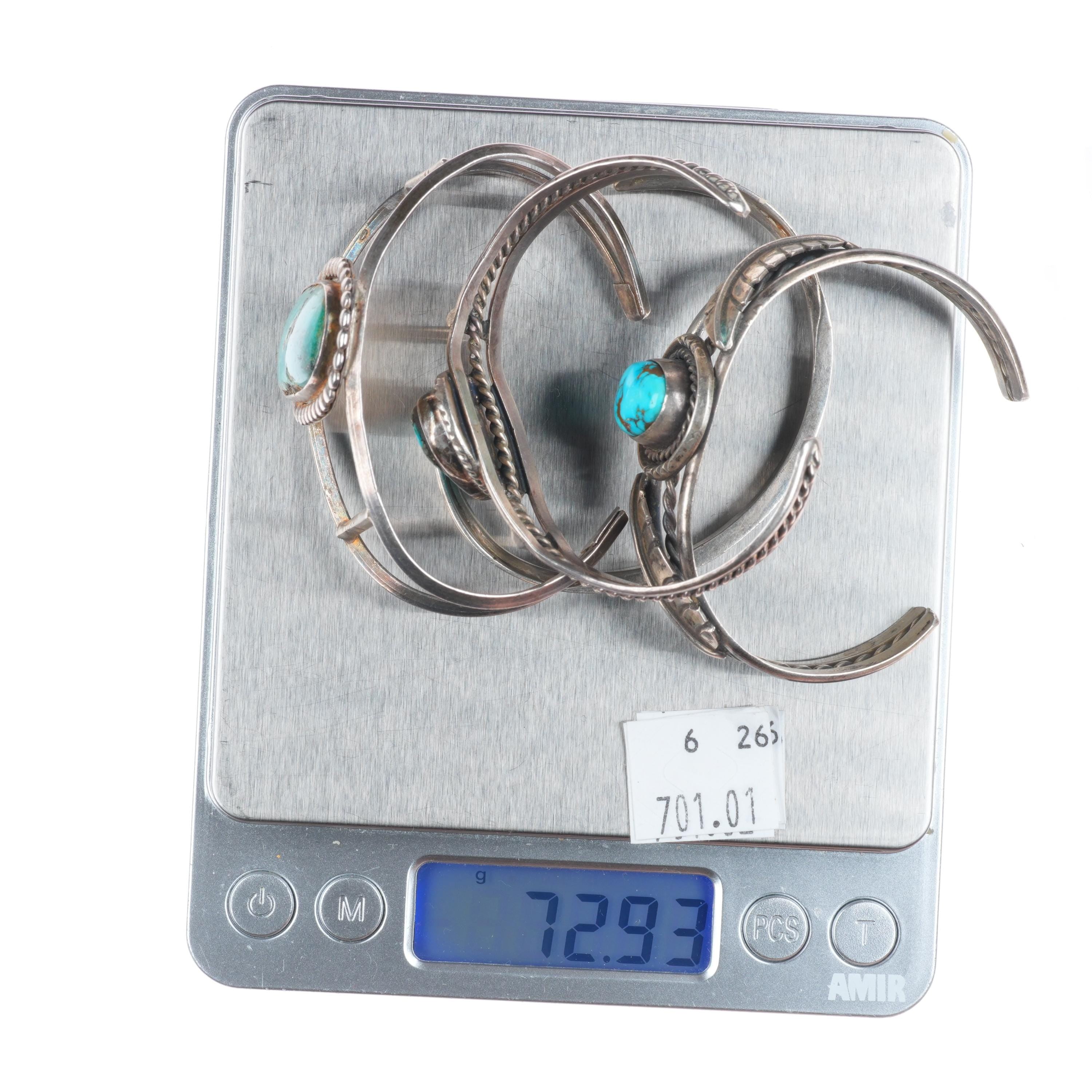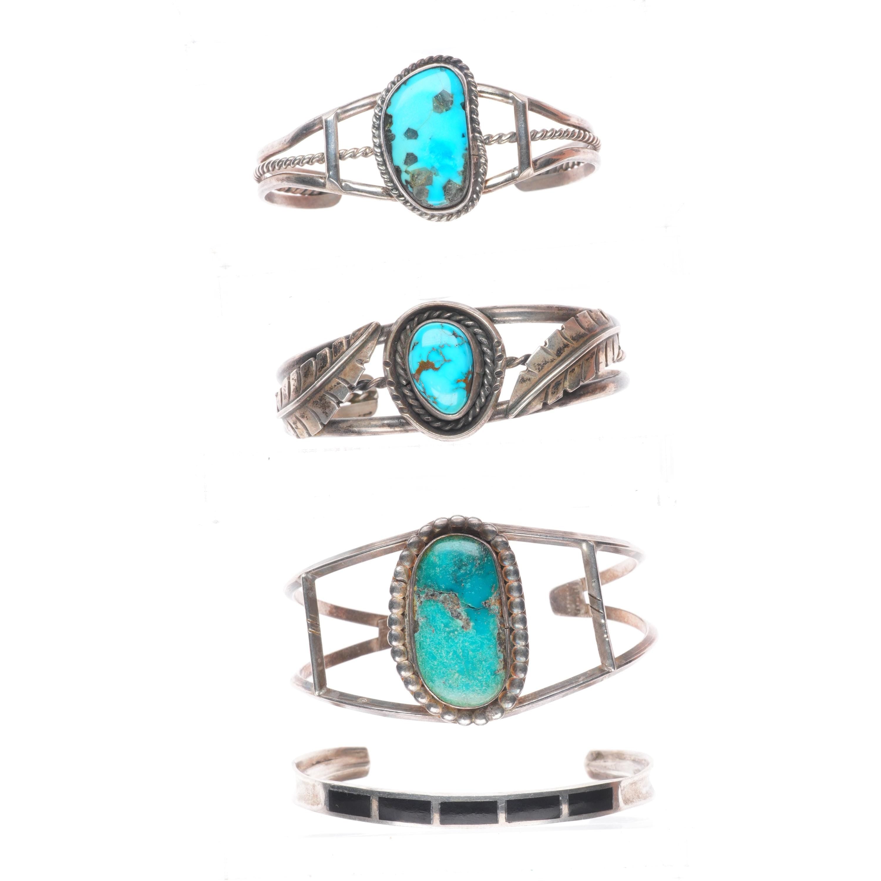 6.2" Vintage Navajo/Zuni sterling silver turquoise/Onyx cuff bracelet lot. Tested and guaranteed solid sterling silver with weight and measurements in pictures. Great condition with age appropriate wear, circa last half of the 20th century. Apparently unmarked unless marks are shown in the pictures.. Sell the lot shown, all close to the same size. Center one with large stone has a stable fracture.