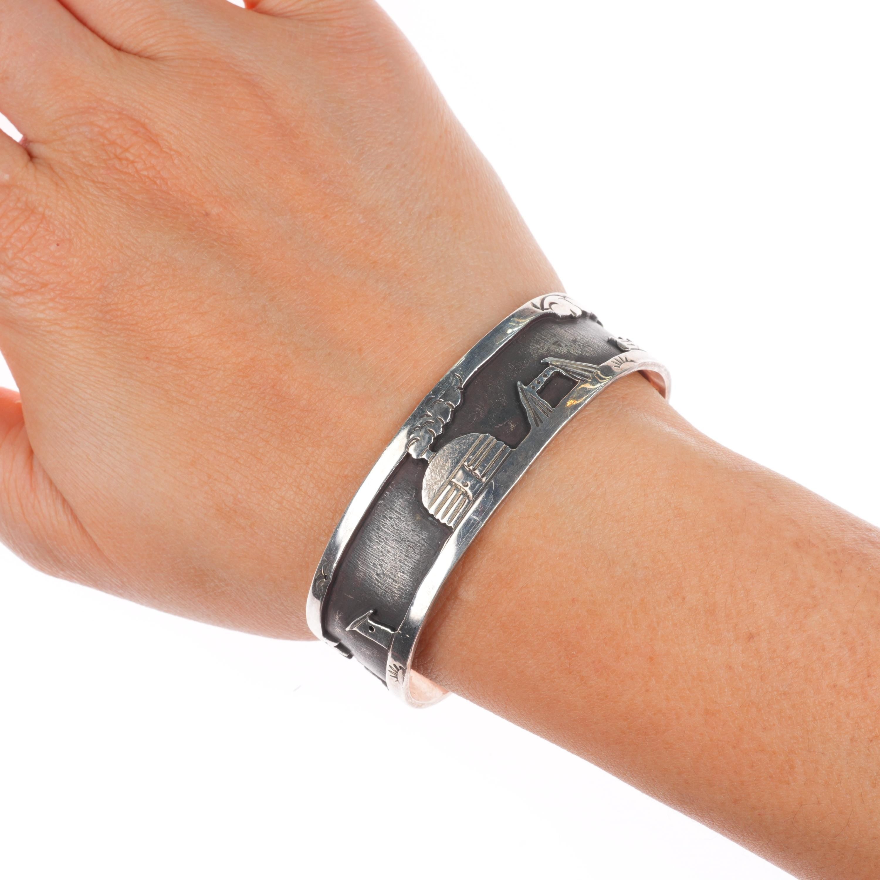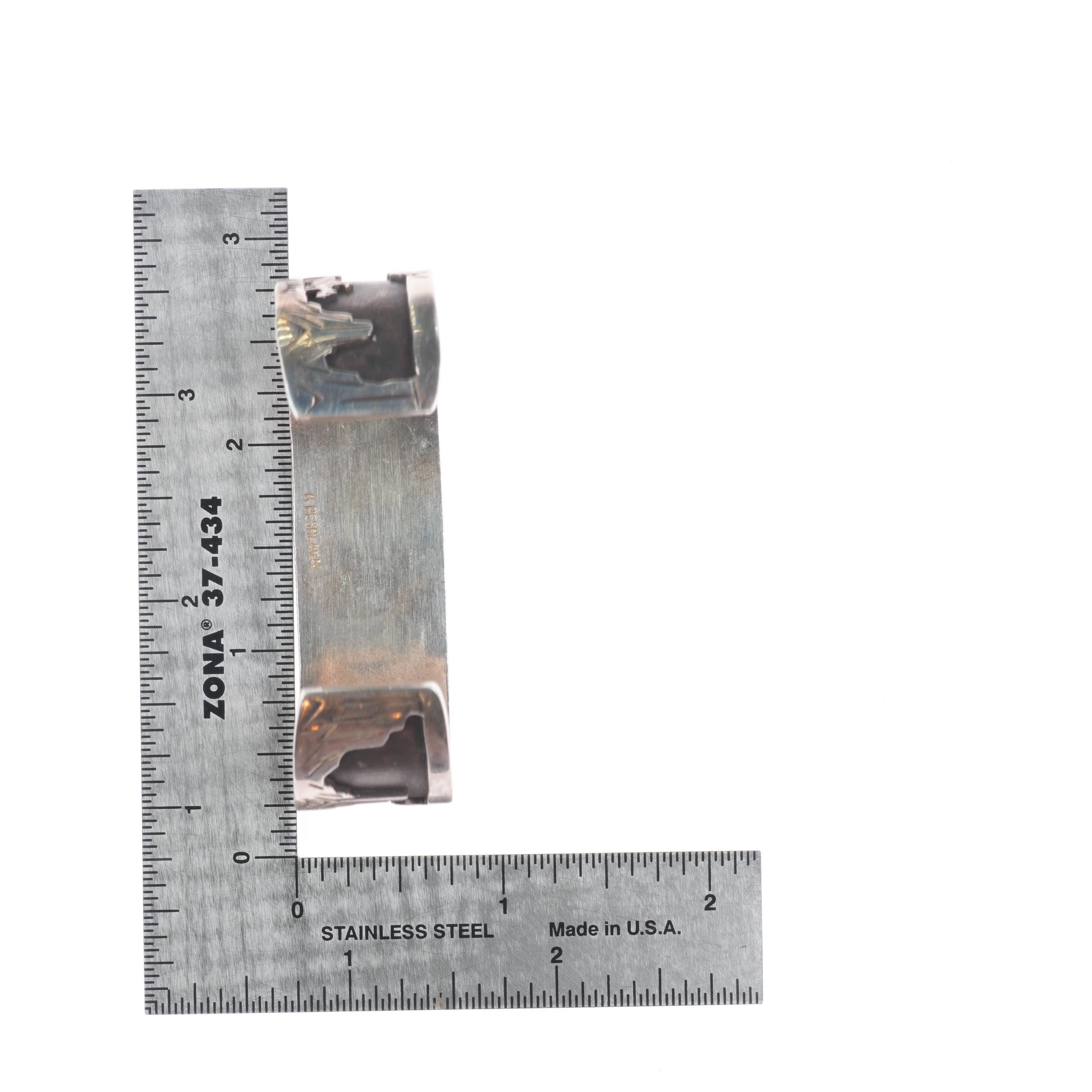 6.25" K Peshlakai Navajo sterling silver storyteller cuff bracelet. Tested and guaranteed solid sterling silver with weight and measurements in pictures. Great condition with age appropriate wear, circa third quarter of the 20th century.