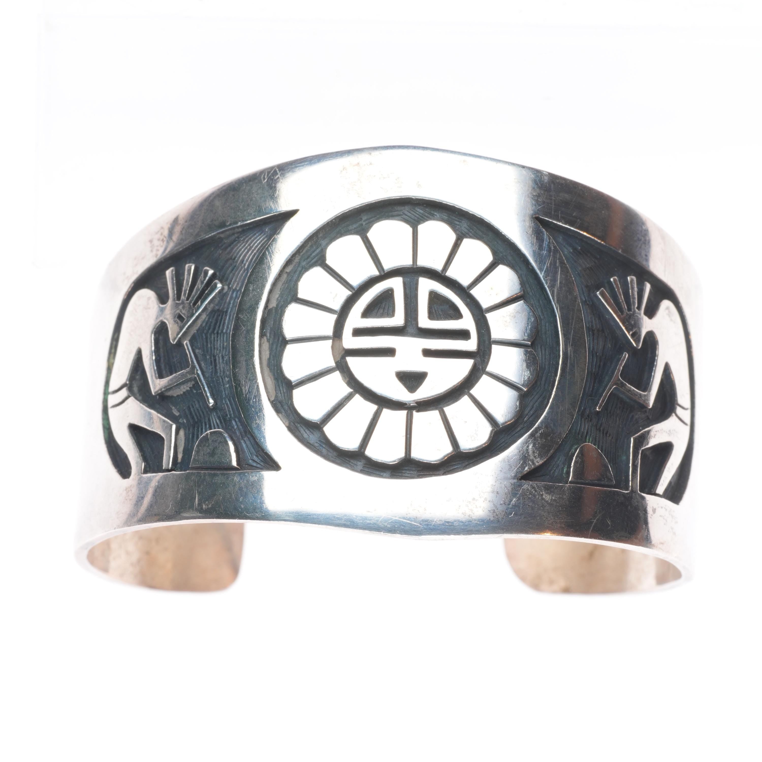 6.25" Vintage Hopi sterling silver Kokopelli and sunface cuff bracelet