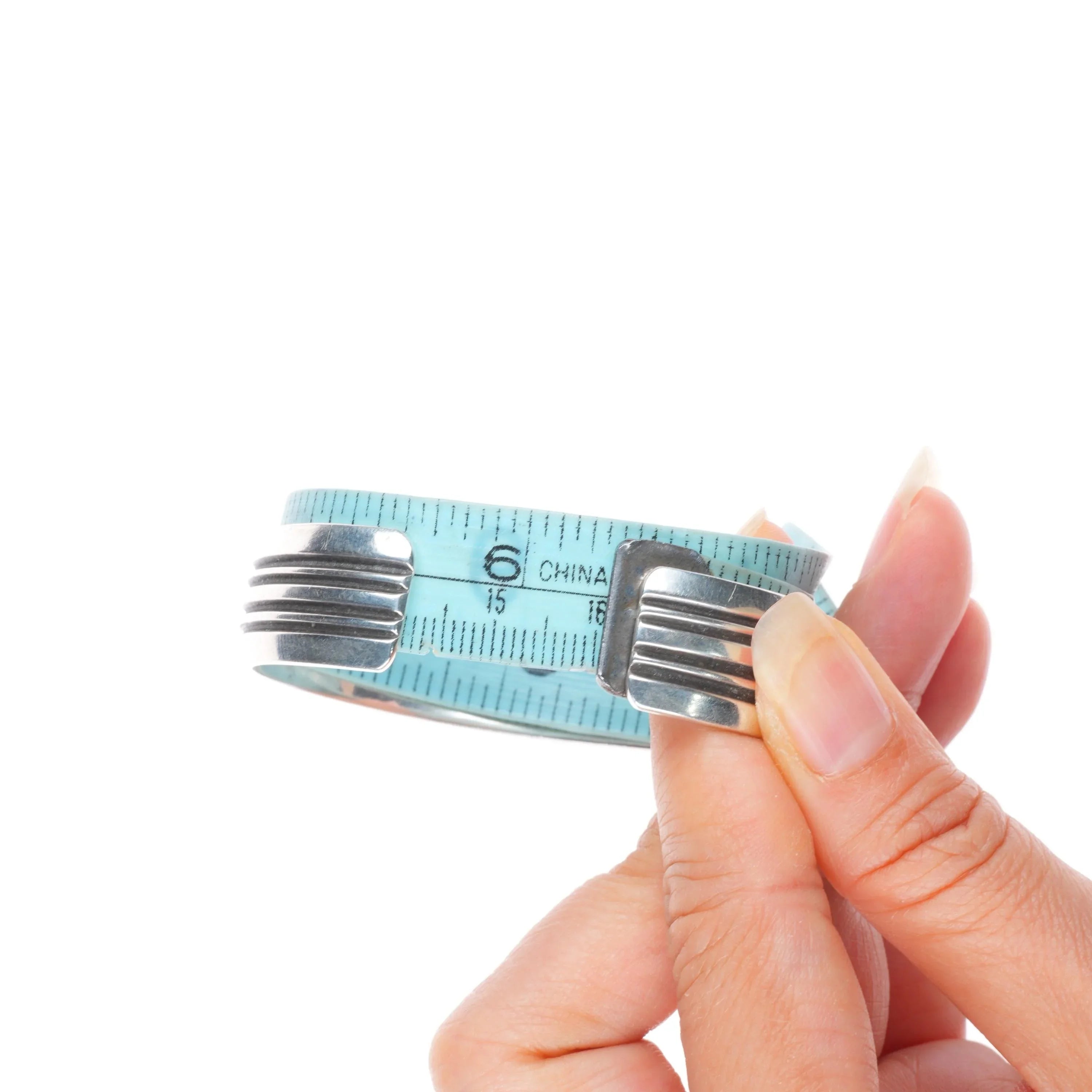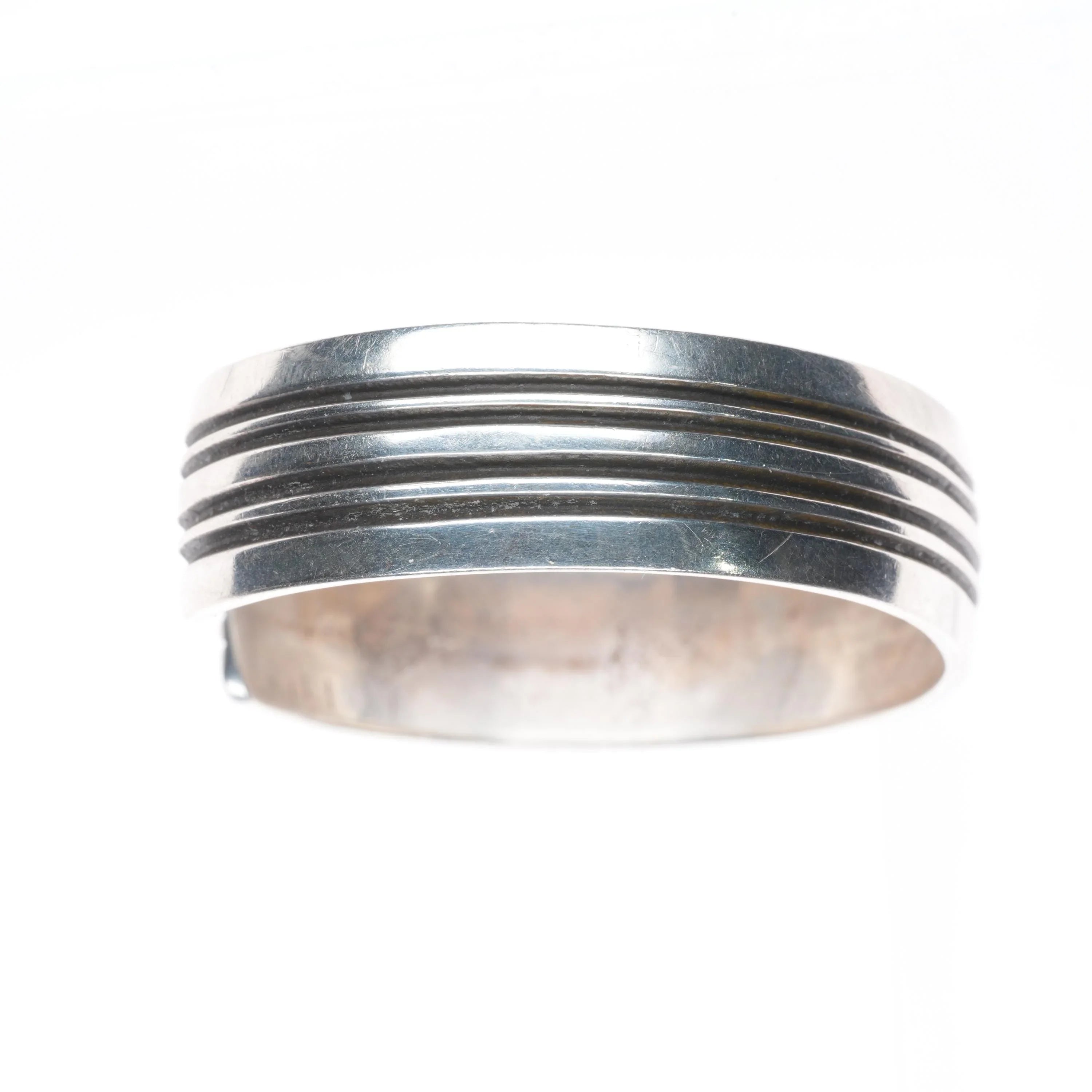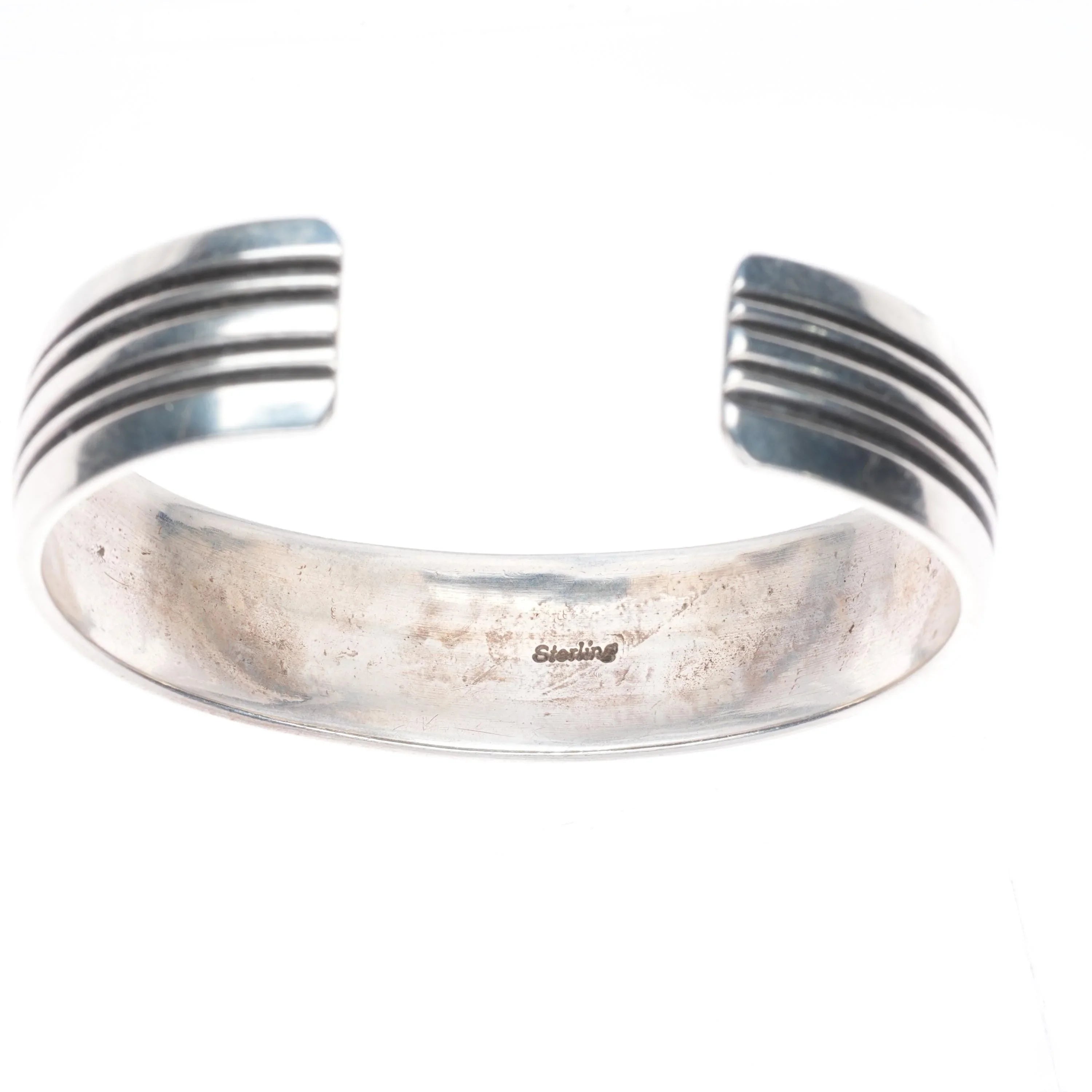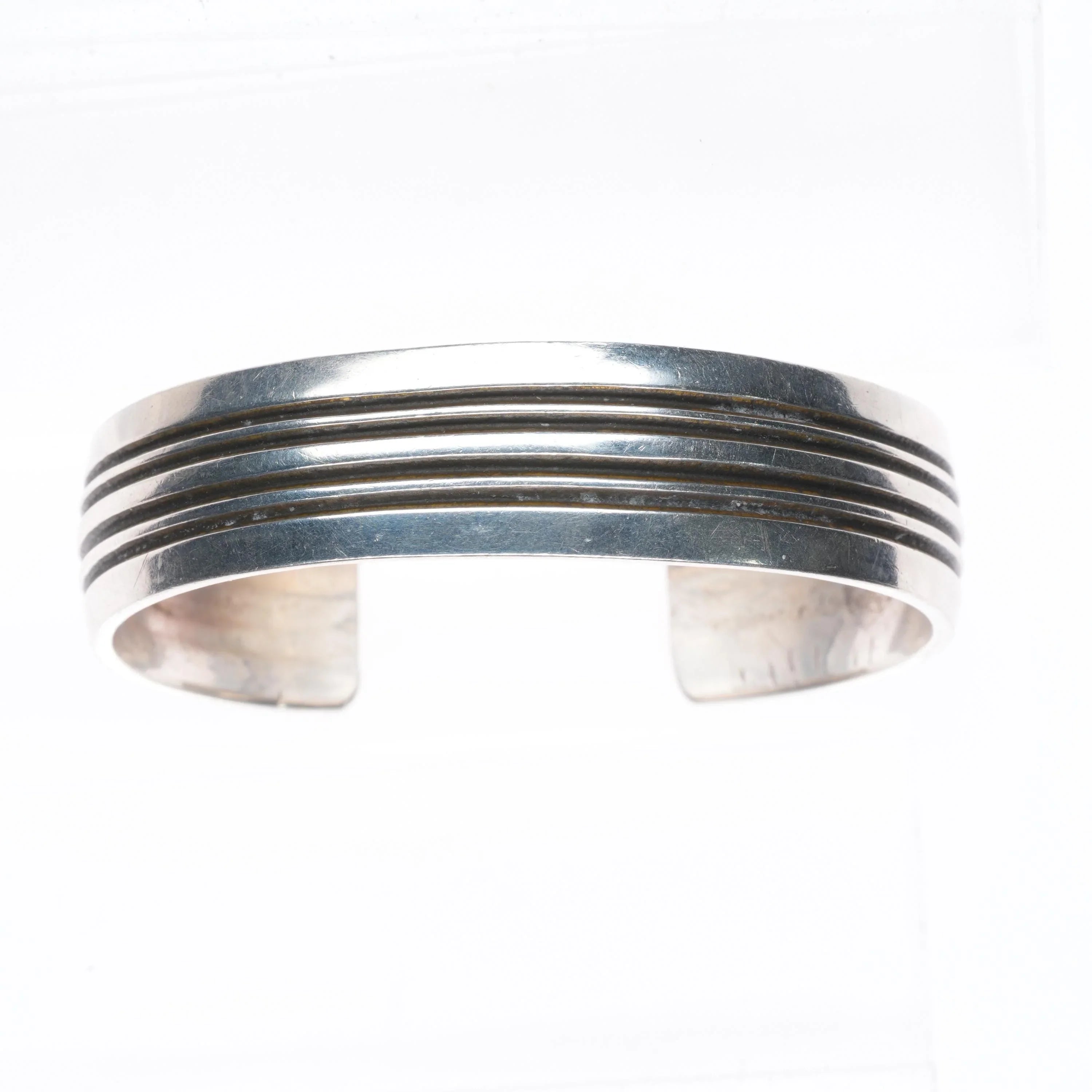 6.25" Vintage Navajo sterling silver banded modernist cuff bracelet D feather hallmark. Tested and guaranteed solid sterling silver with minimal wear, circa last quarter of the 20th century.
