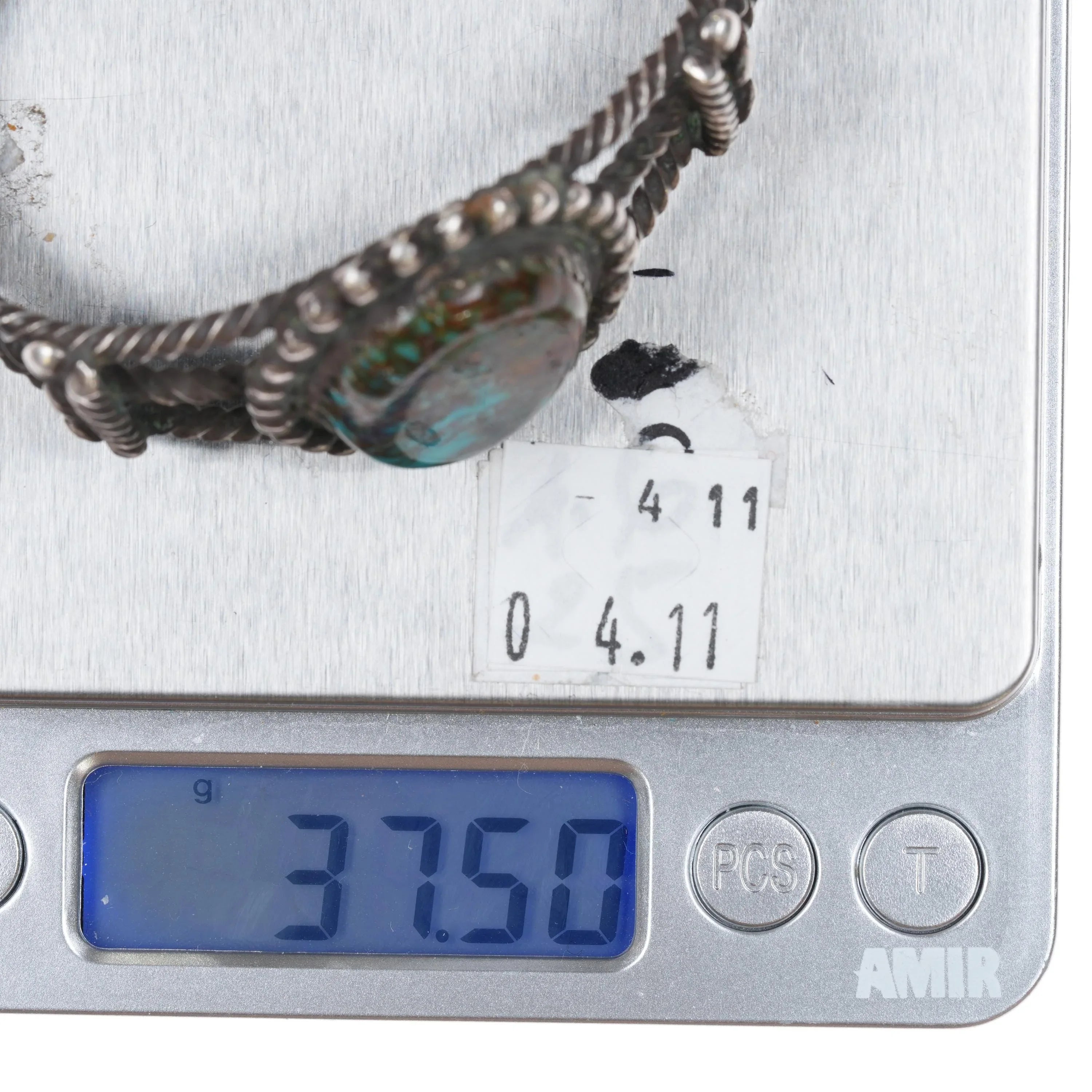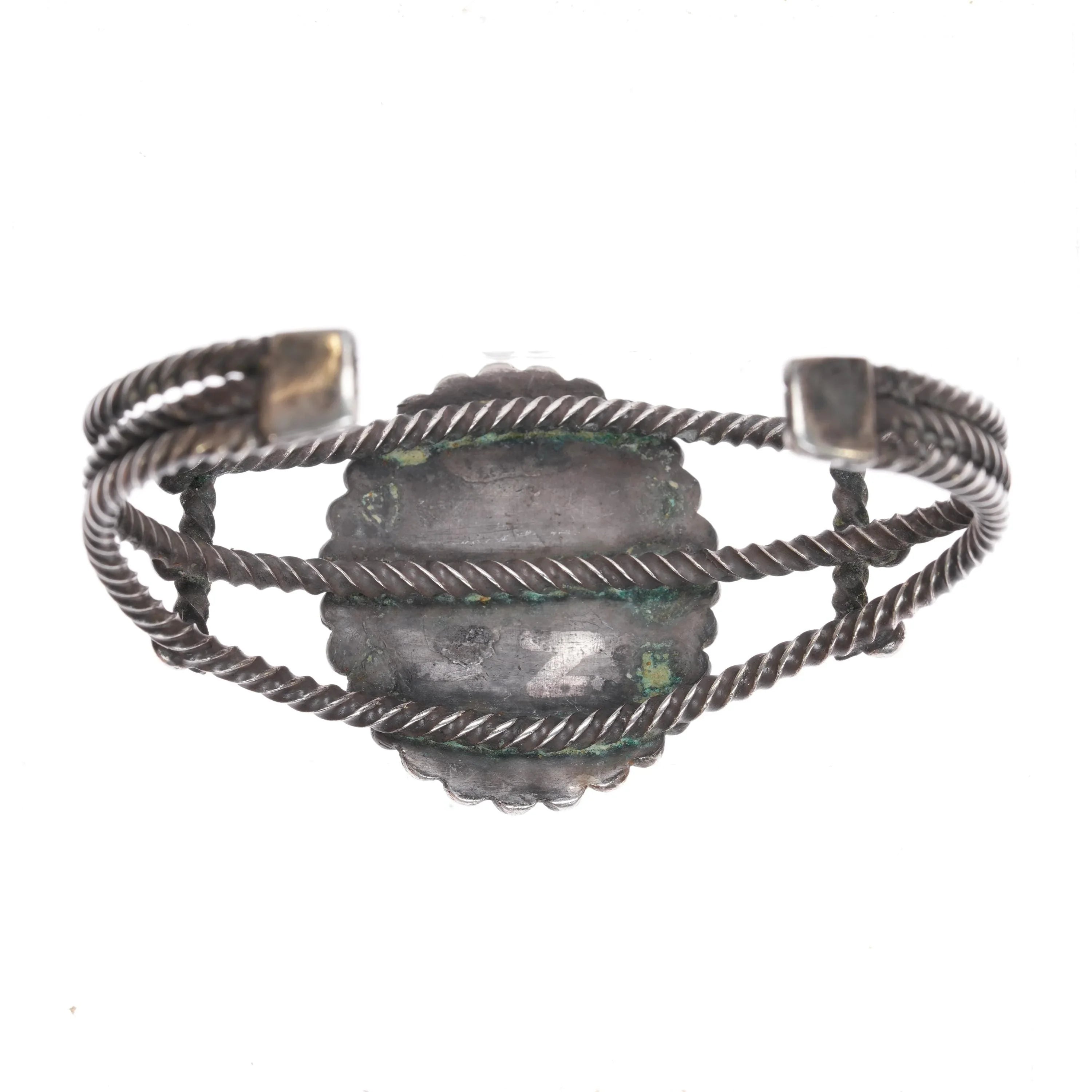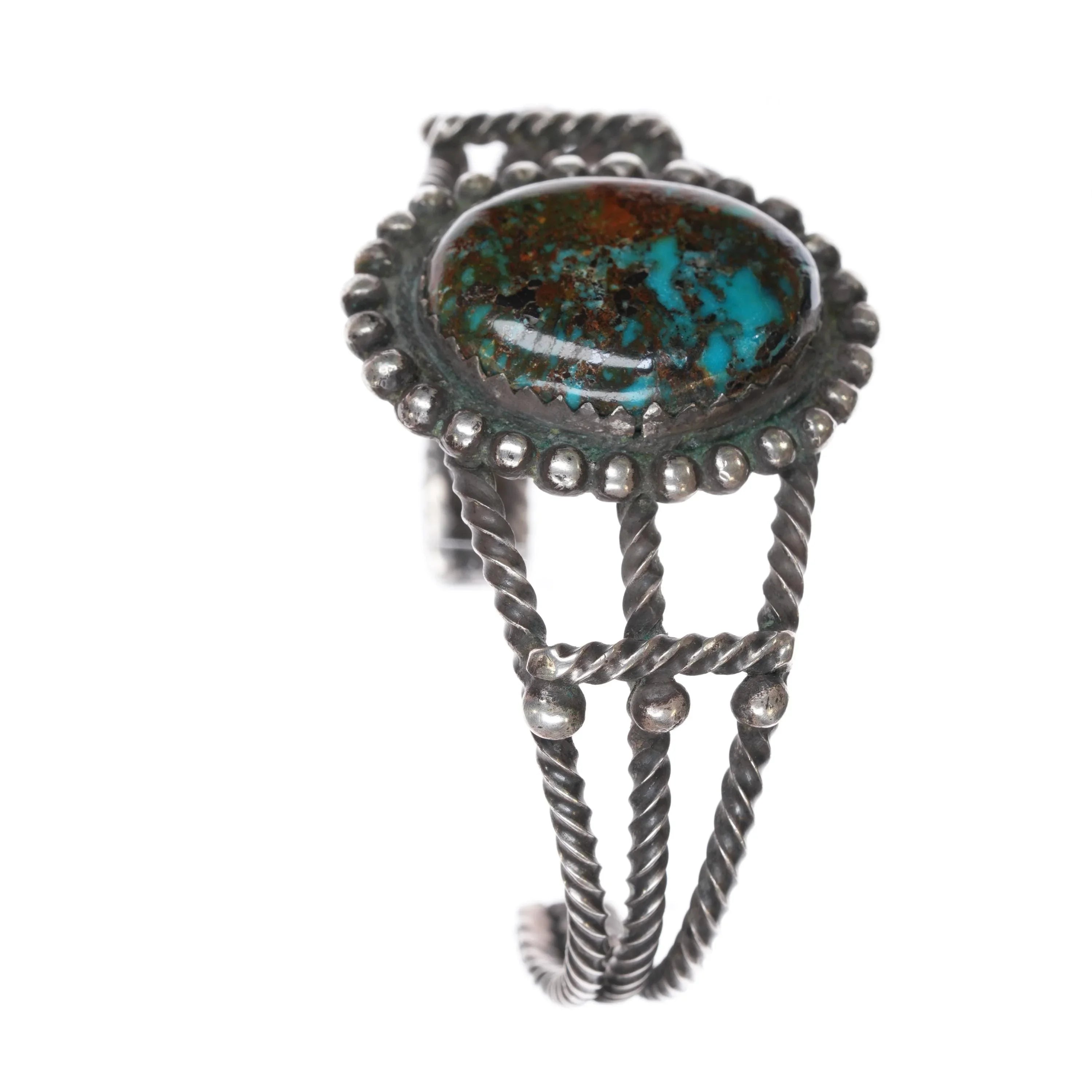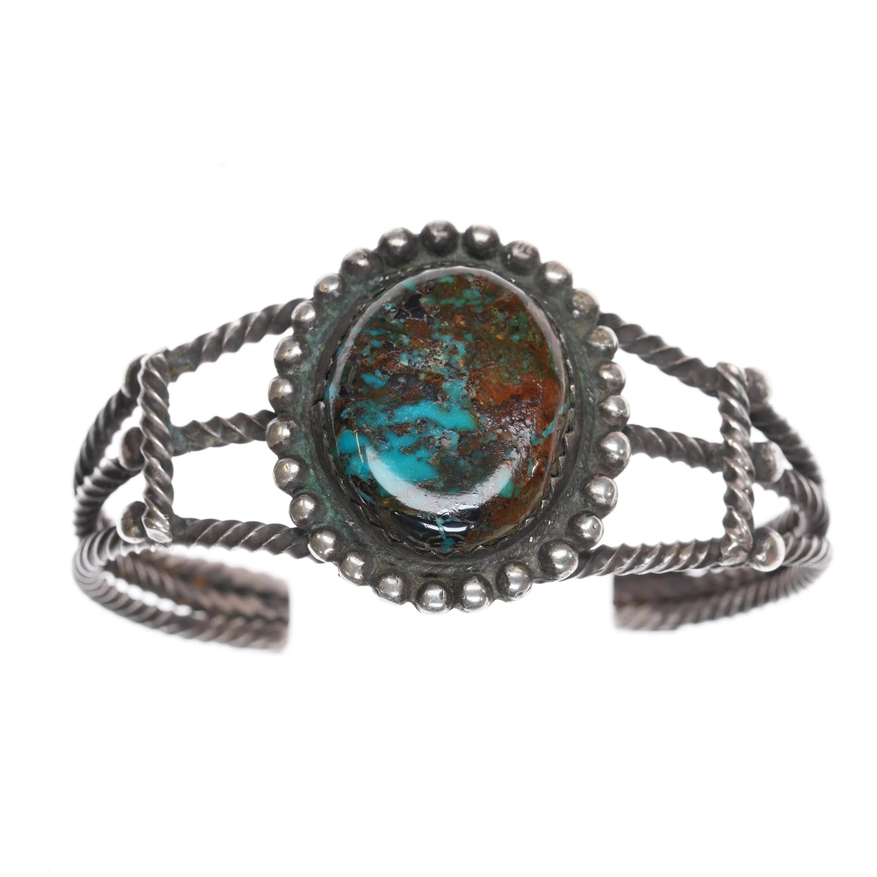 6 3/8" c1940‘s Navajo twisted sterling silver wire nice turquoise cuff bracelet Weight and measurements in pictures, solid sterling silver with no issues. Minimal wear circa second quarter of 20th century, unmarked.