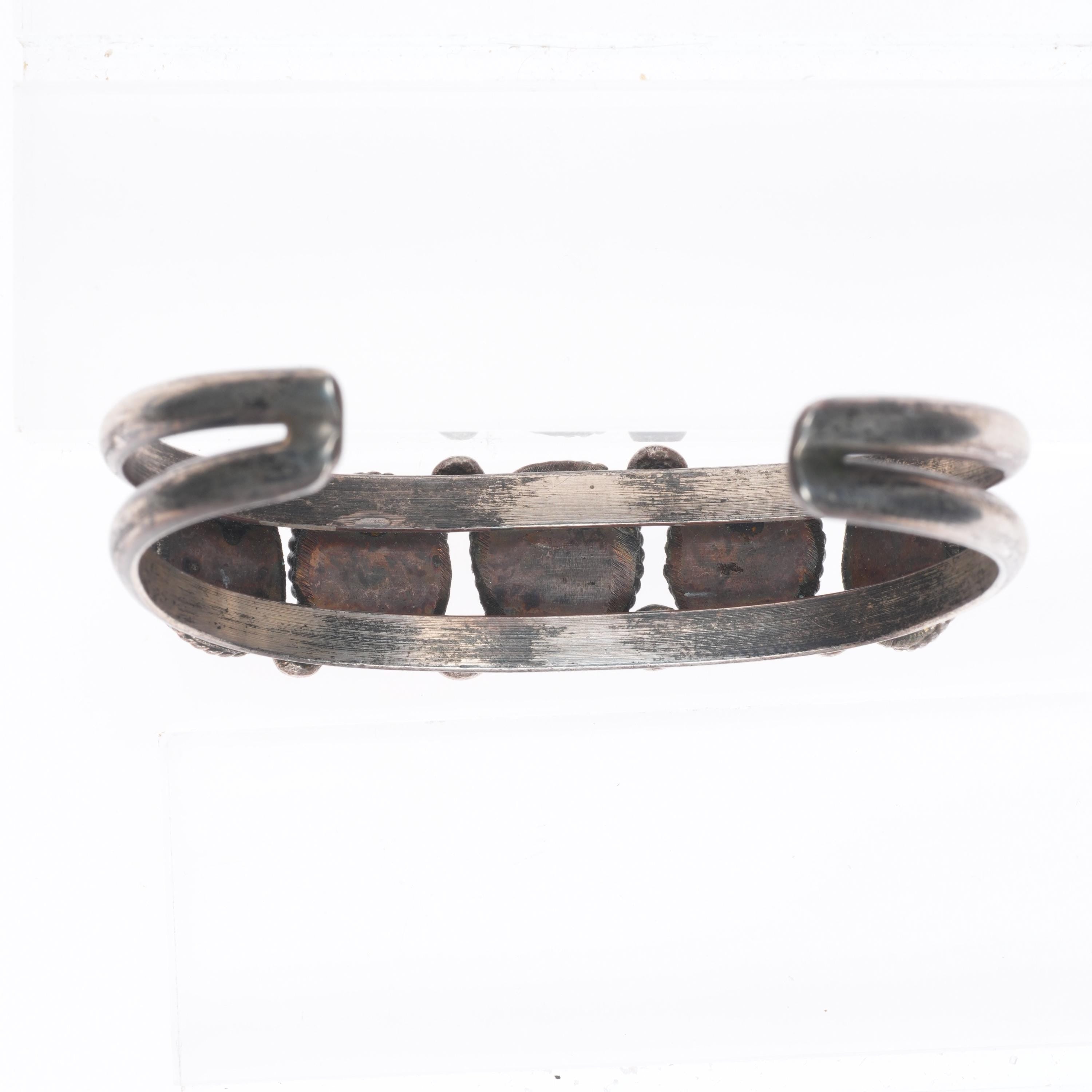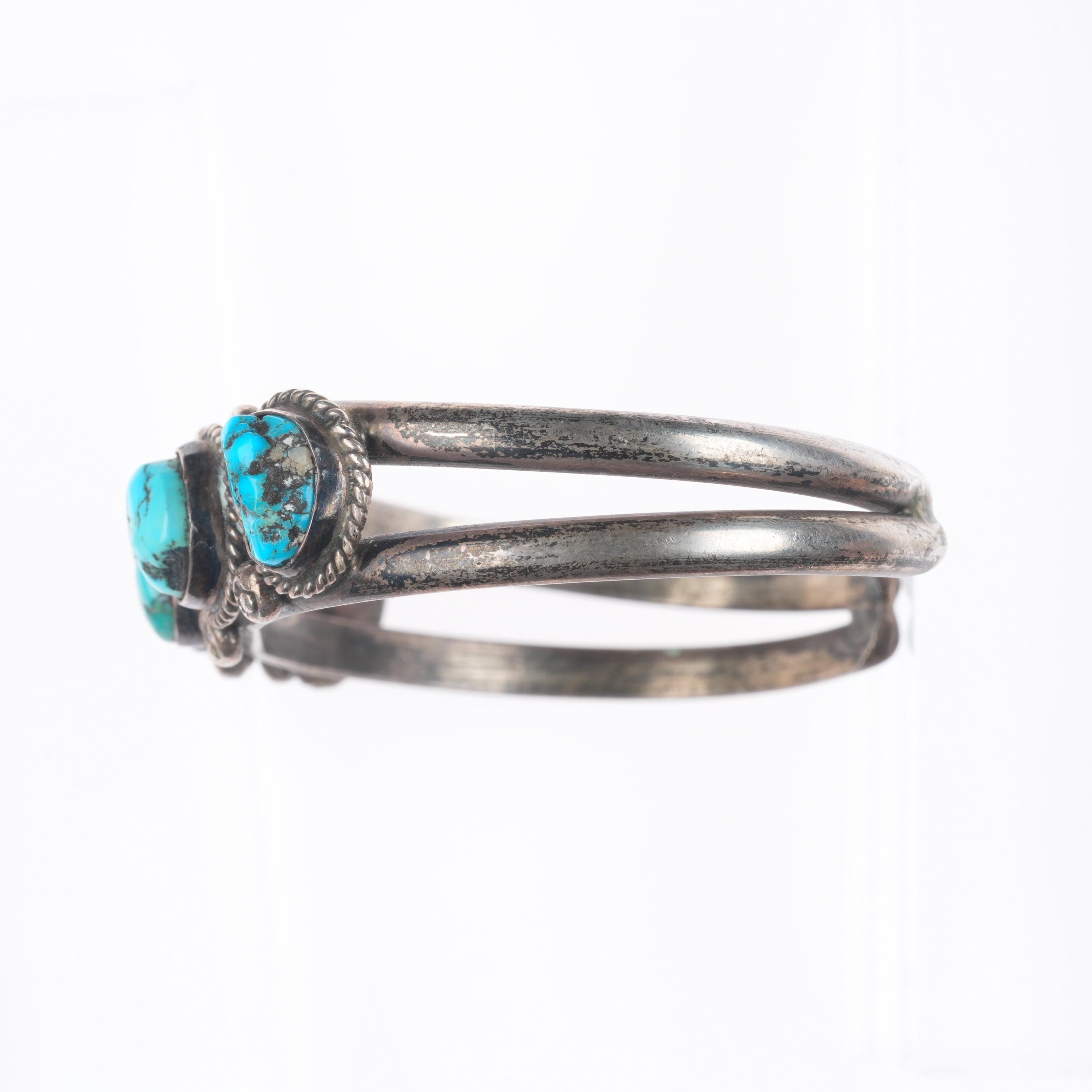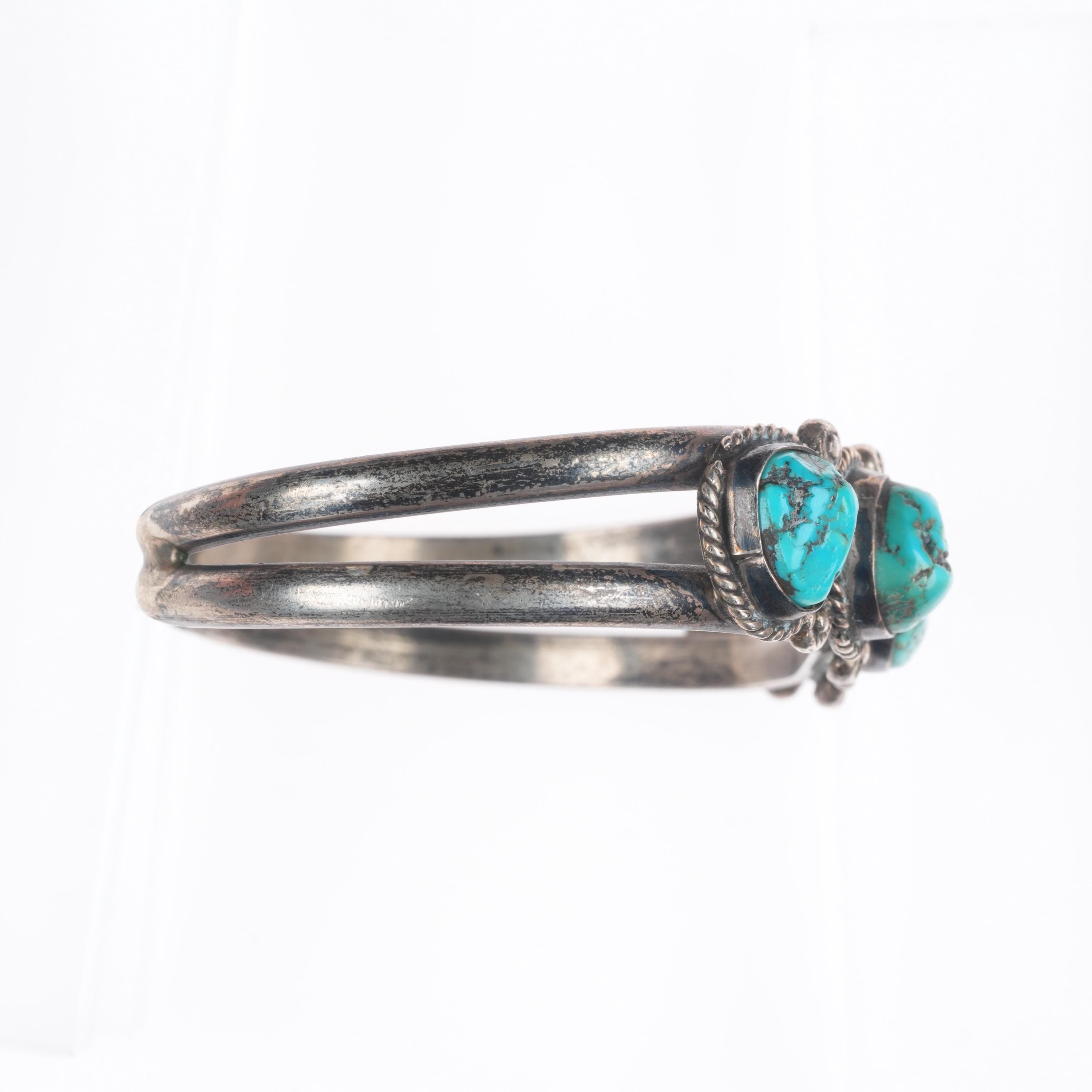 6.3" Vintage Navajo sterling silver rope bezel turquoise row cuff bracelet. Tested and guaranteed solid sterling silver, with weight and measurements in pictures, circa third quarter of the 20th century. While I'm happy to answer any questions or concerns, I beg you to take the time to look through all of the photos as they should answer them. There should be around 10 photos. If no marking is mentioned or photographed please assume that it's unmarked as is common with Native American jewelry of this era.