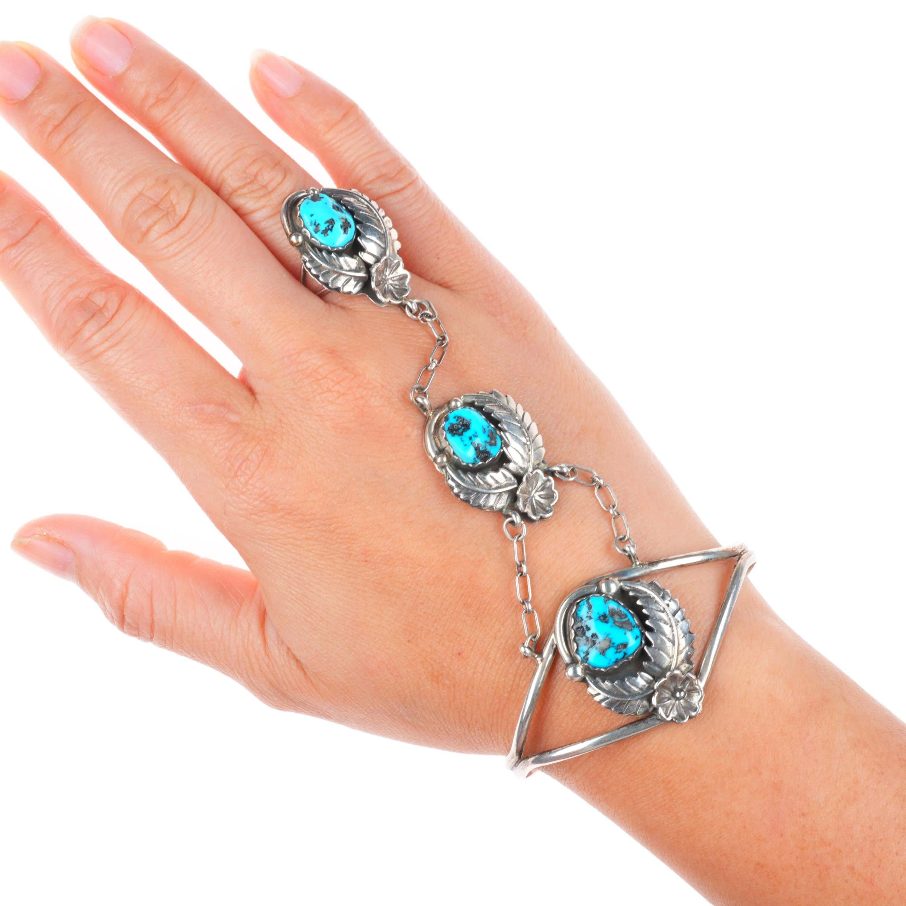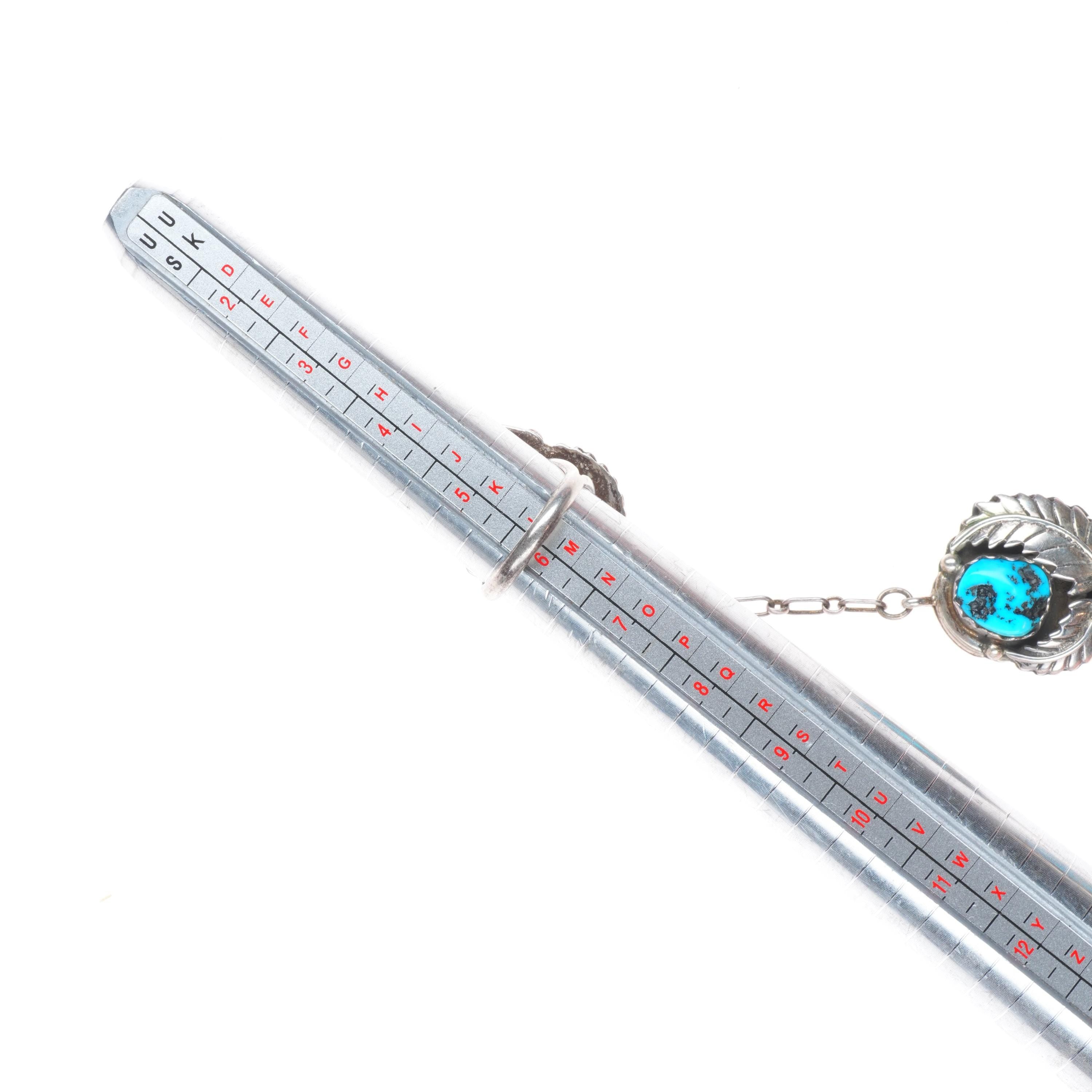 6.4" cuff bracelet sz6 Ring Navajo sterling/turquoise slave bracelet set. Tested and guaranteed solid sterling silver, with weight and measurements in pictures, circa last quarter of the 20th century. While I'm happy to answer any questions or concerns, I beg you to take the time to look through all of the photos as they should answer them. There should be around 10 photos. If no marking is mentioned or photographed please assume that it's unmarked as is common with Native American jewelry of this era.