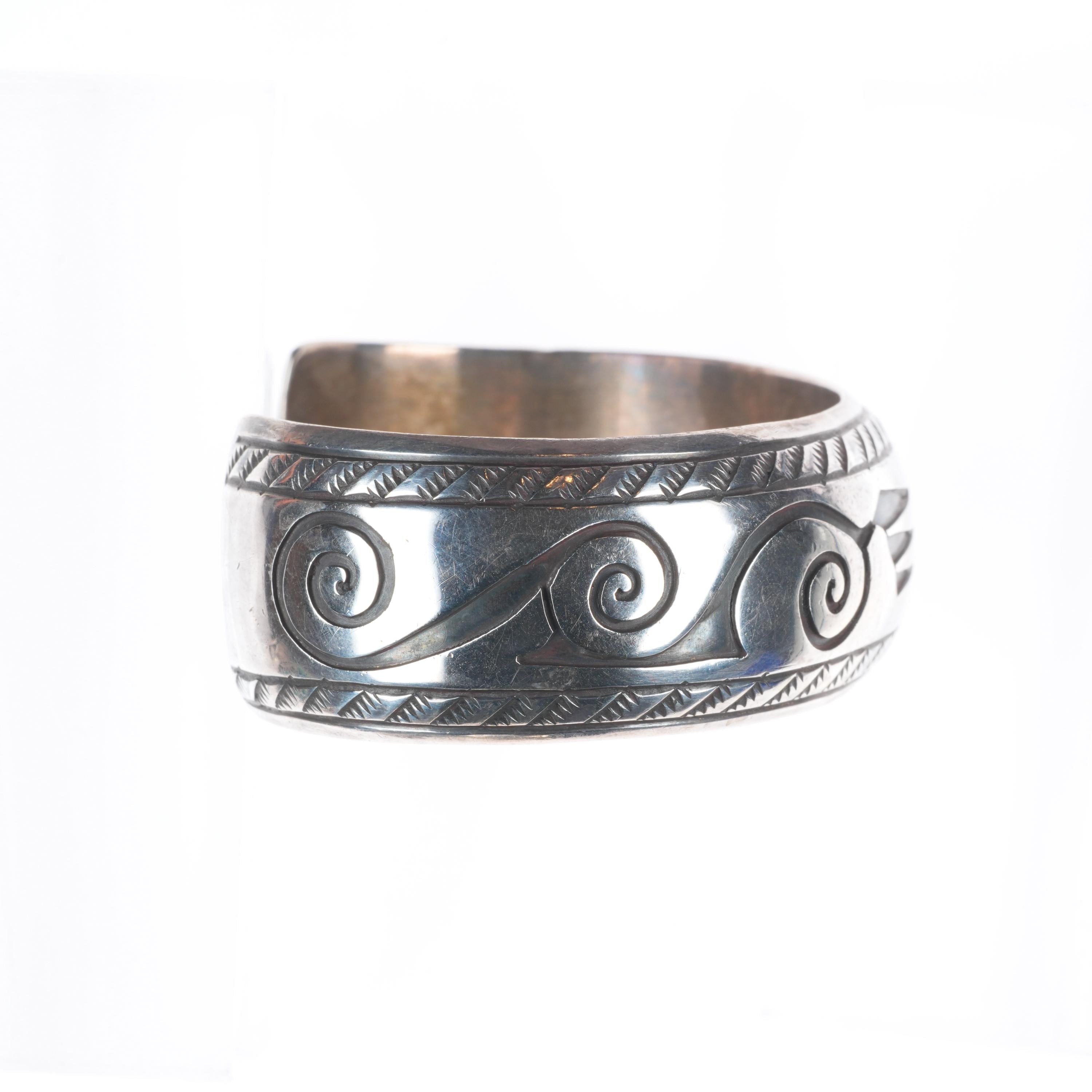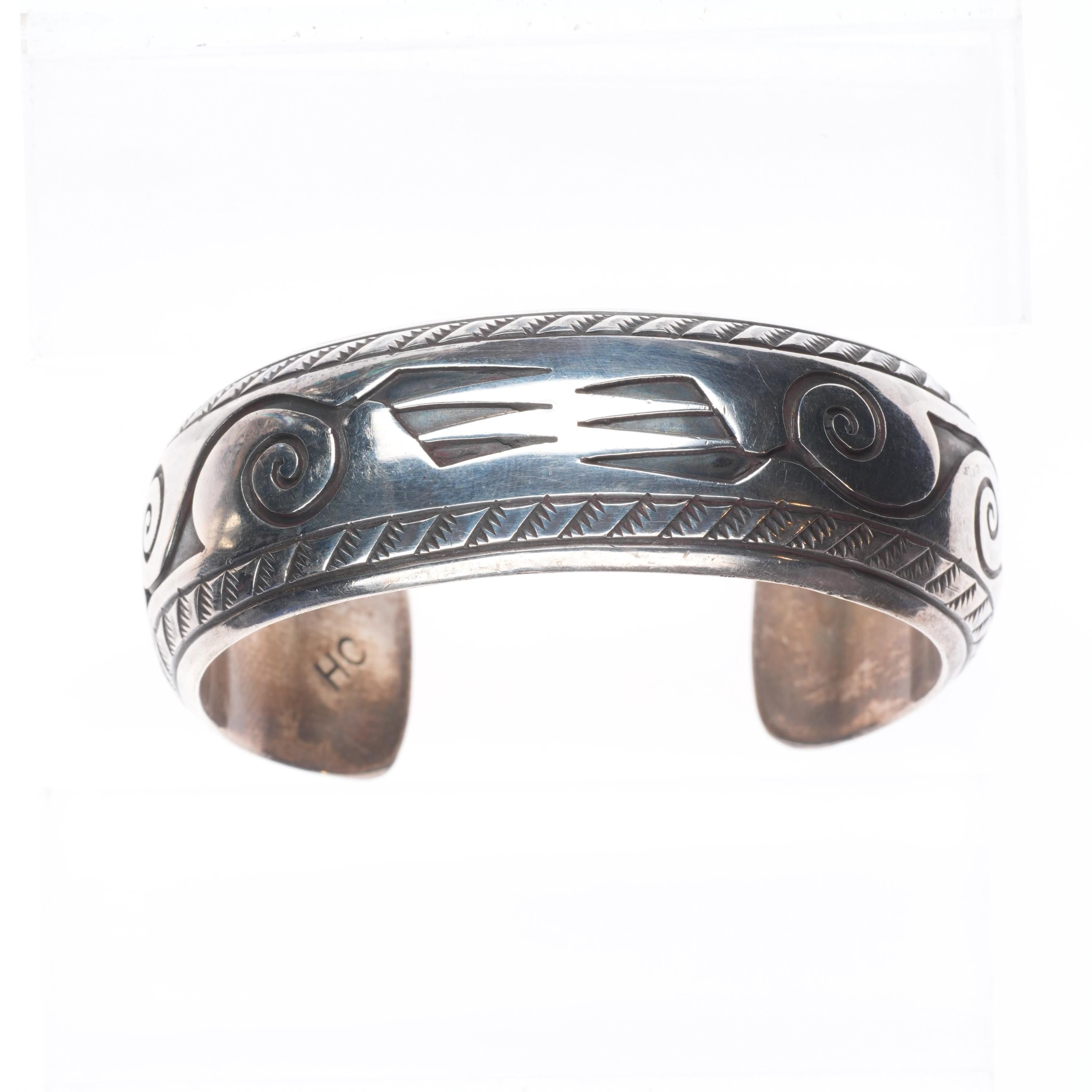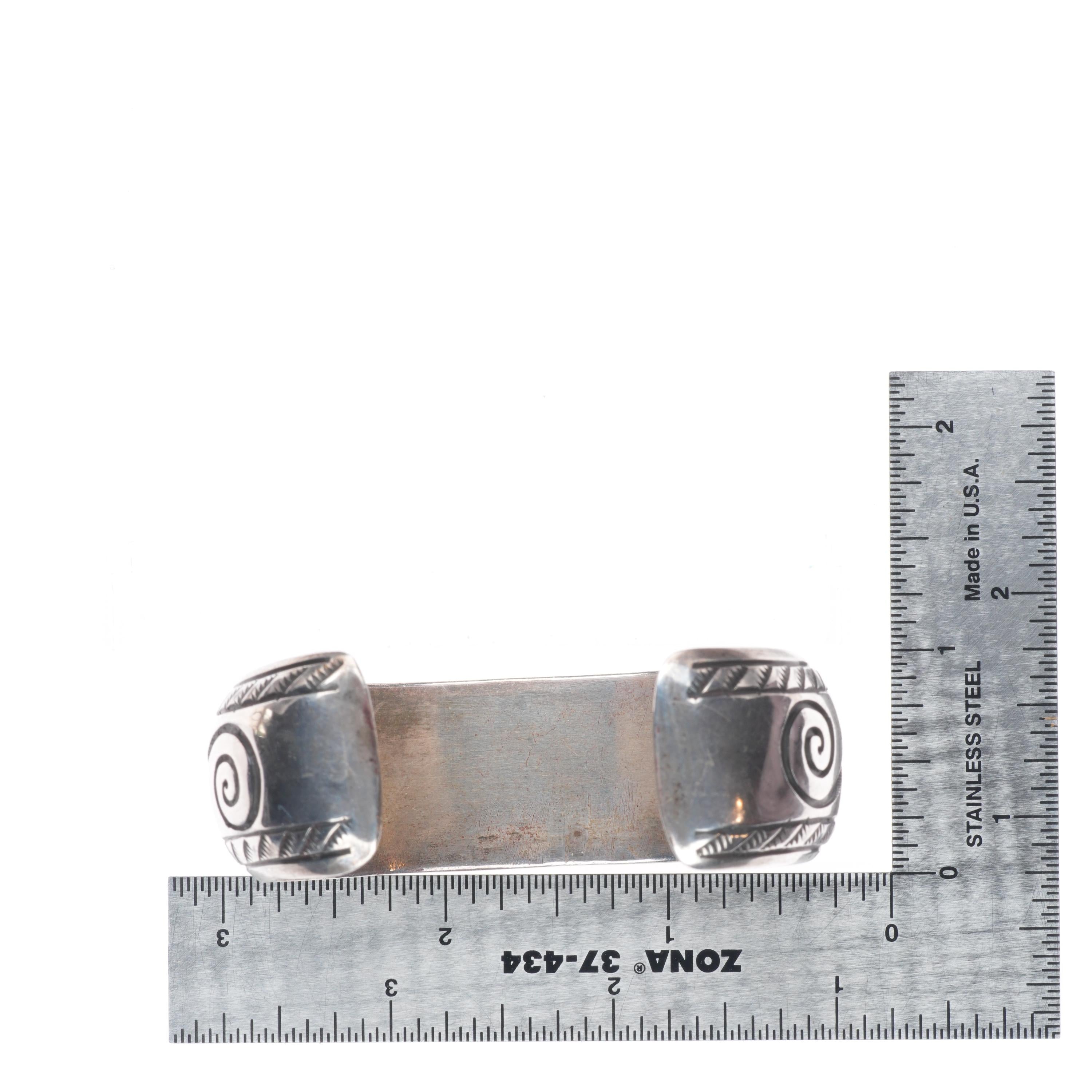 6.4"Herbert Cayatineto Navajo sterling silver hand stamped/overlay cuff bracelet. Tested and guaranteed solid sterling silver with weight and measurements in pictures. Great condition with age appropriate wear, circa third quarter of the 20th century.