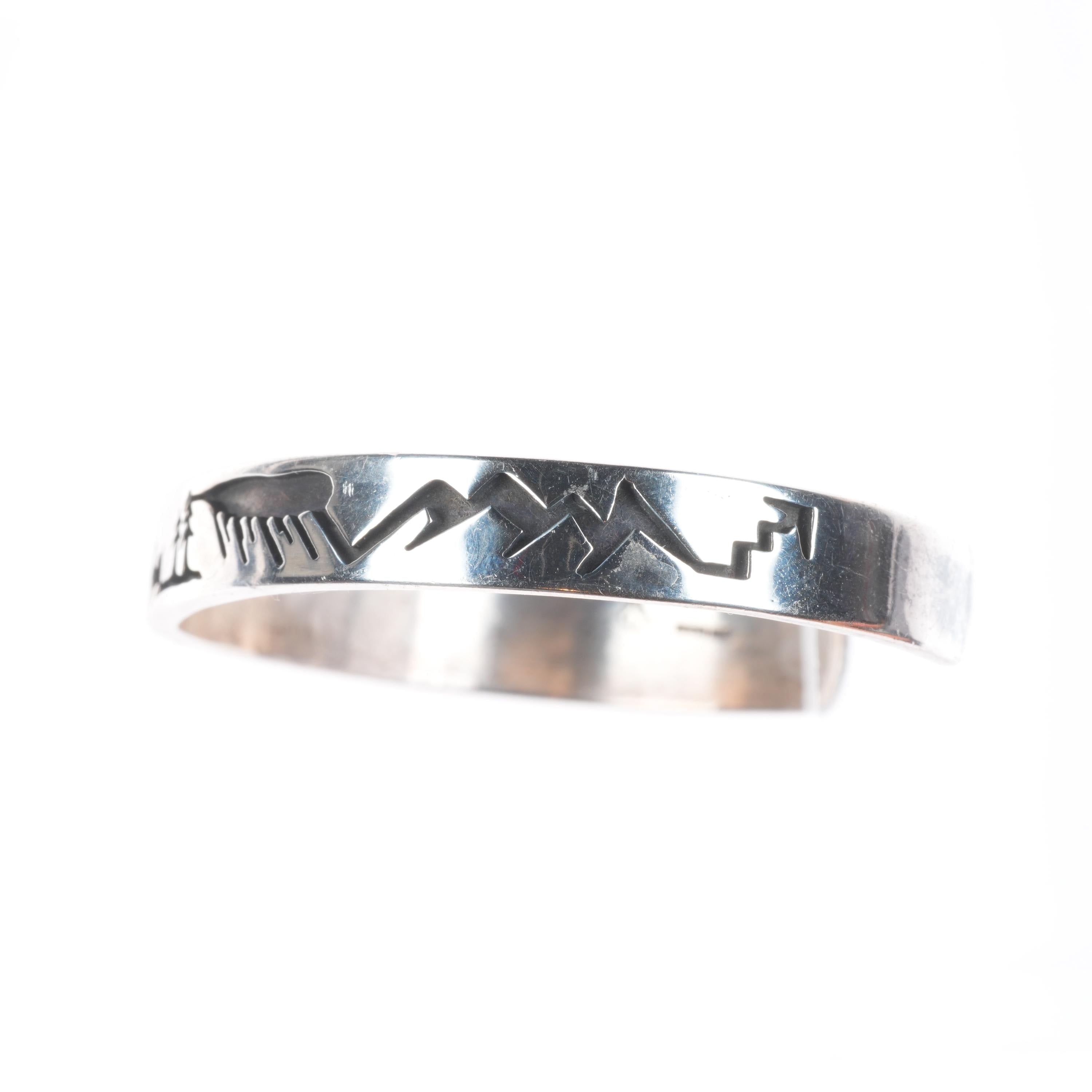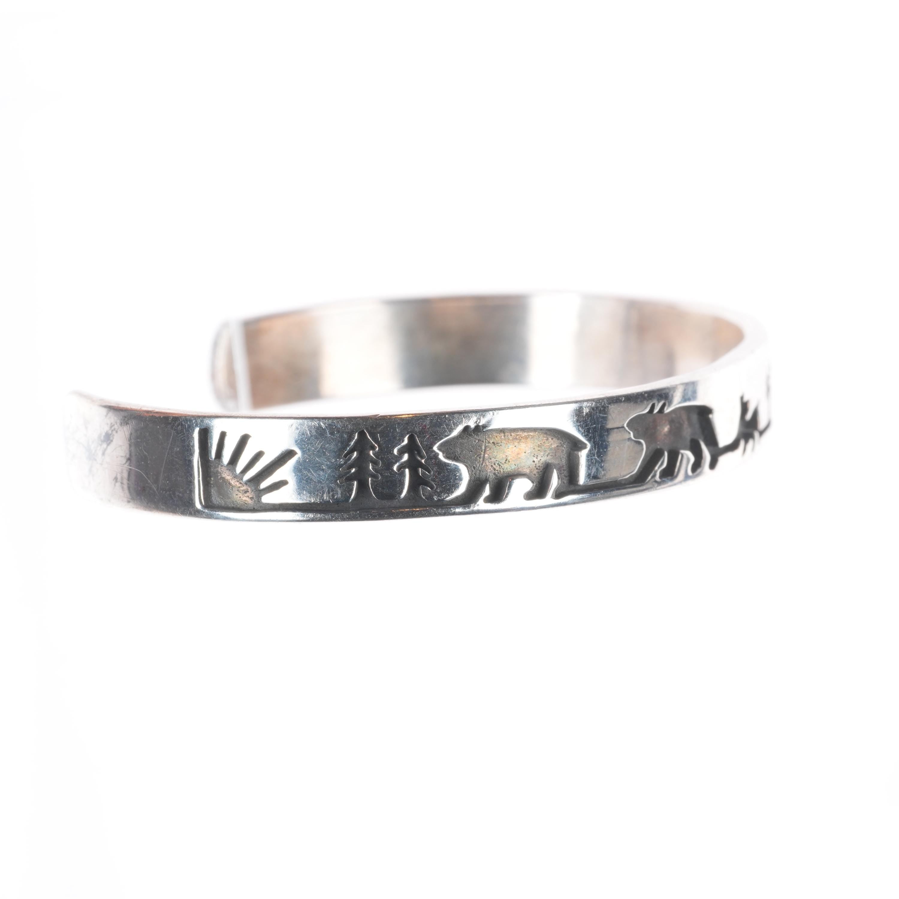 6.4" Vintage Native American sterling silver storyteller cuff bracelet. Tested and guaranteed solid sterling silver with weight and measurements in pictures. Great condition with age appropriate wear, circa last quarter of the 20th century. Unknown picto-hallmark.