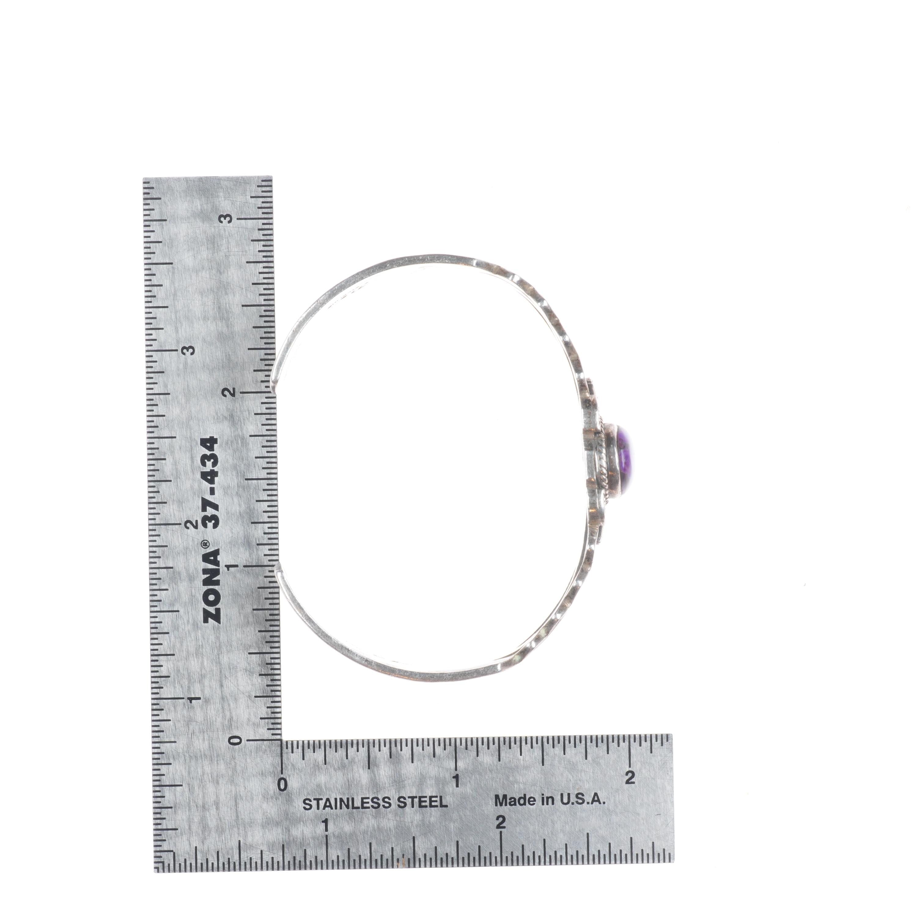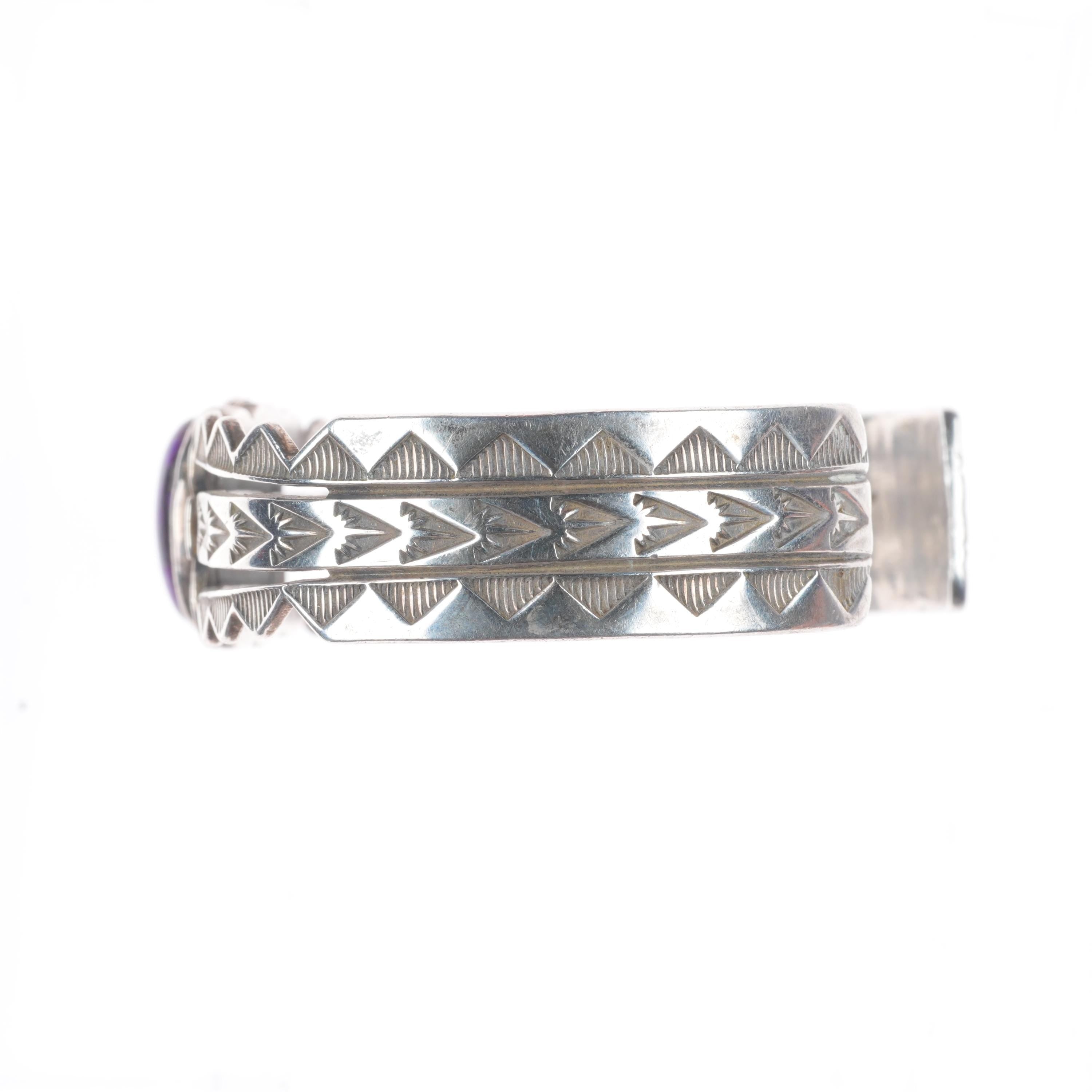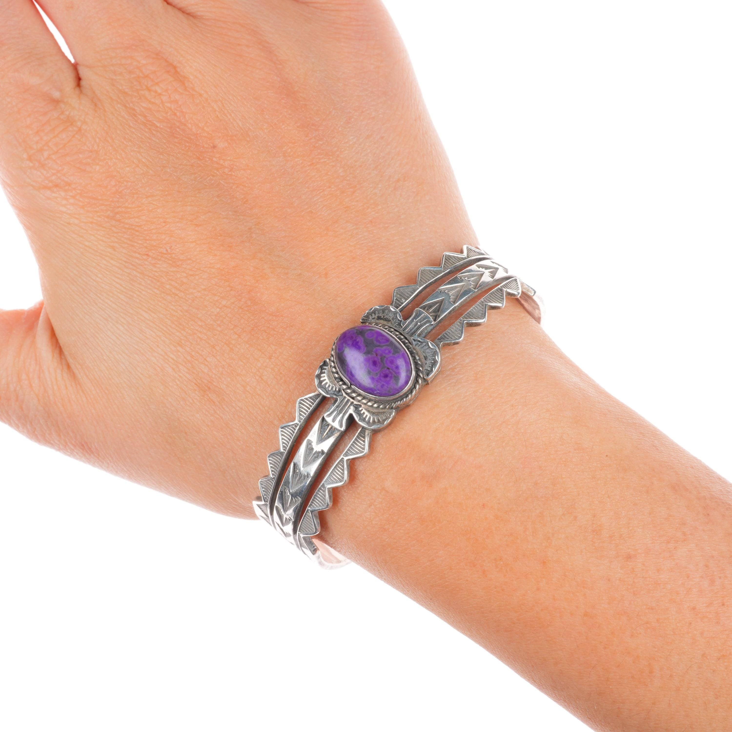 6.4" Vintage Navajo sterling silver sugilite deep stamped cuff bracelet. Tested and guaranteed solid sterling silver with weight and measurements in pictures. Great condition with age appropriate wear, circa last quarter of the 20th century. Illegible artists mark with shop mark, scale pic is wrong, approximately 25-30 grams.
